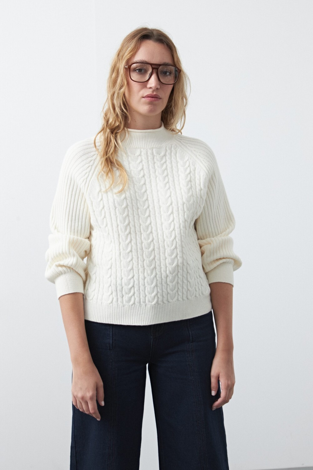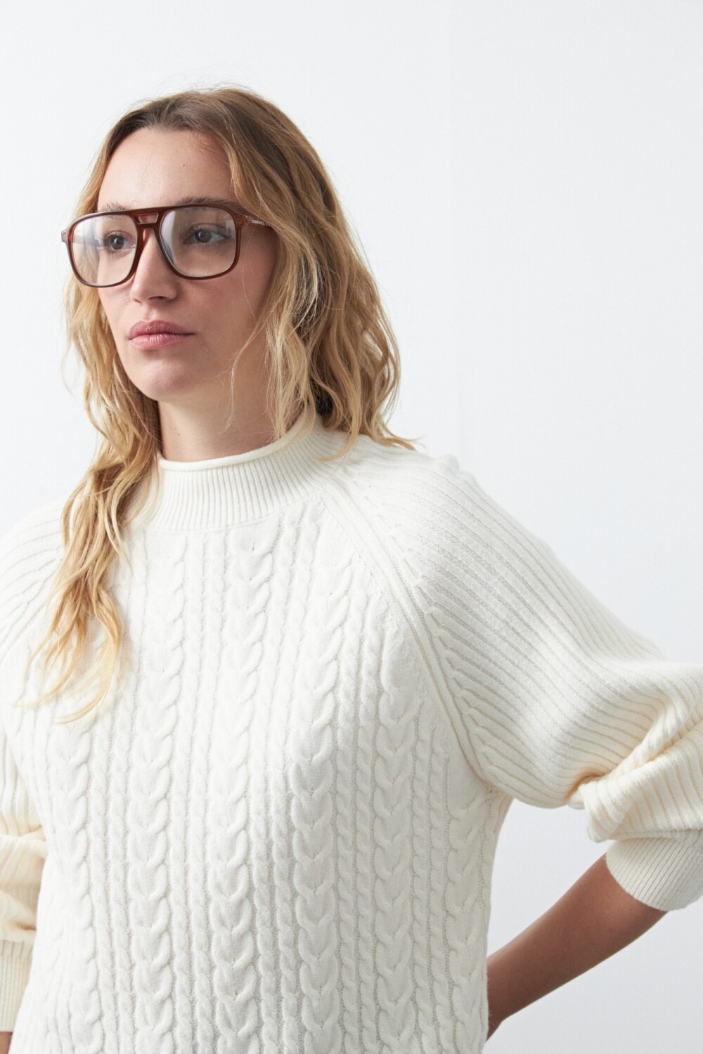 Polera tramada de manga larga, con tejido trabajado que combina trenzas y canales verticales, aportando textura y profundidad al diseño. Su cuello alto y las mangas raglán refuerzan una silueta cómoda y contemporánea, mientras que los puños y el ruedo acanalados brindan estructura al calce.