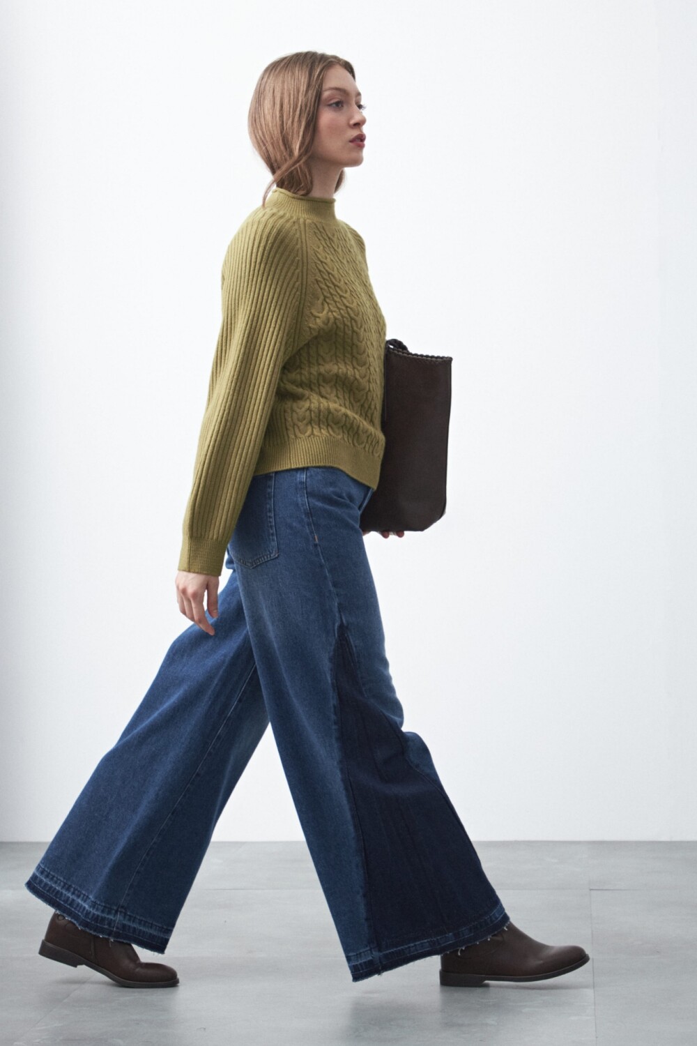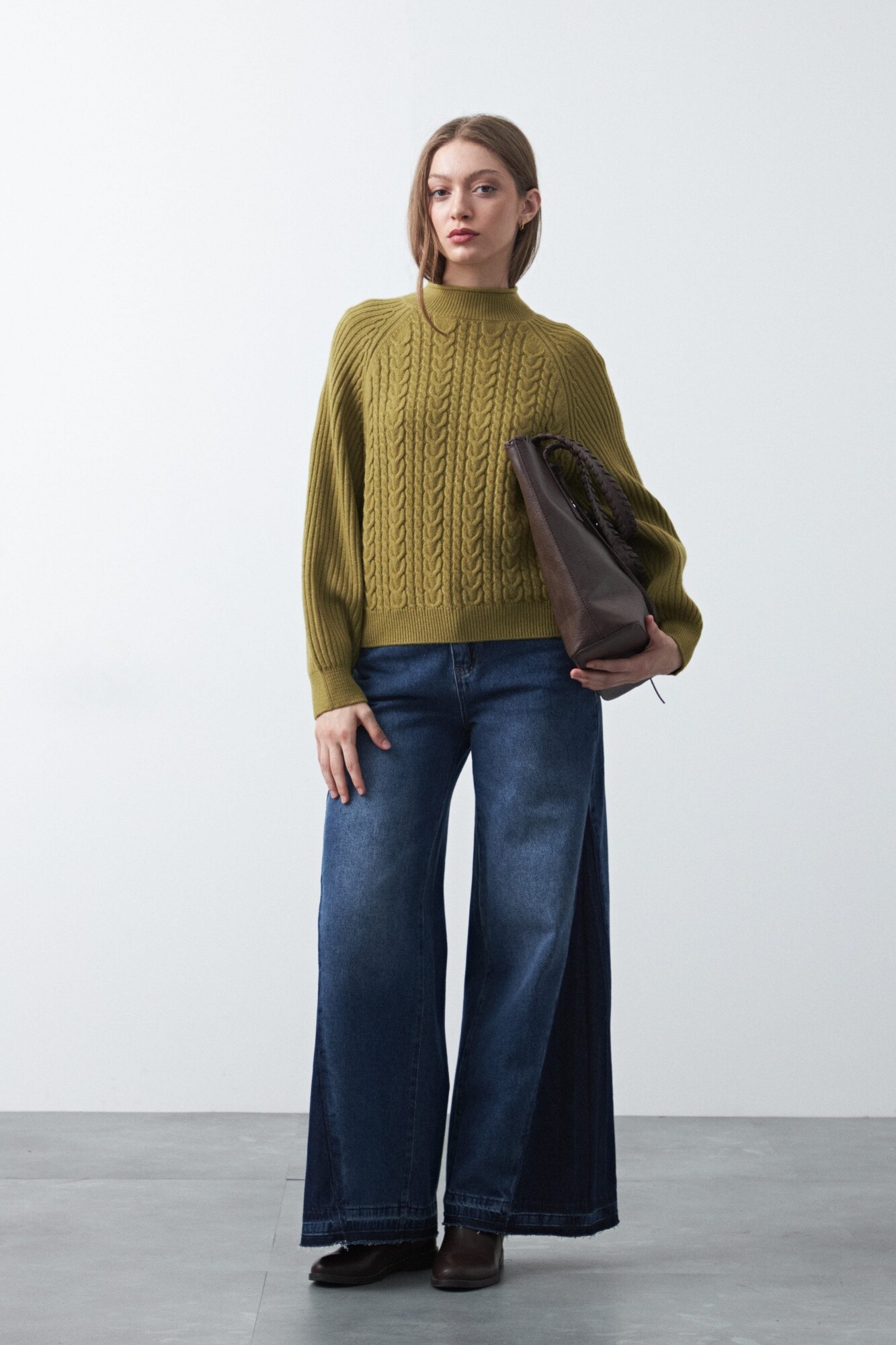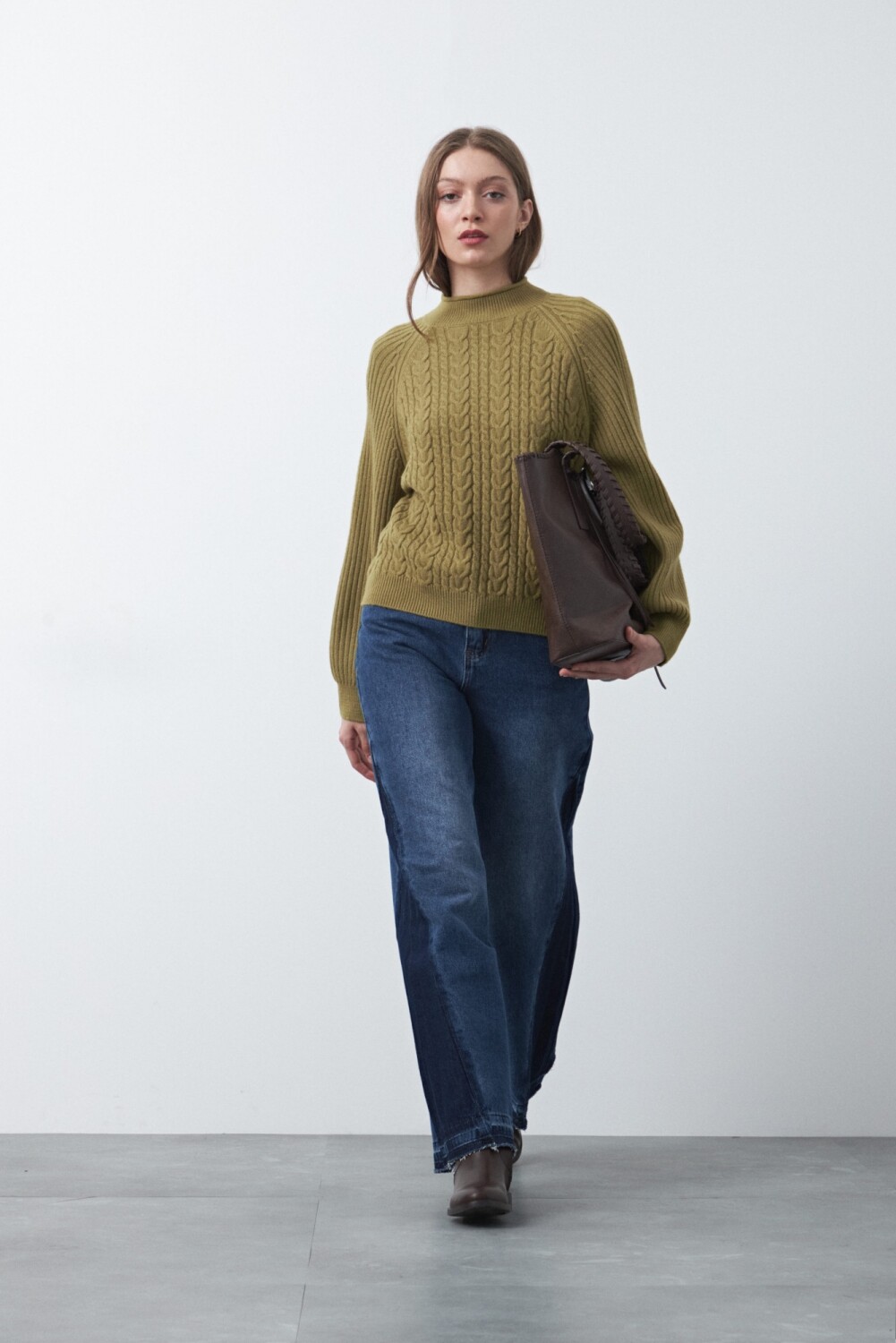 Polera tramada de manga larga, con tejido trabajado que combina trenzas y canales verticales, aportando textura y profundidad al diseño. Su cuello alto y las mangas raglán refuerzan una silueta cómoda y contemporánea, mientras que los puños y el ruedo acanalados brindan estructura al calce.