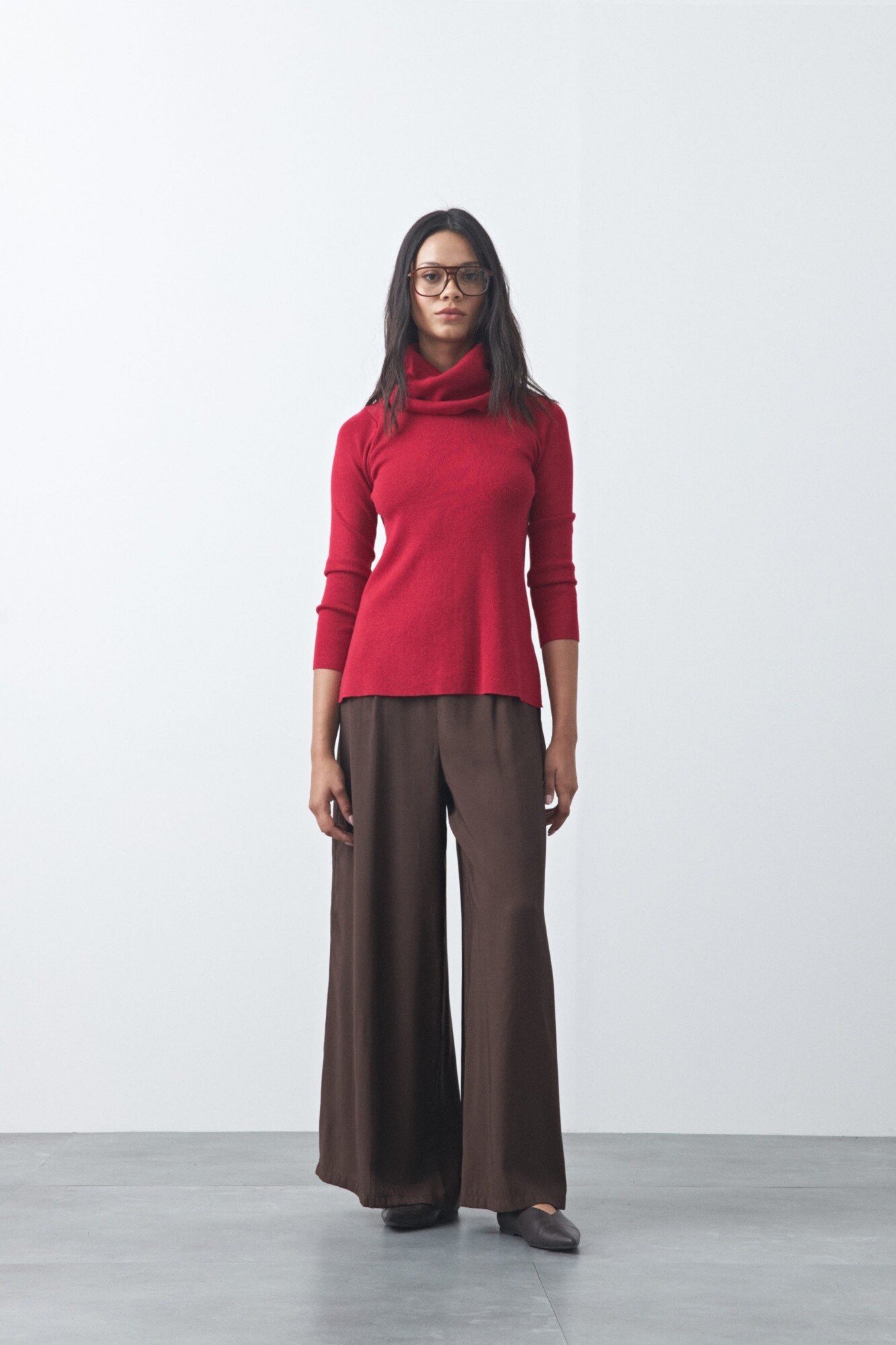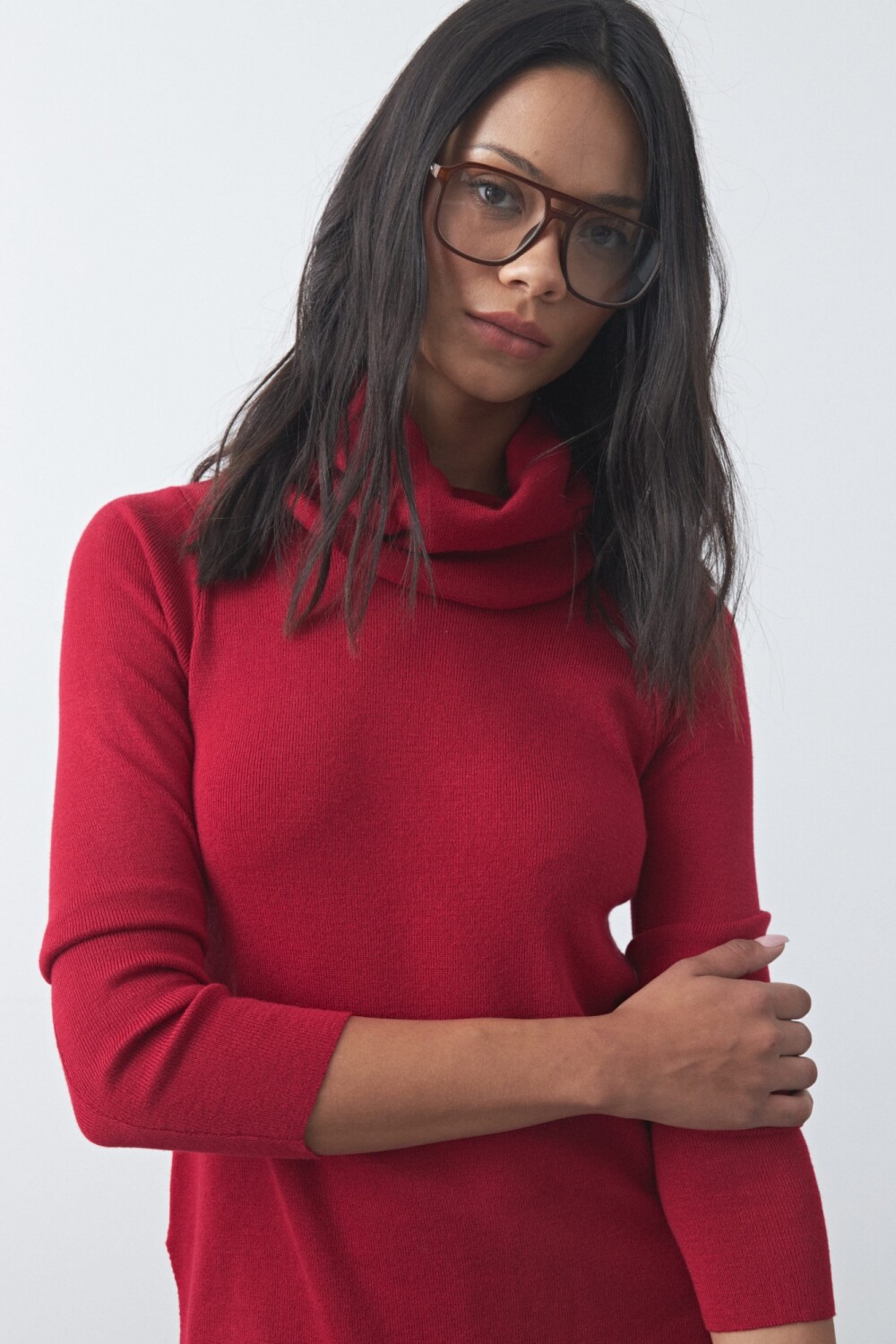 Polera de cuello extendible, manga larga y pequeñas aberturas en los laterales. Suave y elastizada.