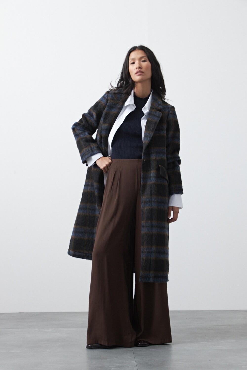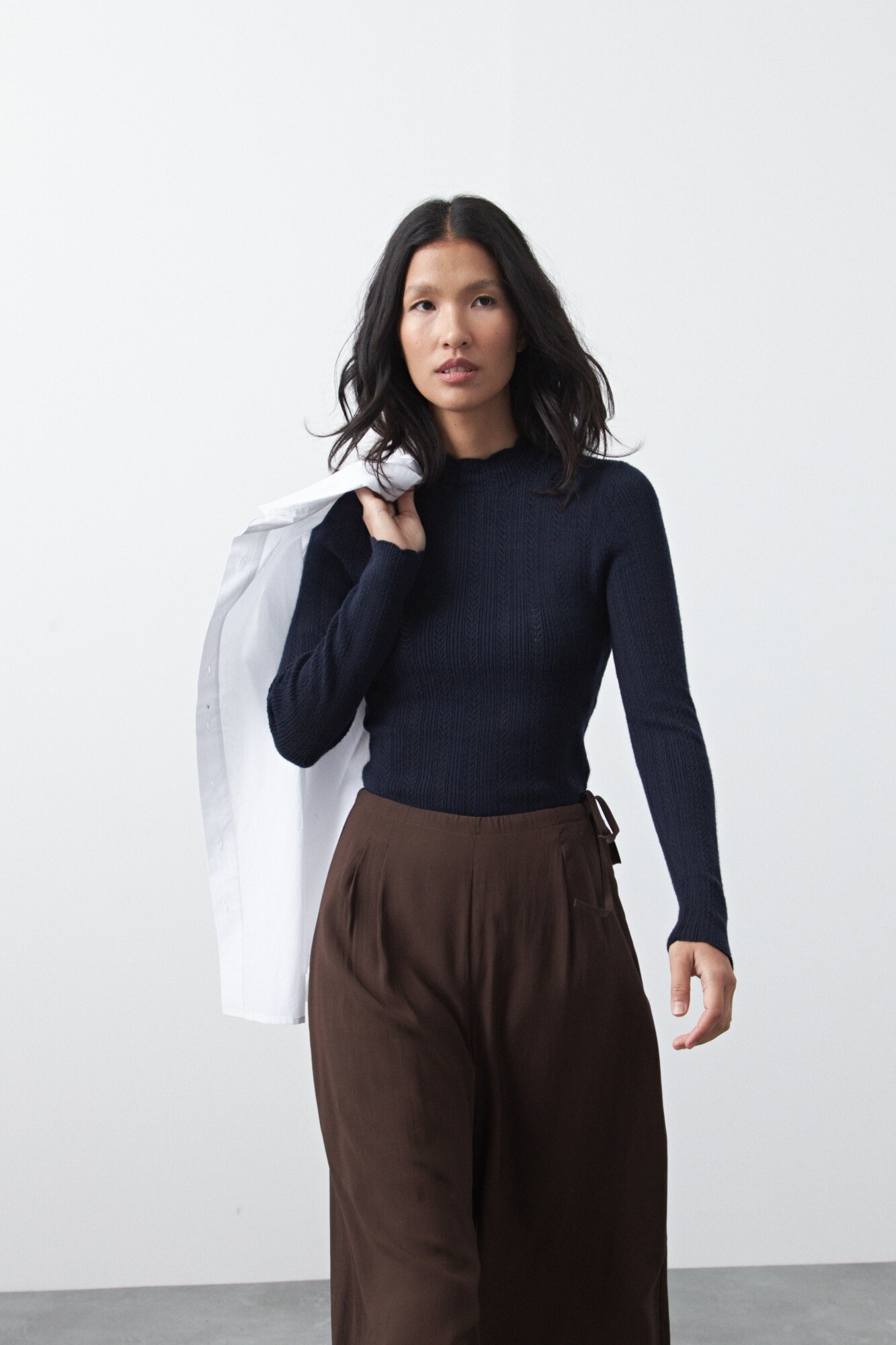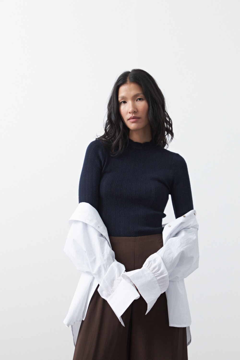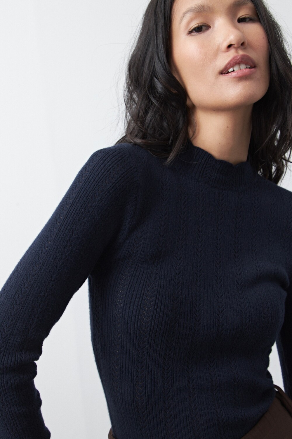 Polera tejida tramada con textura calada, de silueta entallada que acompaña el cuerpo con suavidad y elegancia. El diseño vertical combina líneas acanaladas con pequeños calados que aportan liviandad visual y un detalle sutil que la diferencia de una básica tradicional. El cuello levemente alto y los puños con terminación delicada refuerzan su impronta femenina y versátil. La mezcla de viscosa con nylon garantiza una mano suave, elasticidad confortable y excelente caída, ideal para usar sola o como primera capa bajo abrigos y blazers. Una pieza atemporal, en tendencia, que equilibra sofisticación y comodidad en partes iguales.