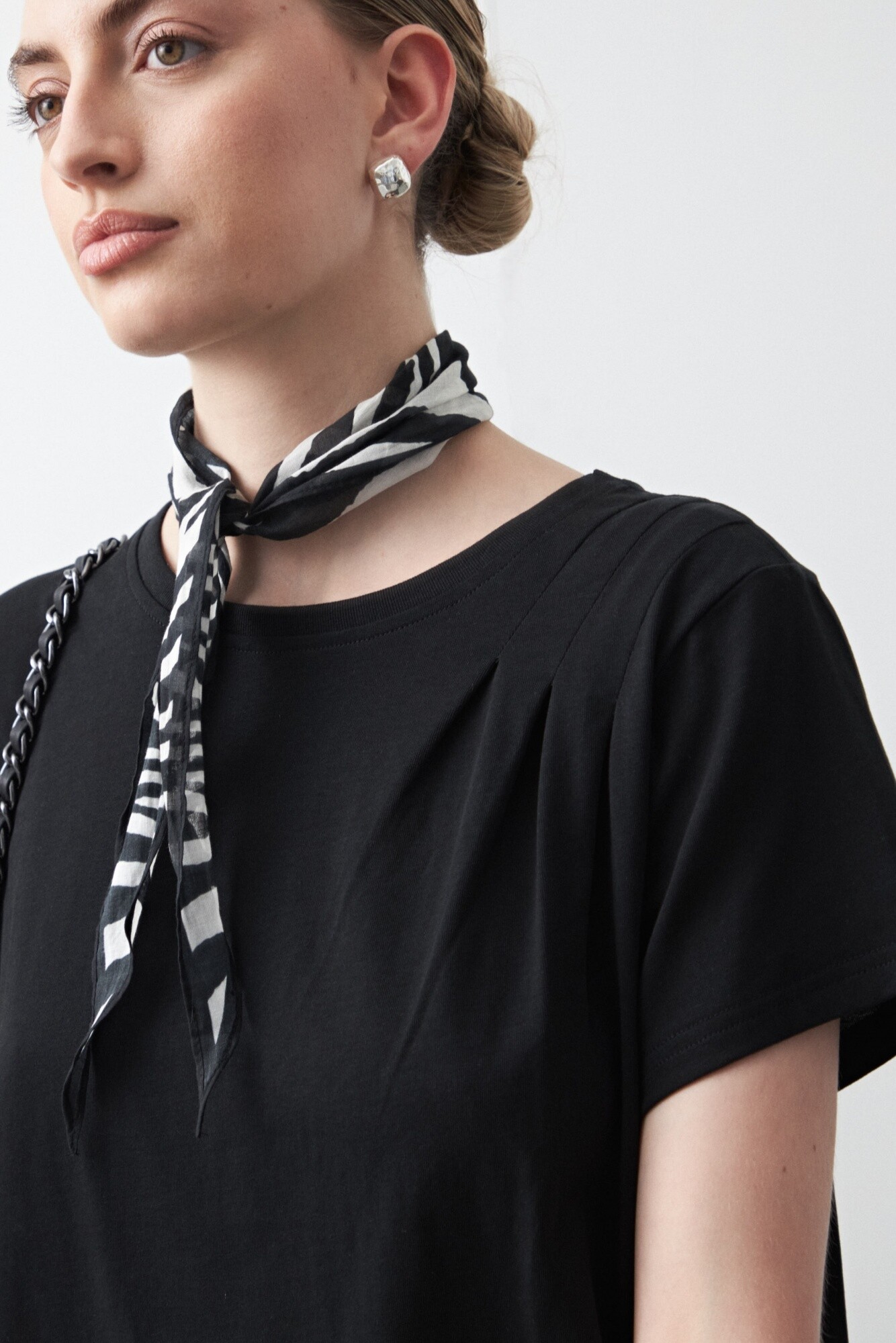 Remera básica de manga corta, un esencial del guardarropa que combina simplicidad y estilo. Su diseño de líneas limpias se realza con delicados pliegues sobre el hombro que aportan un detalle sutil y moderno. Con calce cómodo y versátil, es una prenda fácil de integrar en looks cotidianos, desde combinaciones casuales con denim hasta opciones más pulidas.
