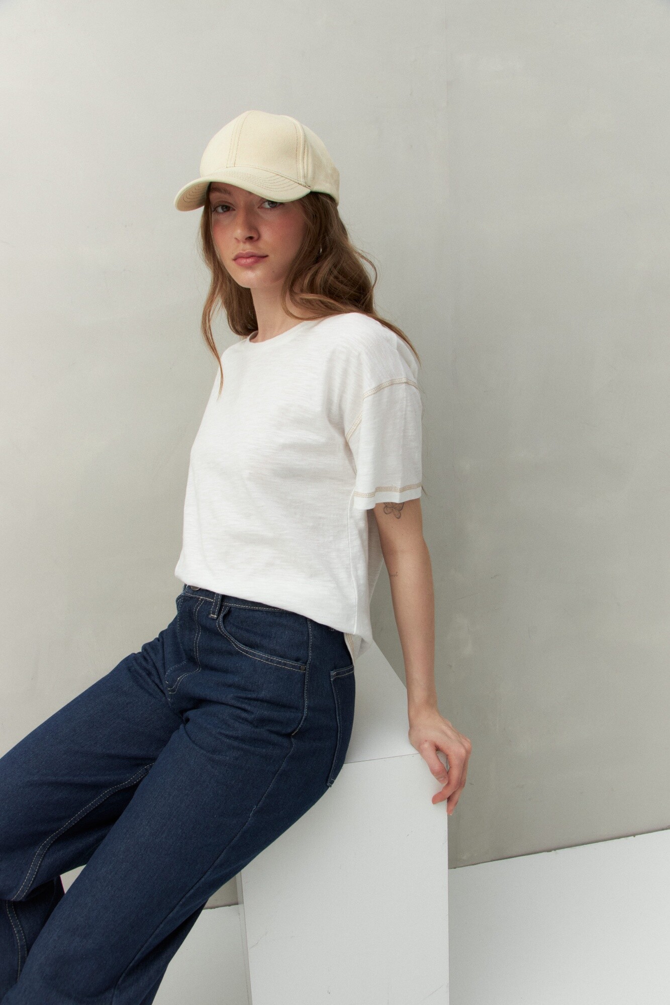 Remera de manga corta y cuello a la base confeccionada en algodón liviano. Presenta costuras a contratono visibles que enmarcan la silueta y aportan un guiño canchero al diseño. Un básico con carácter propio, ideal para sumar textura y contraste a los looks cotidianos.