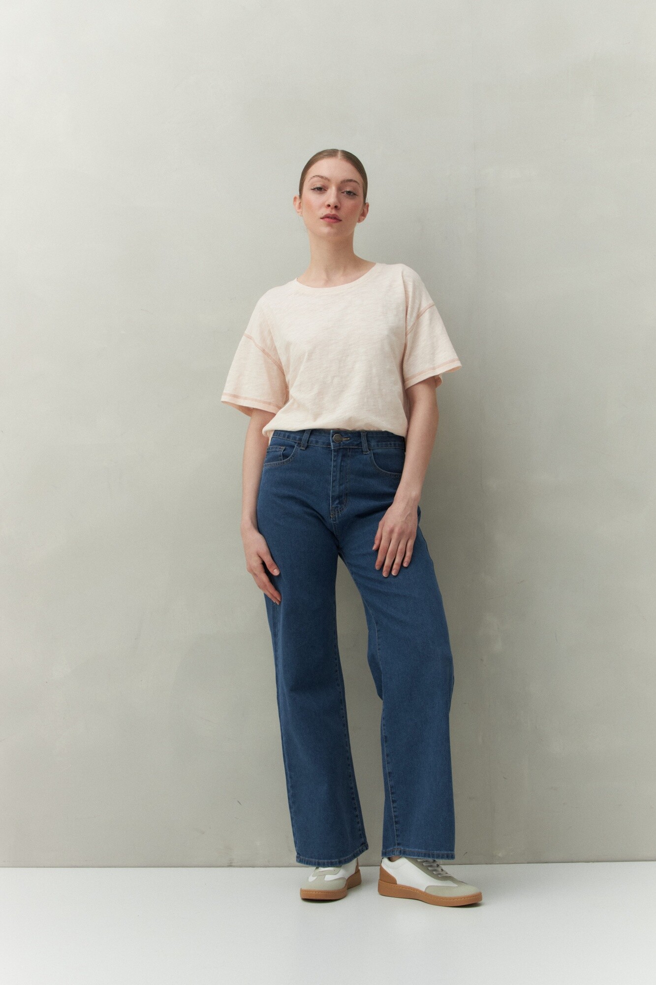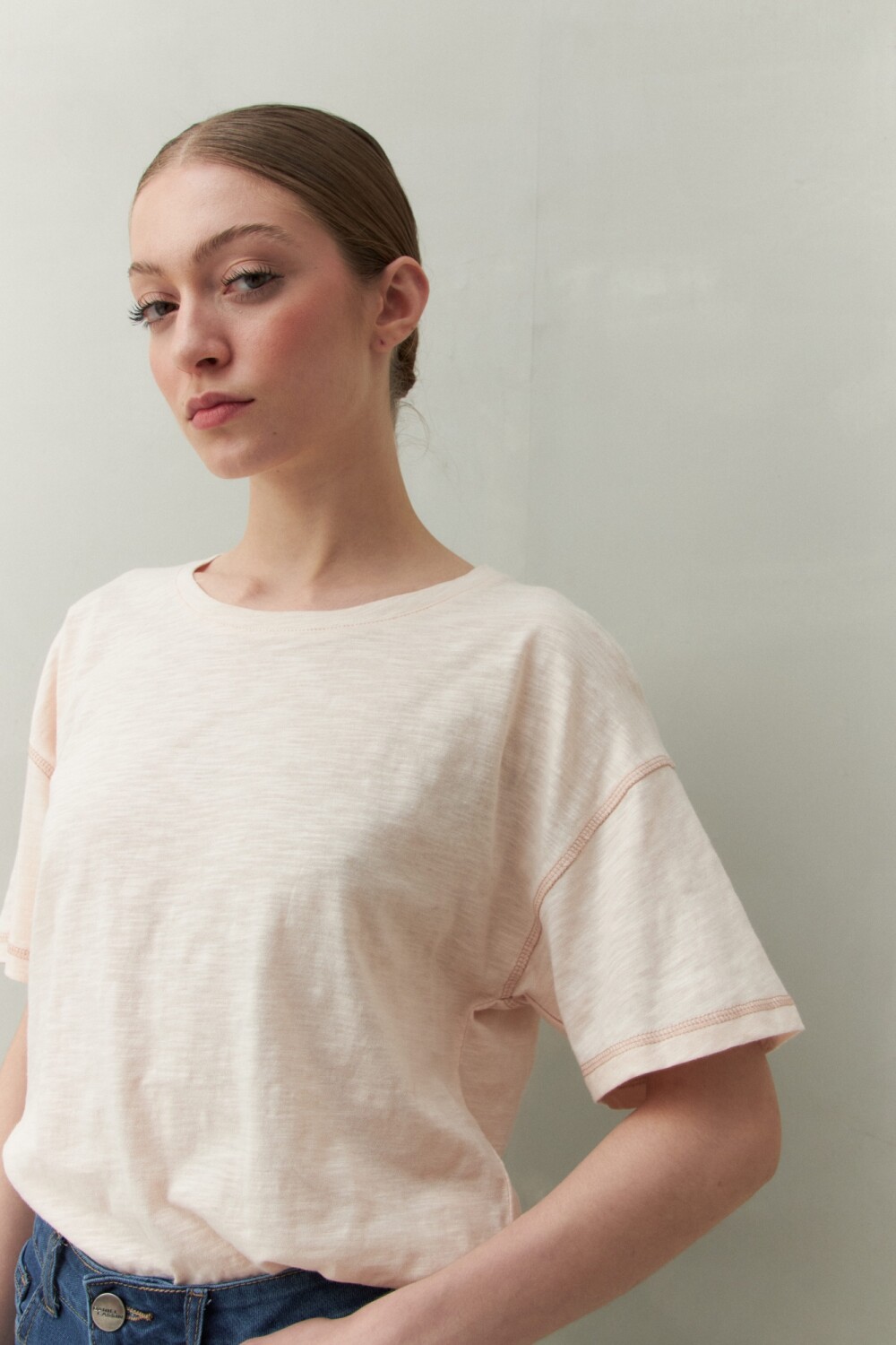 Remera de manga corta y cuello a la base confeccionada en algodón liviano. Presenta costuras a contratono visibles que enmarcan la silueta y aportan un guiño canchero al diseño. Un básico con carácter propio, ideal para sumar textura y contraste a los looks cotidianos.
