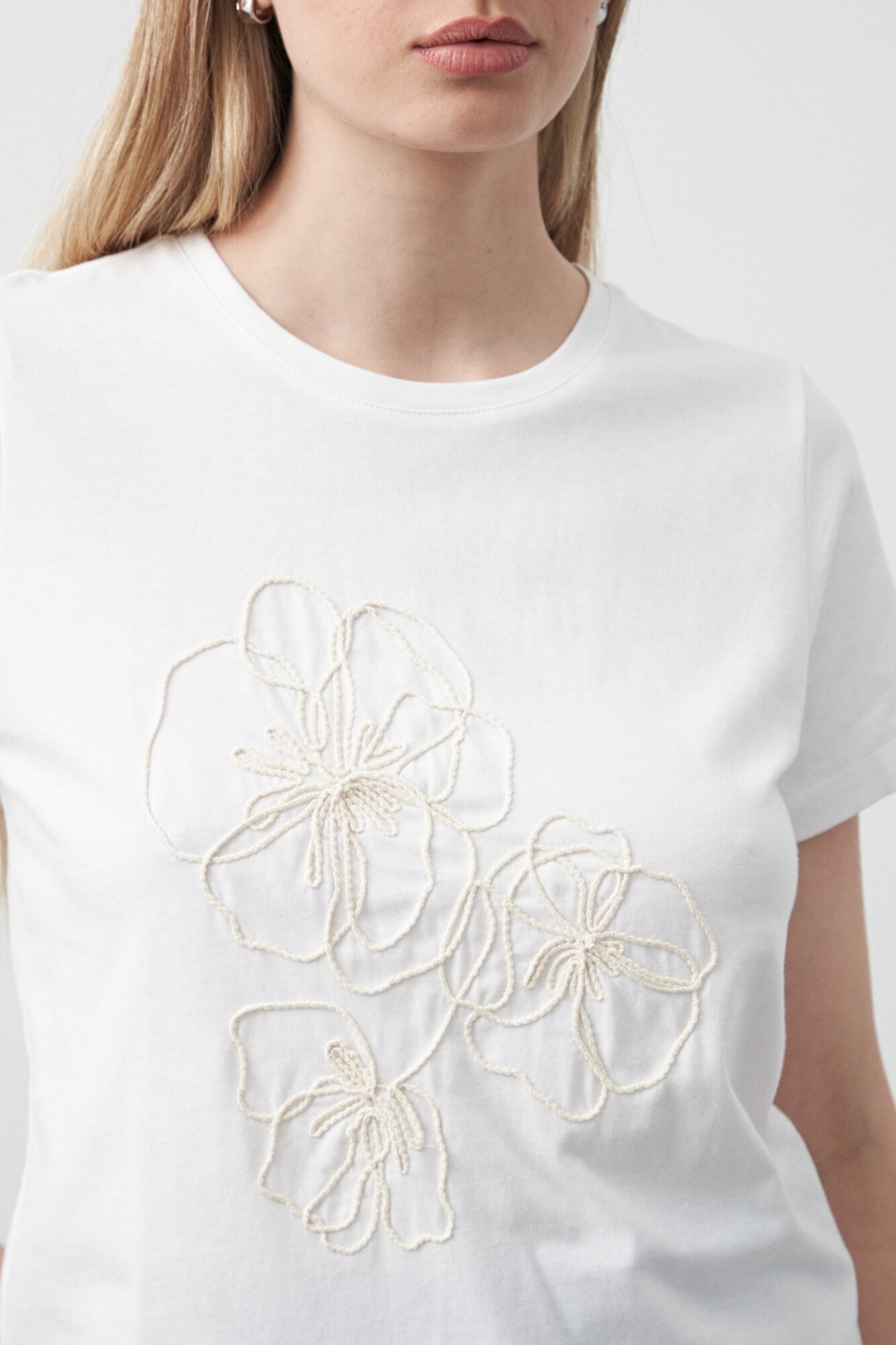 Remera de manga corta confeccionada en algodón con tacto suave y estructura liviana, ideal para el uso diario. El diseño se destaca por el bordado floral en relieve aplicado en el frente, que aporta textura y un detalle artesanal sutil, elevando un básico a una propuesta más especial. Una prenda versátil, fácil de combinar y clave para elevar cualquier look desde lo simple y delicado.