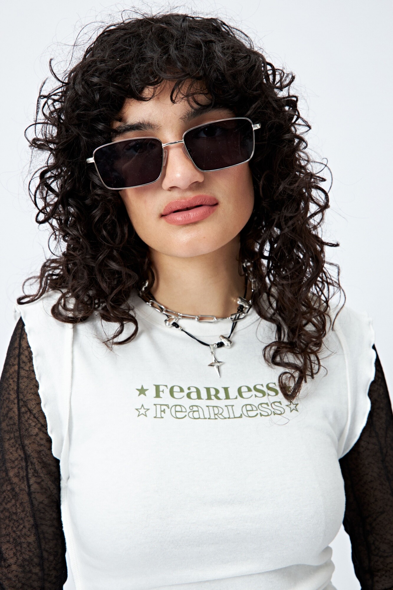 Confeccionada en un suave tejido de algodón, poliéster y elastano, esta remera combina comodidad y estilo con una silueta entallada y terminaciones con volados sutiles. La estampa frontal “Fearless” le aporta un toque audaz y trendy, ideal para sumar personalidad a cualquier look. Perfecta para usar sola o superpuesta con mangas de tul o camisas abiertas.