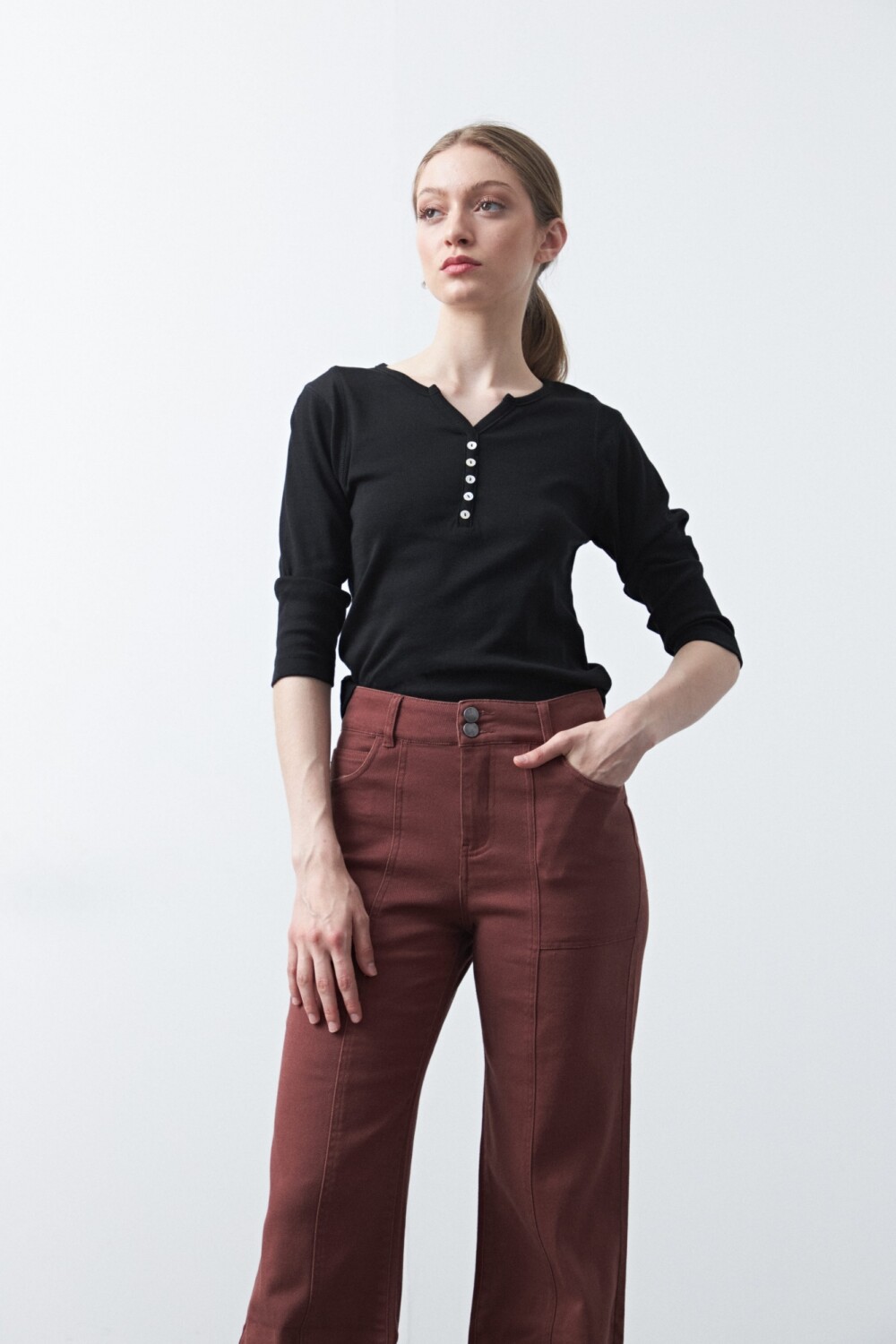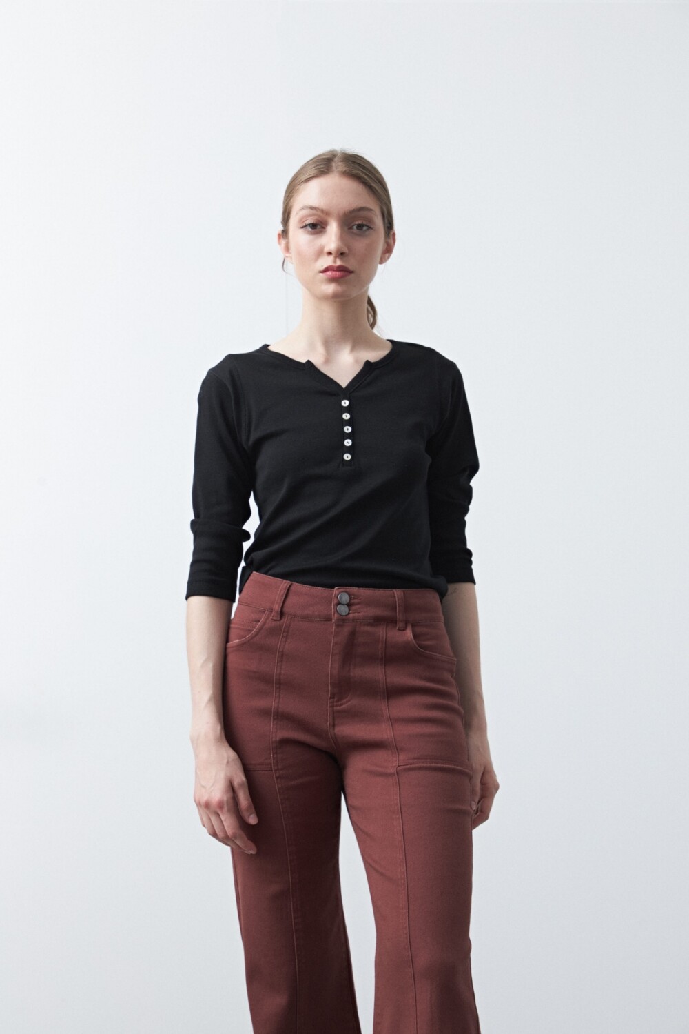 Remera de manga larga confeccionada en algodón, de calce clásico y silueta limpia, pensada como un básico infaltable de guardarropa. Presenta escote con abertura y cartera corta de botones que suma un detalle sutil y funcional, manteniendo una estética minimal y atemporal. Ideal para usar sola o como base de looks urbanos y de oficina relajada, es una pieza versátil que acompaña distintas temporadas.