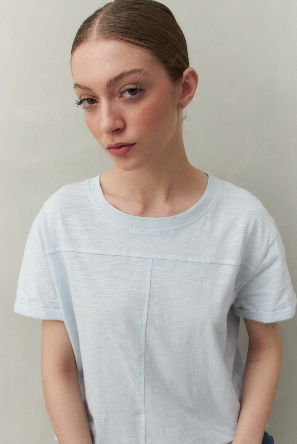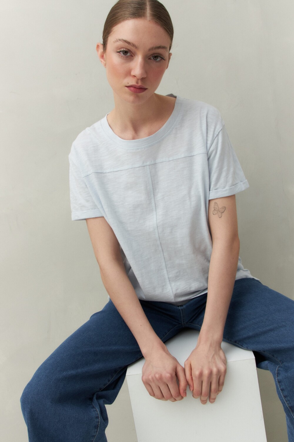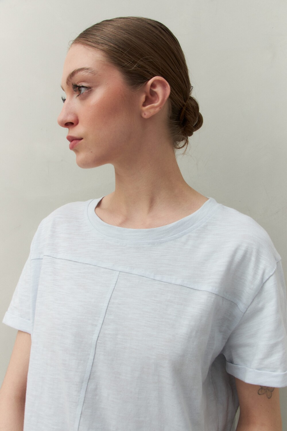 Remera básica de manga corta confeccionada en algodón liviano con textura levemente jaspeada. Presenta tajos laterales y costura central al frente, aportando un toque de diseño a un clásico del guardarropa. Ideal para acompañar looks casuales con un aire relajado y actual.