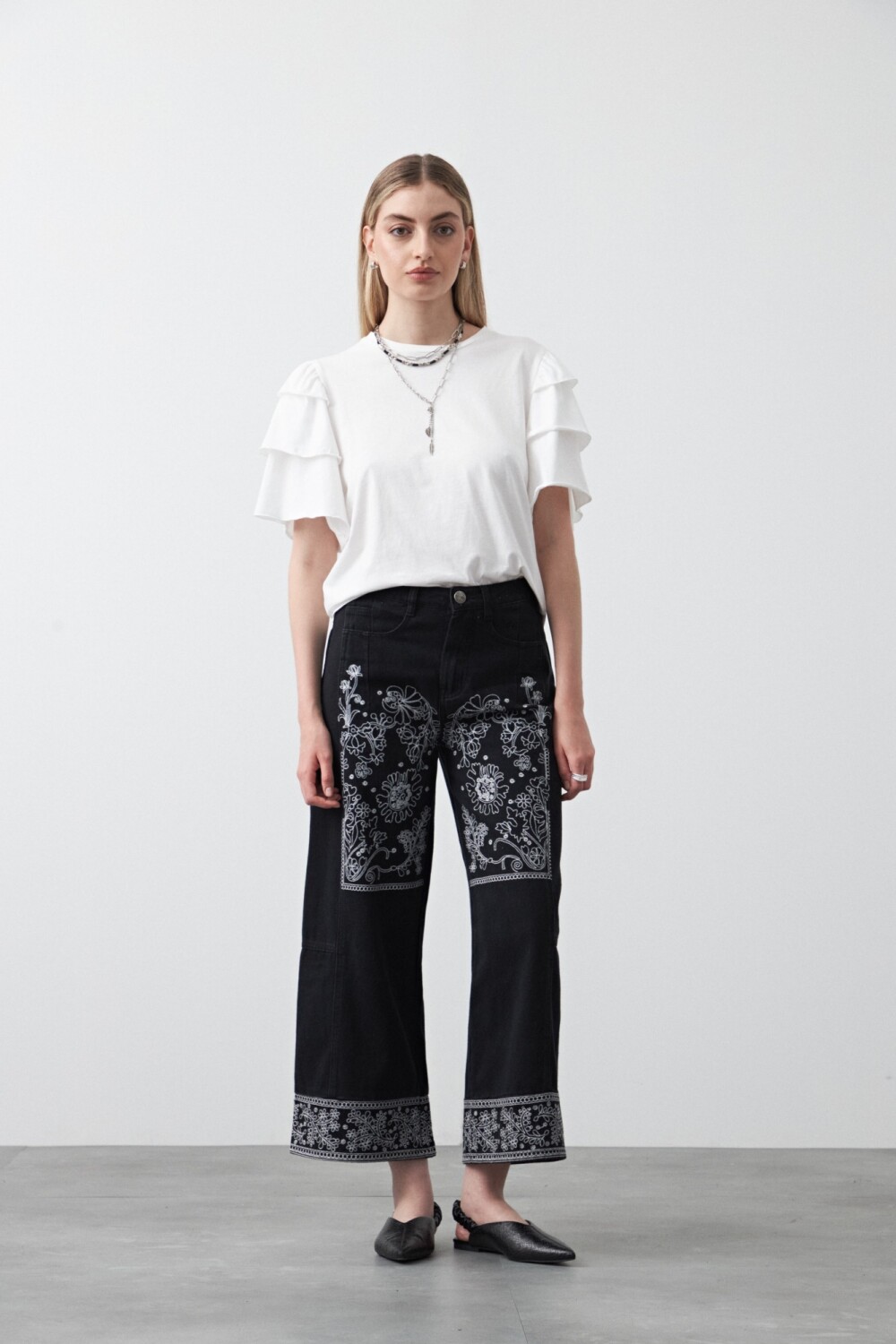 Remera de manga corta confeccionada en algodón de tacto suave y caída liviana, ideal para acompañar looks cómodos con un plus de diseño. El modelo se destaca por las mangas con volados en capas, que aportan movimiento y un detalle femenino sin perder versatilidad. Una silueta equilibrada que funciona tanto para el día como para propuestas más arregladas, clave para elevar cualquier look desde lo sutil.