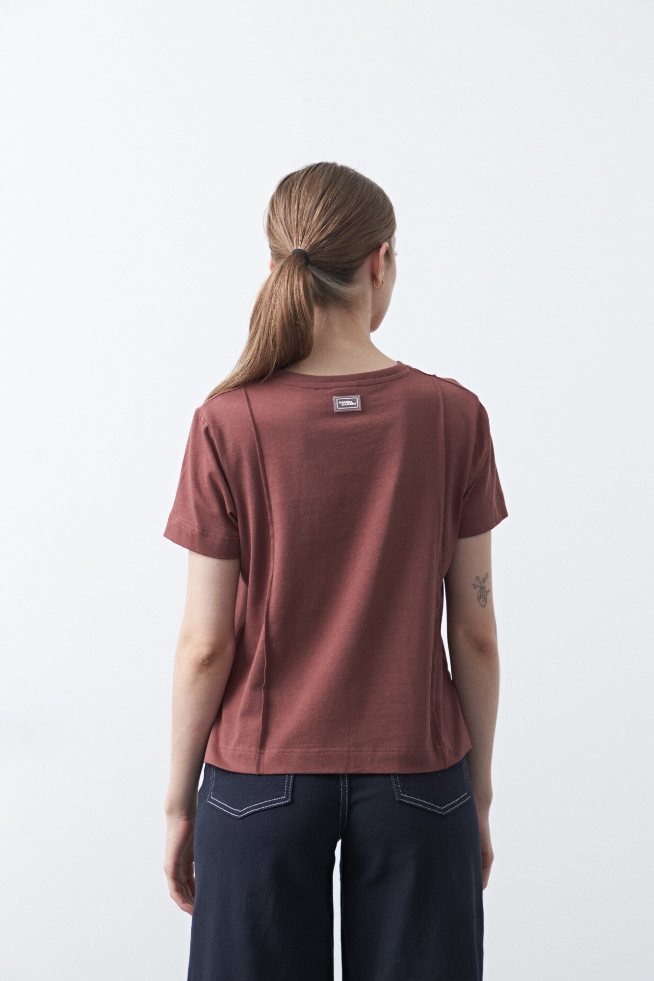 Remera de algodón de manga corta, cuello a la base y pequeñas aberturas en los laterales.