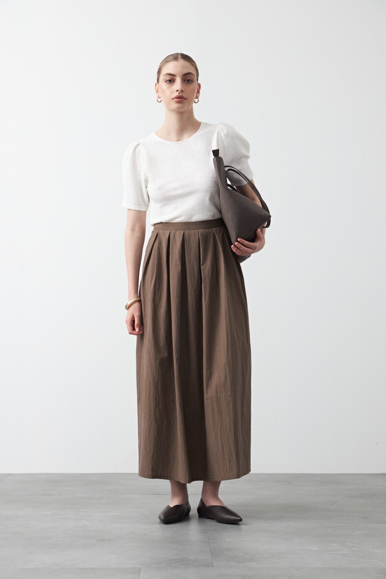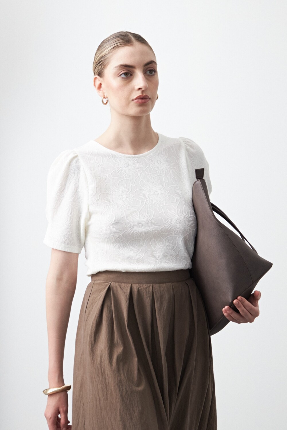Remera de manga corta con textura floral en relieve y diseño de inspiración romántica. La superficie trabajada aporta profundidad visual y un diferencial sutil, mientras que las mangas abullonadas suman estructura y equilibrio.