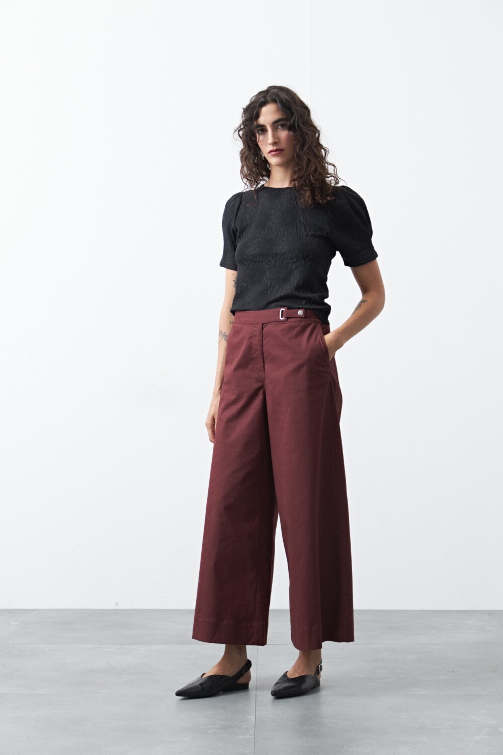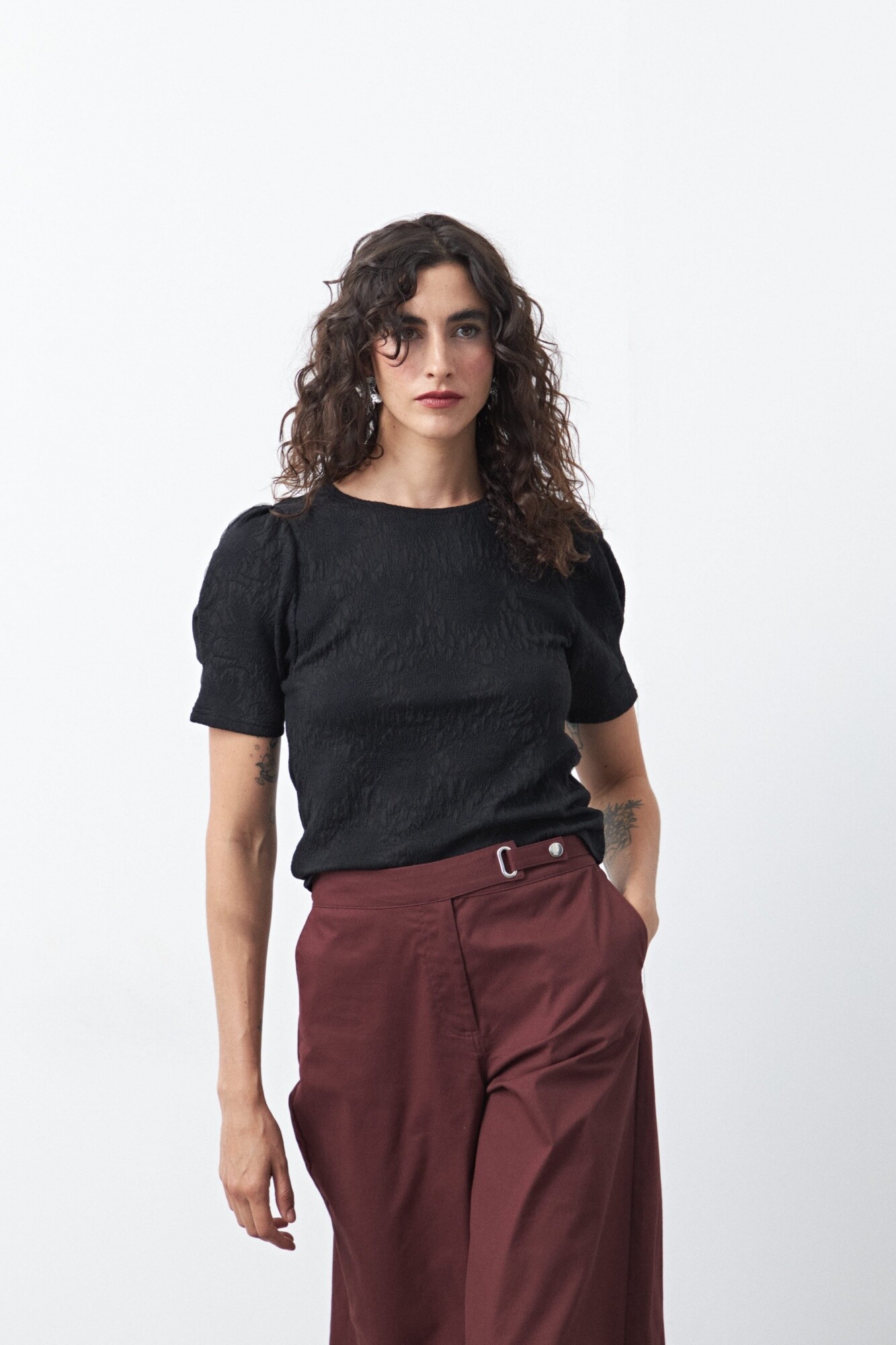 Remera de manga corta con textura floral en relieve y diseño de inspiración romántica. La superficie trabajada aporta profundidad visual y un diferencial sutil, mientras que las mangas abullonadas suman estructura y equilibrio.
