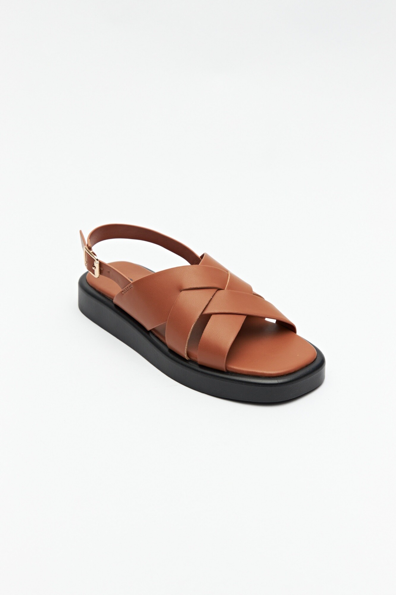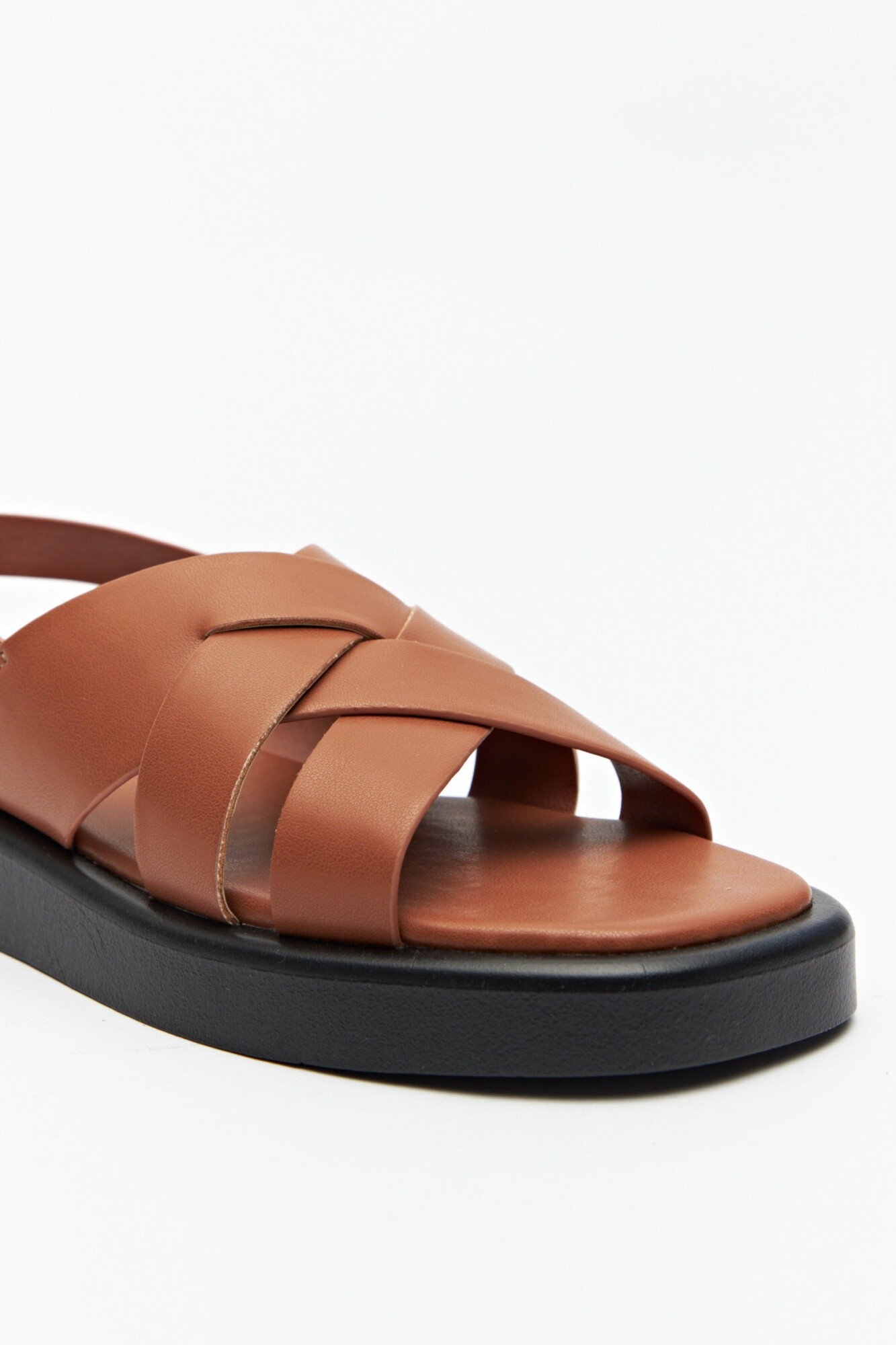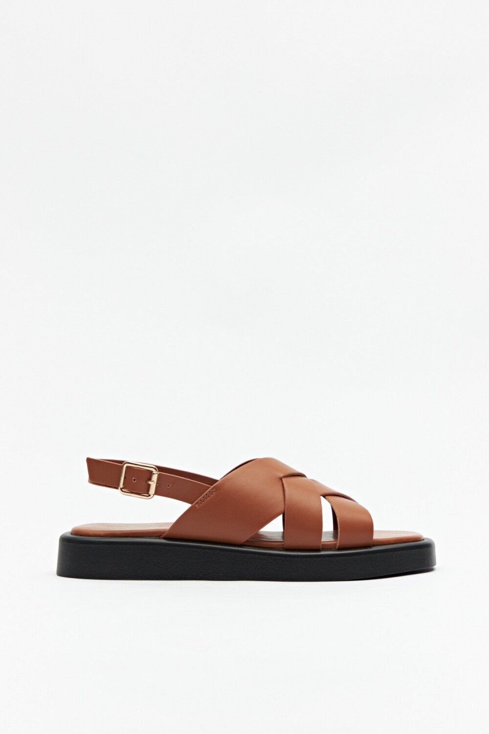 Sandalias en símil cuero con agarre ajustable en el talón y capellada entrelazada. Su plataforma es de 3cm de alto.