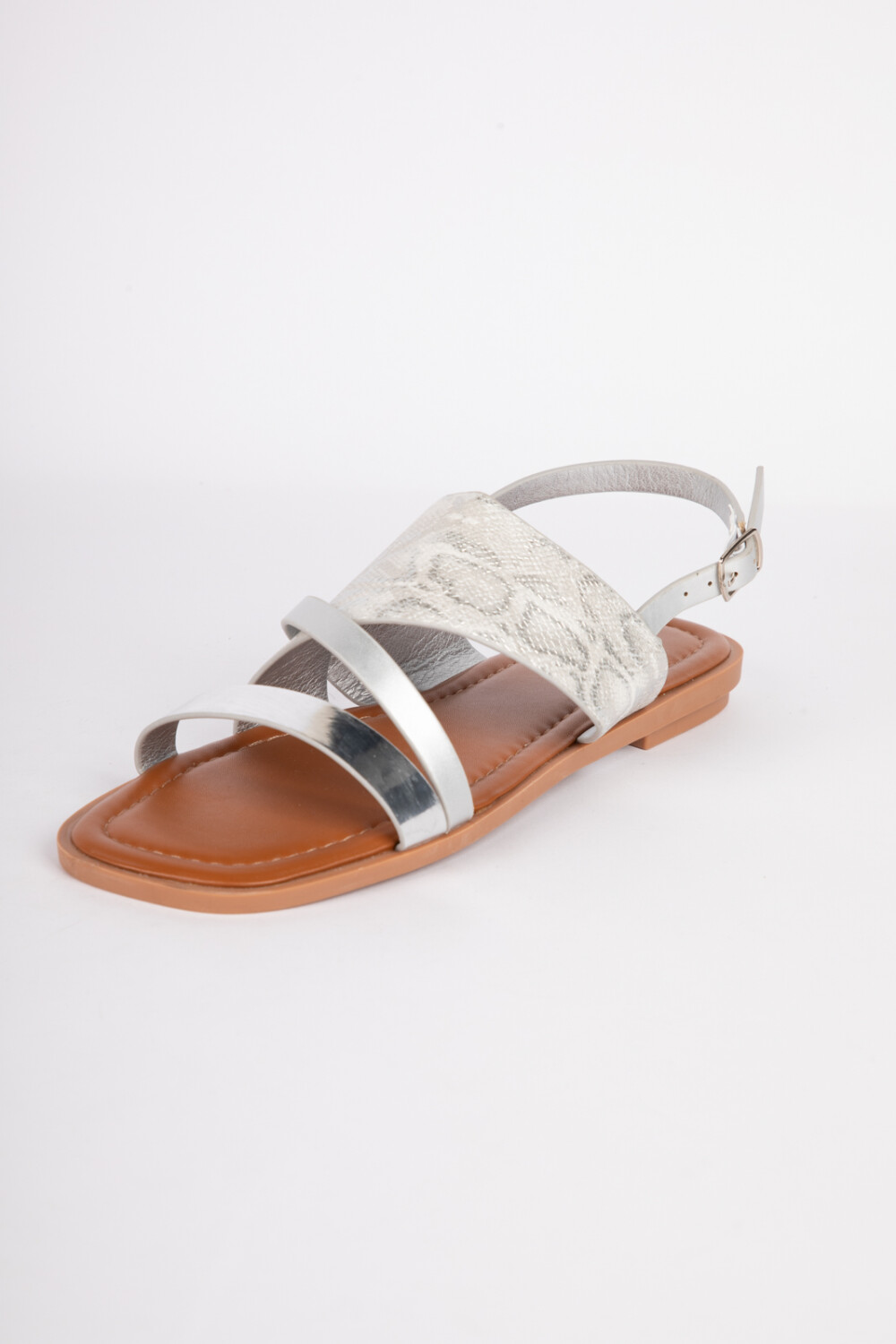 Sandalias bajas de símil cuero con tiras finas y una ancha en la parte del empeine, ésta última cuenta con un animal print a tono. Tienen una suela acolchonada para una mayor comodidad y agarre con hebilla en el tobillo.