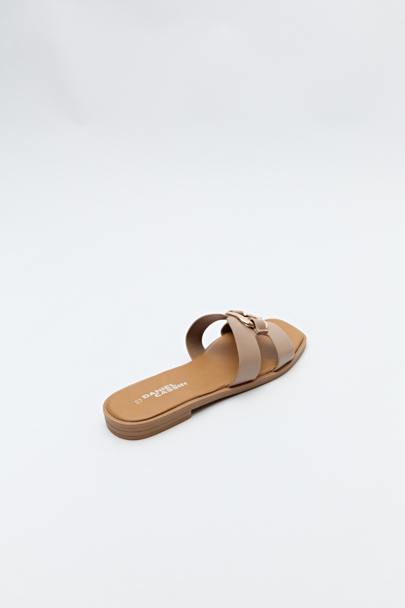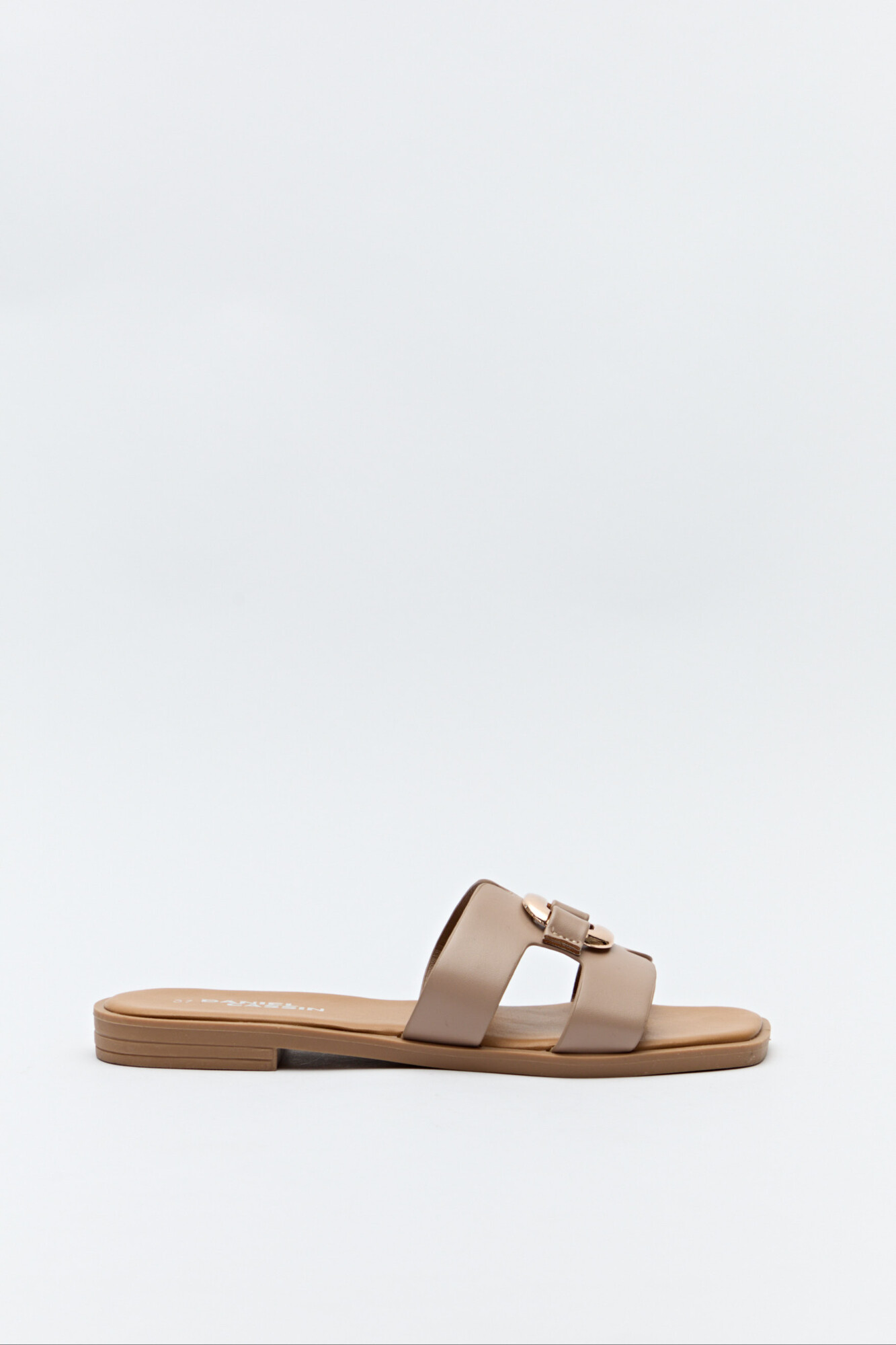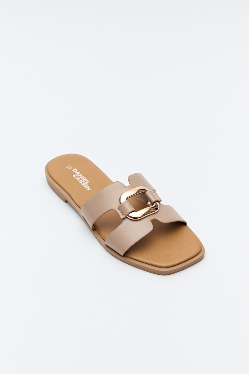 Sandalias planas con capellada ancha y herraje metálico central.