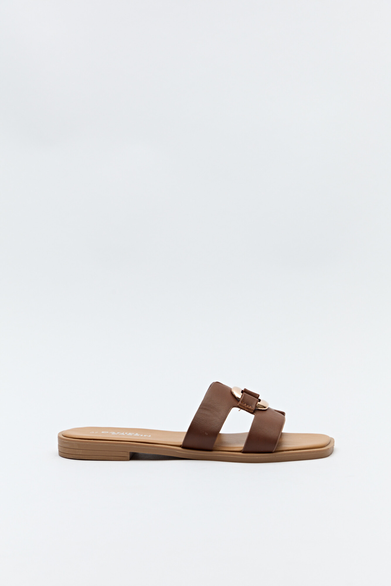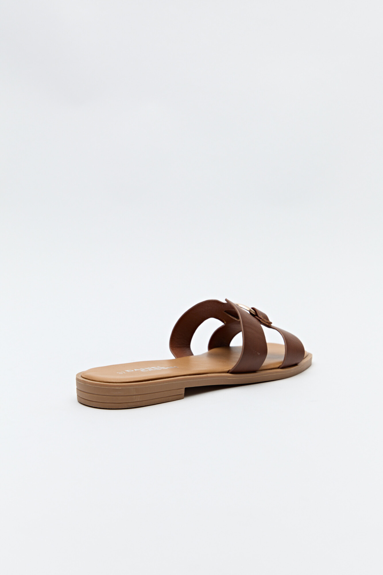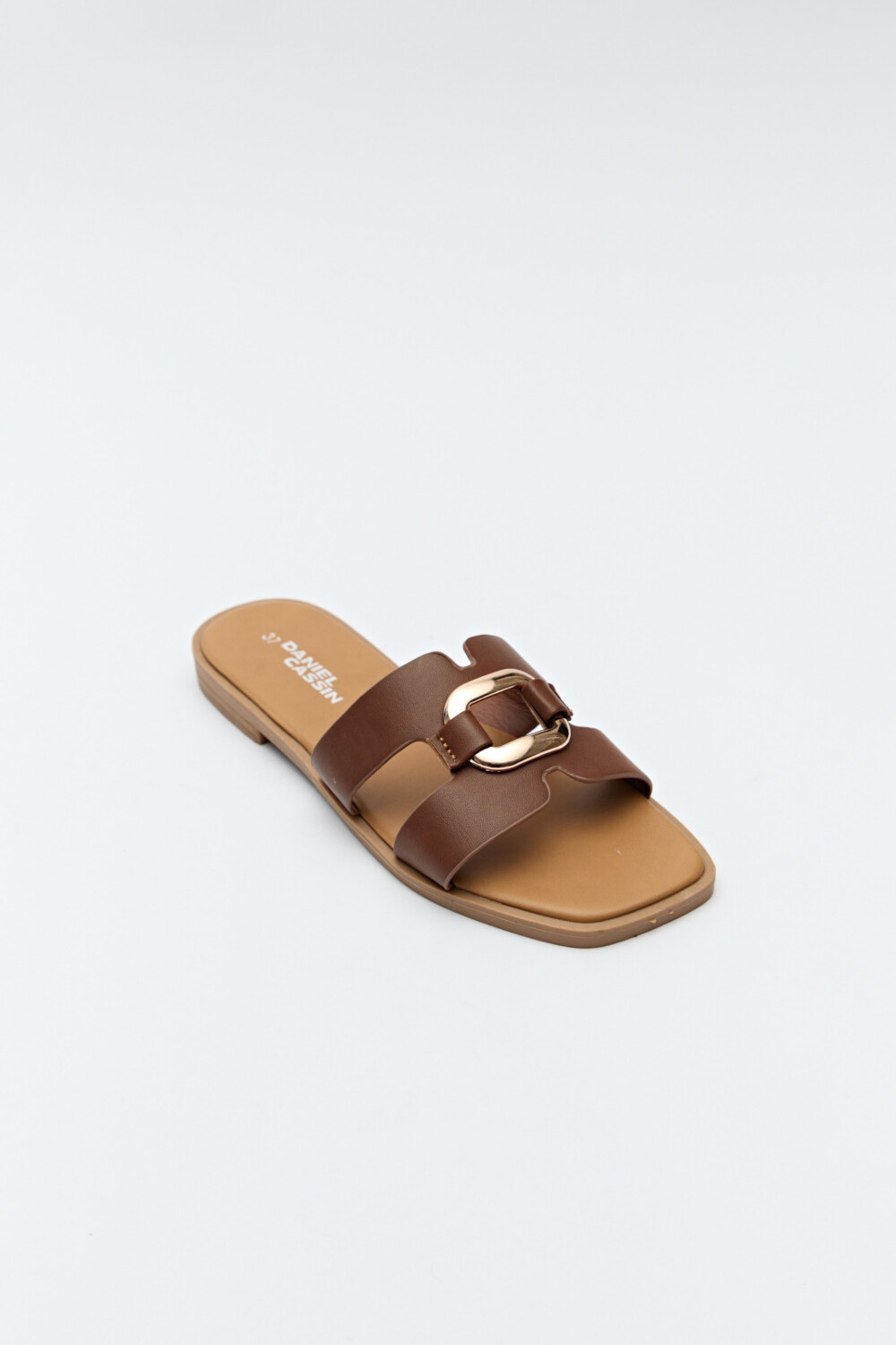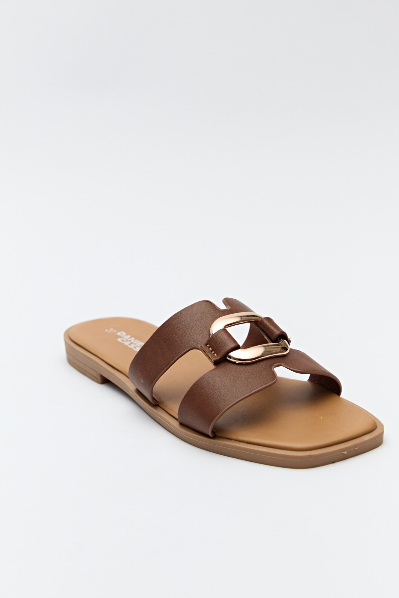 Sandalias planas con capellada ancha y herraje metálico central.