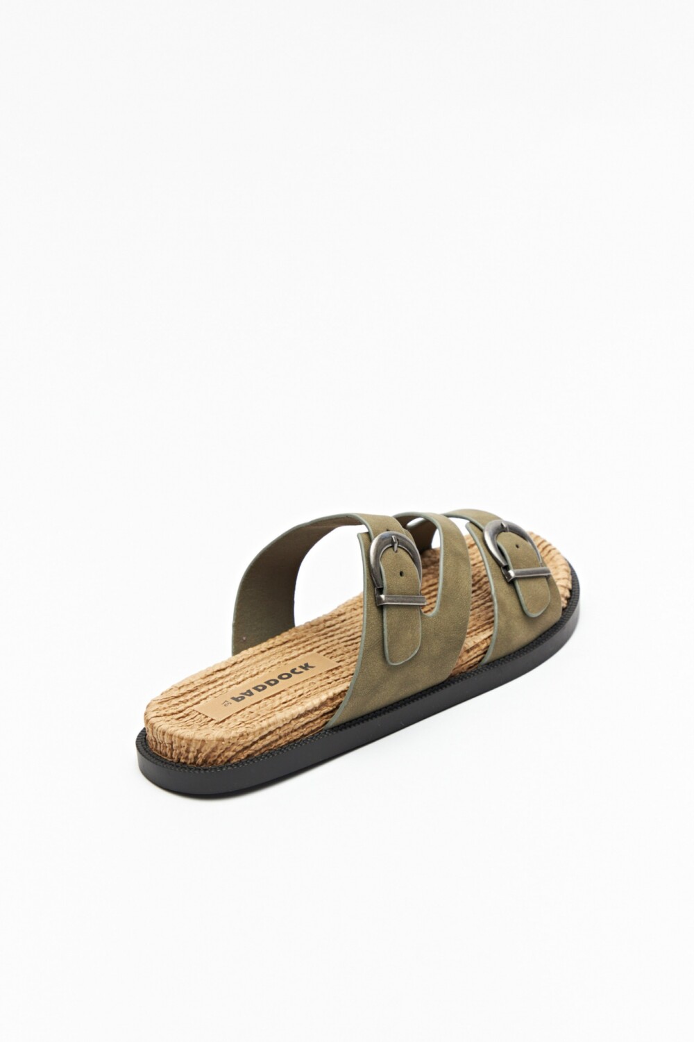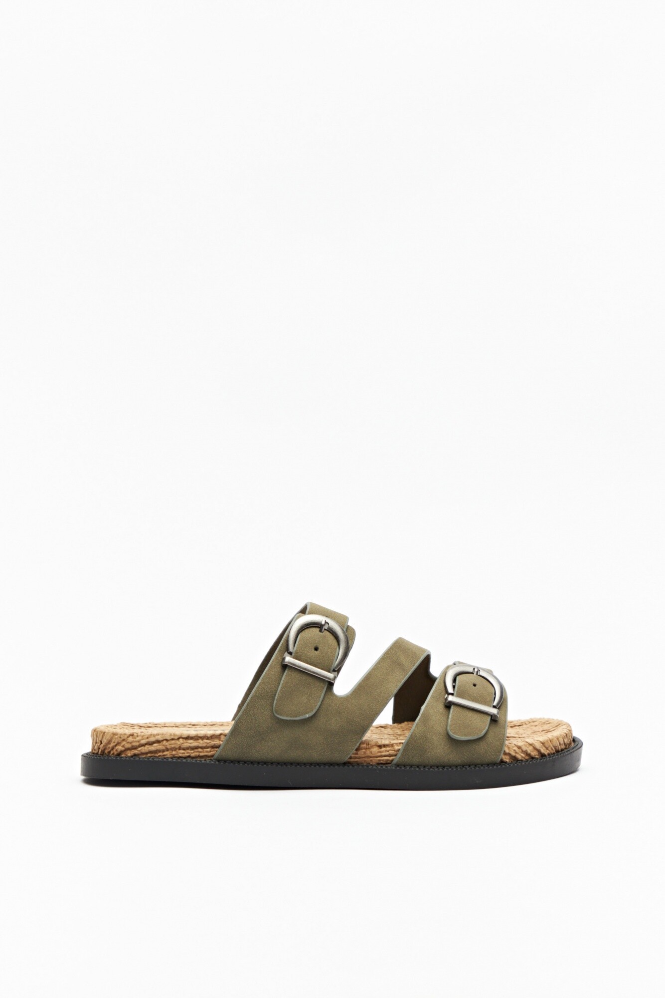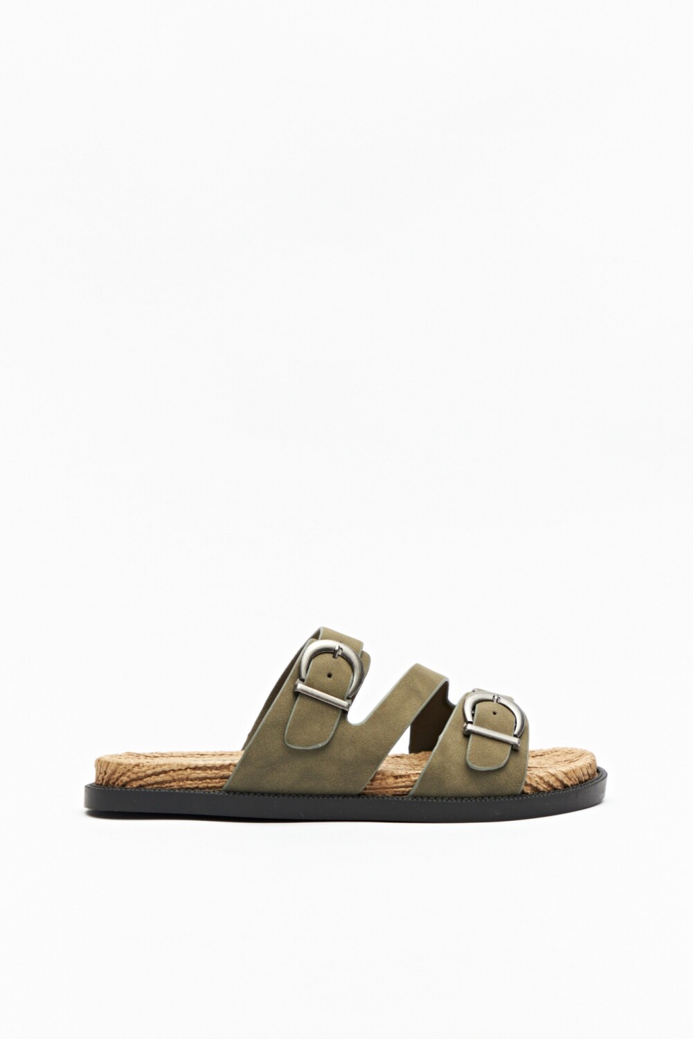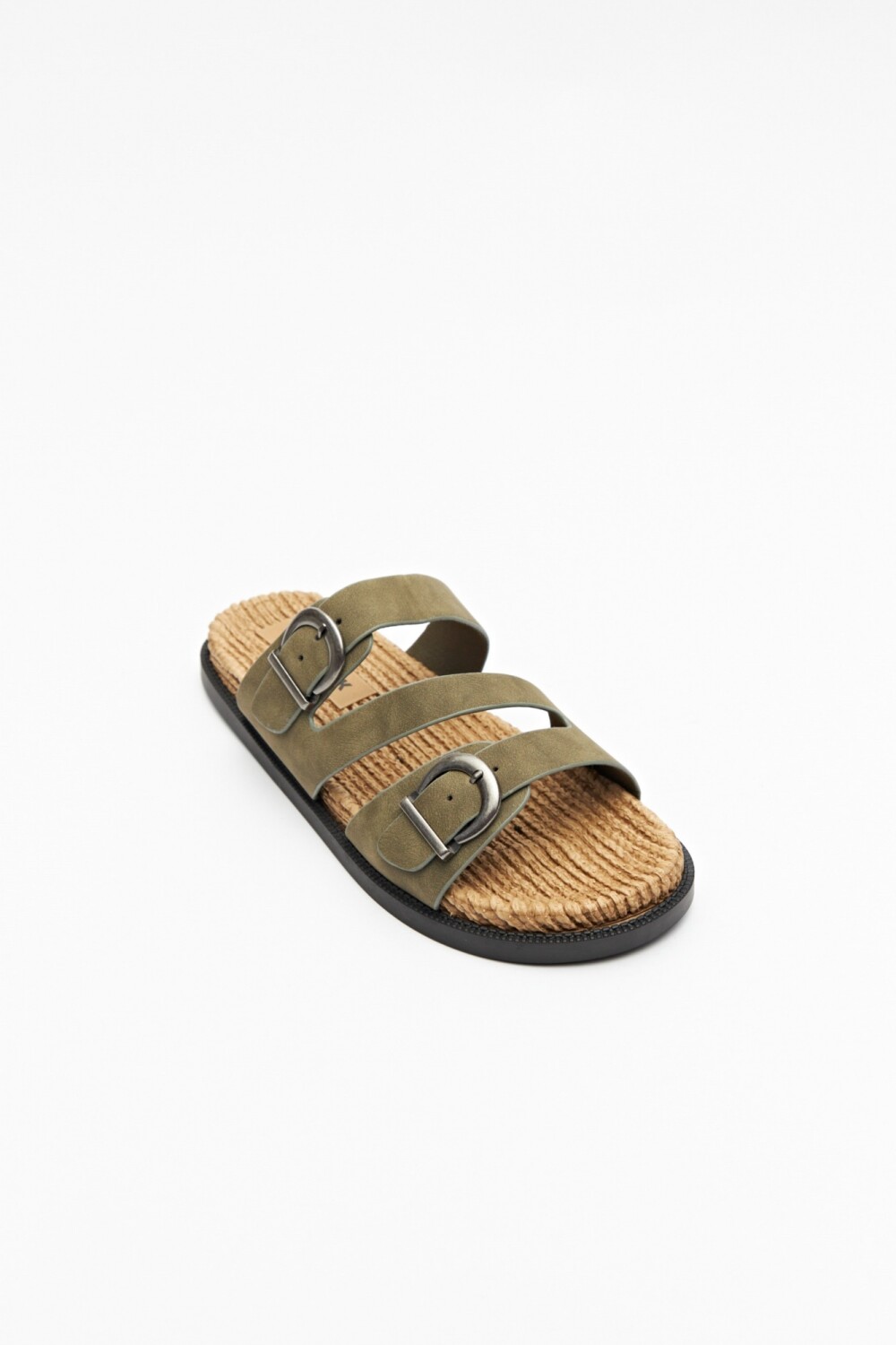 Sandalia plana con base de fibra trenzada y tiras en símil cuero ajustables con hebillas metálicas.