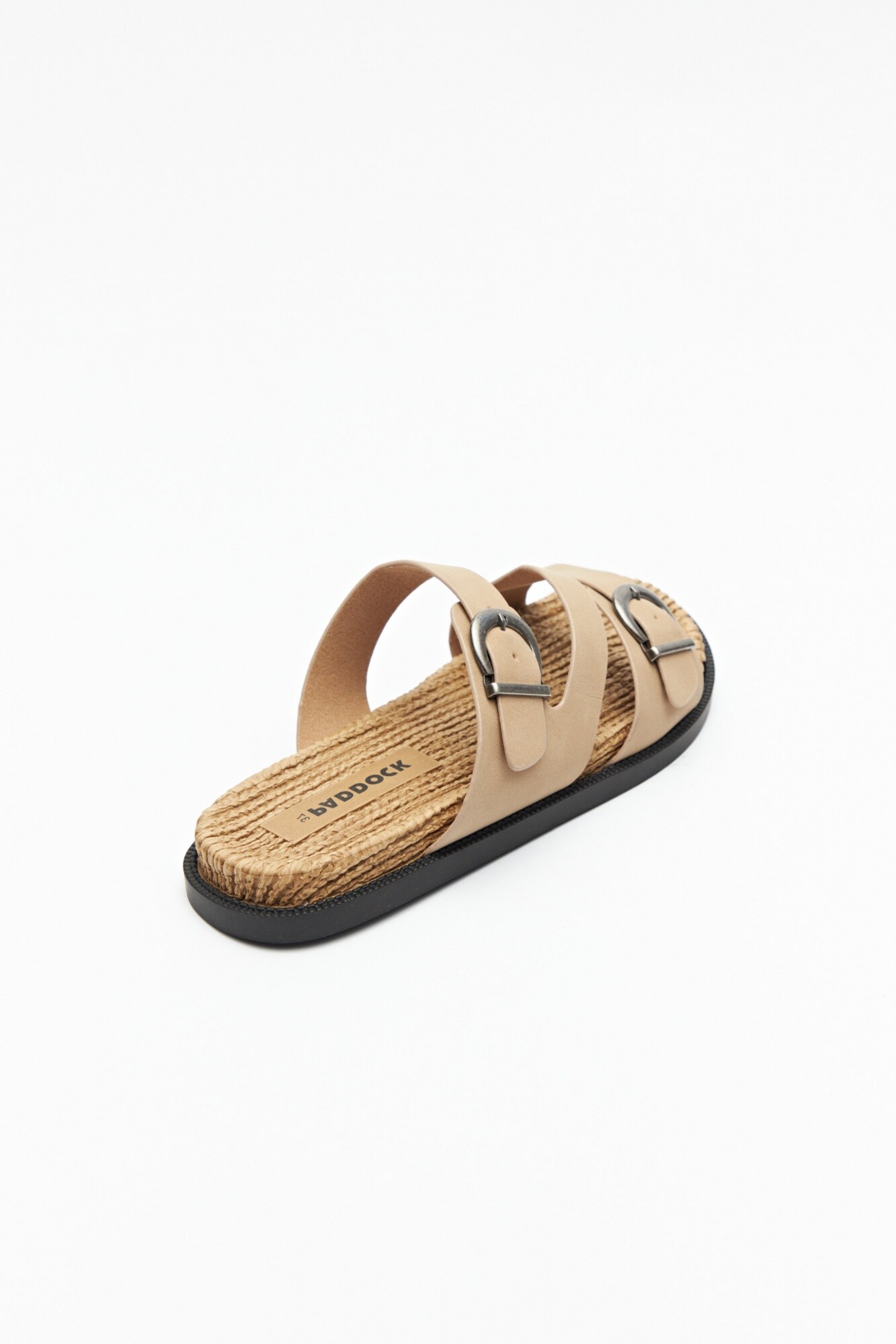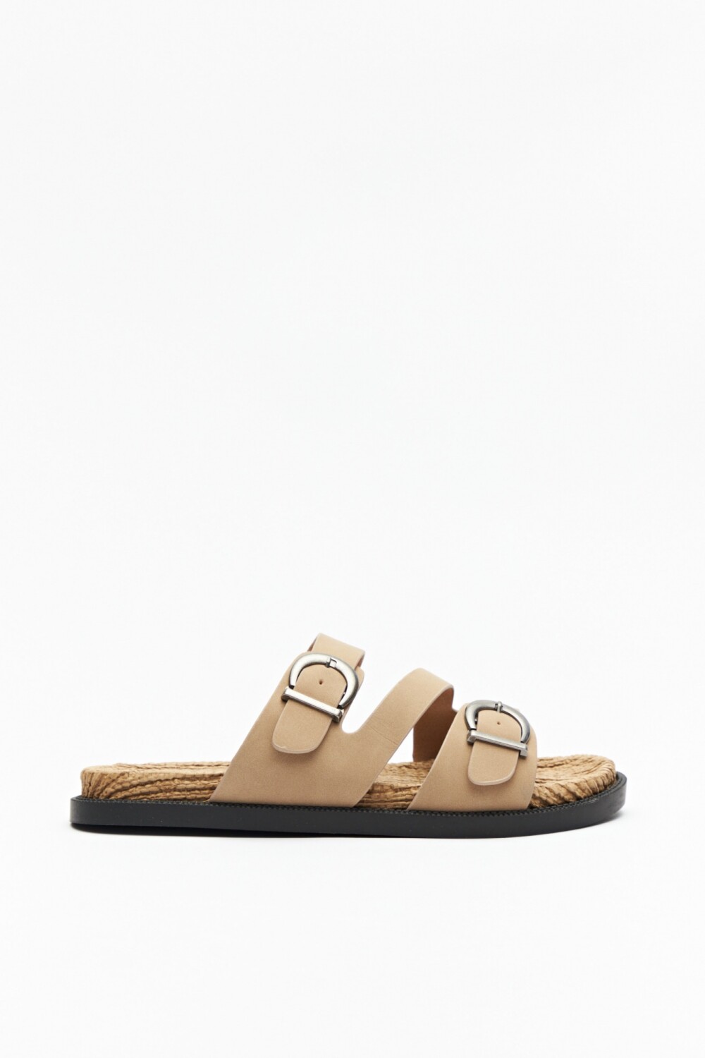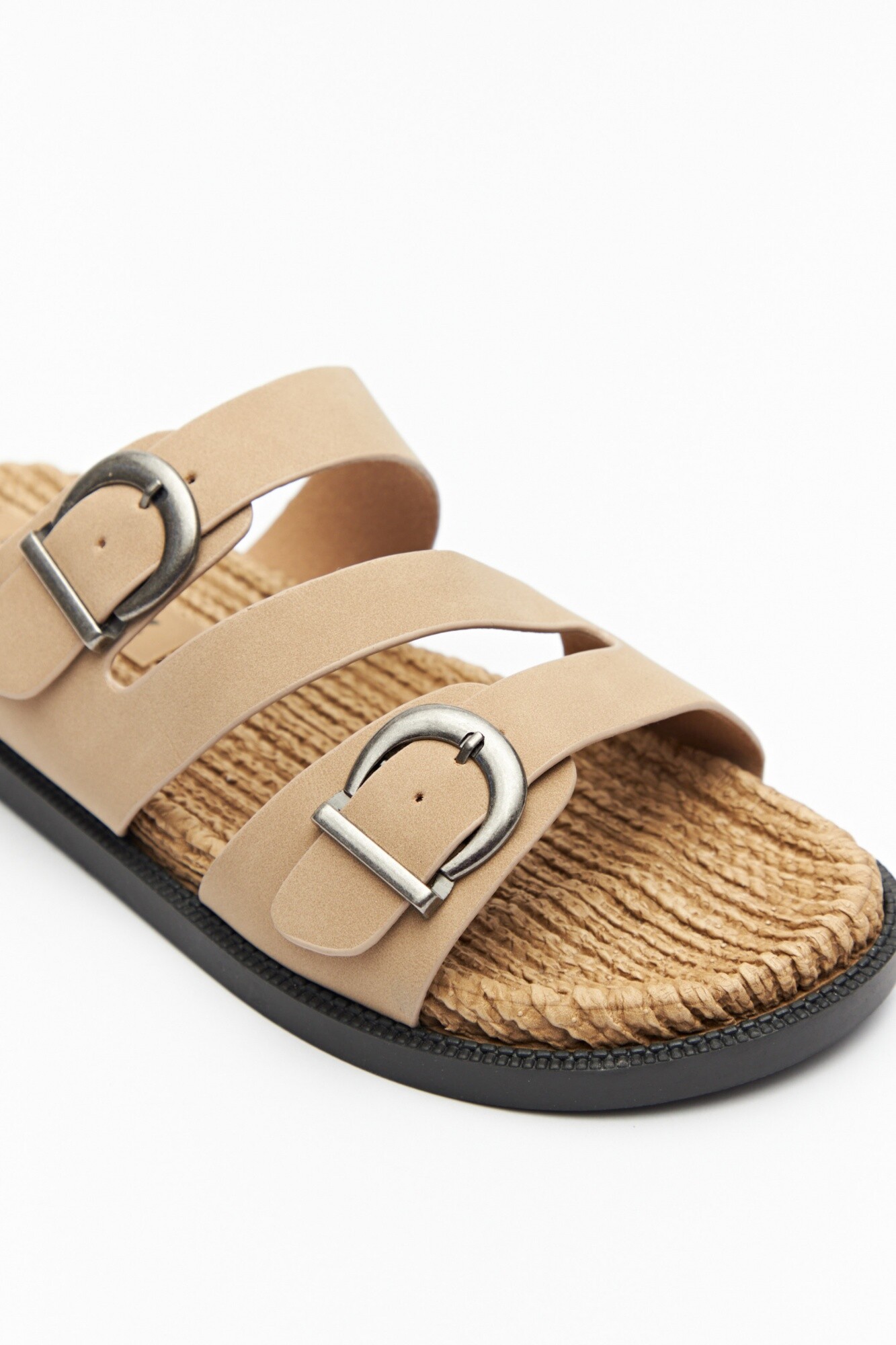 Sandalia plana con base de fibra trenzada y tiras en símil cuero ajustables con hebillas metálicas.