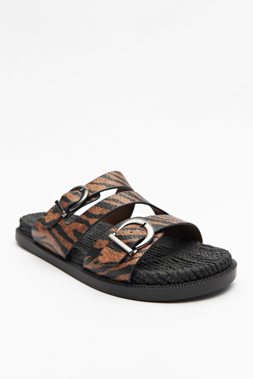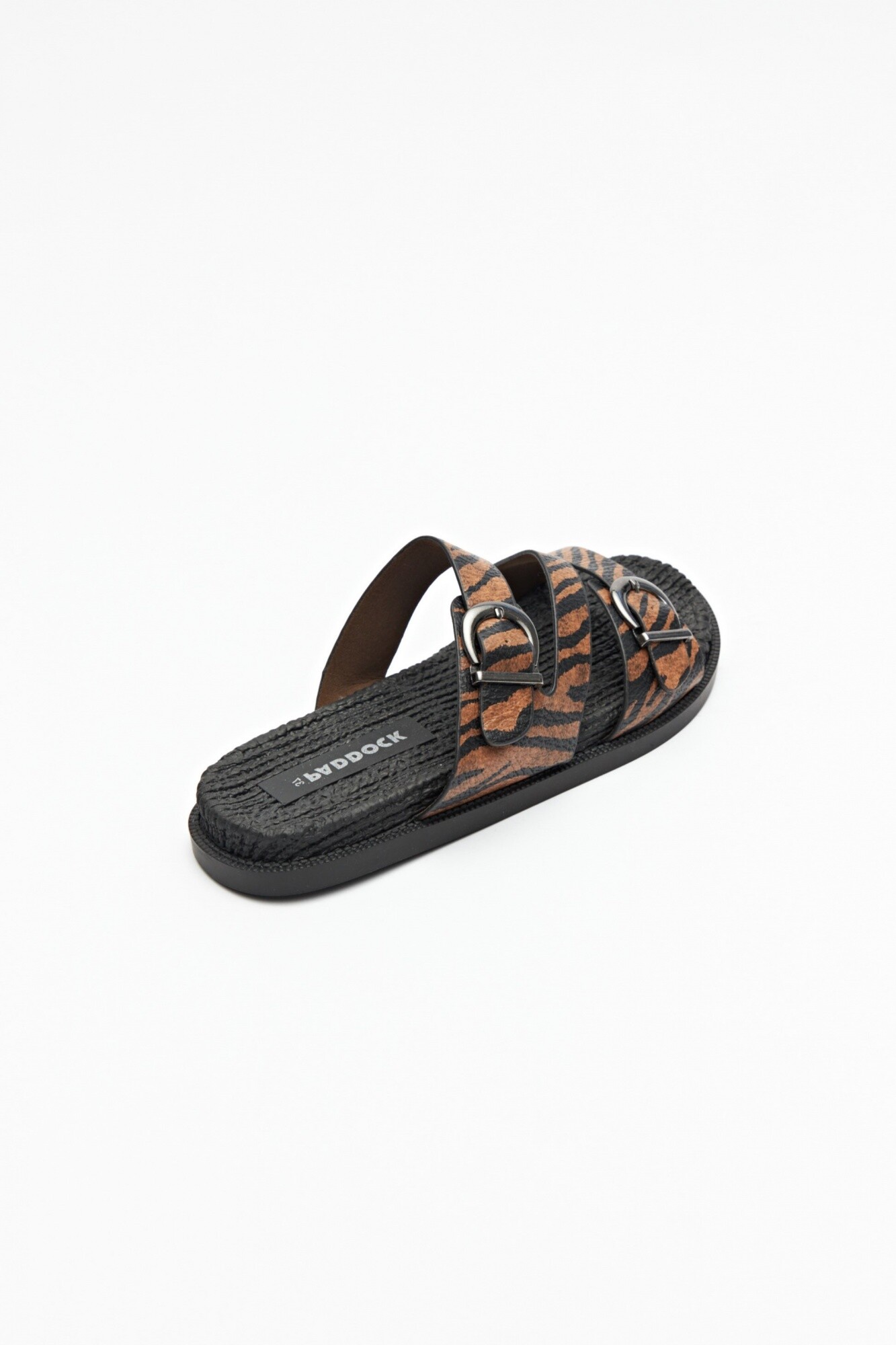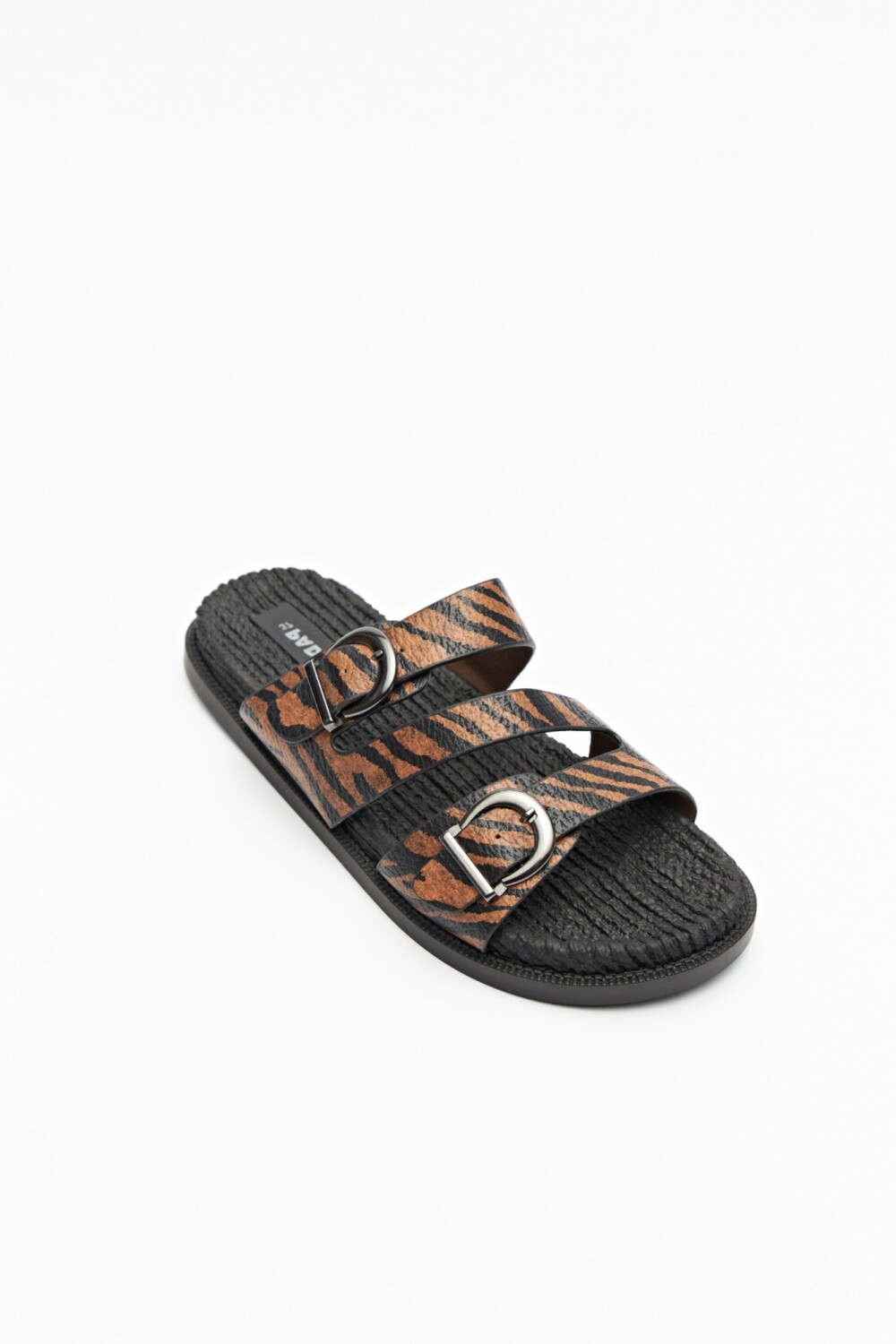 Sandalia plana con base de fibra trenzada y tiras en símil cuero ajustables con hebillas metálicas.