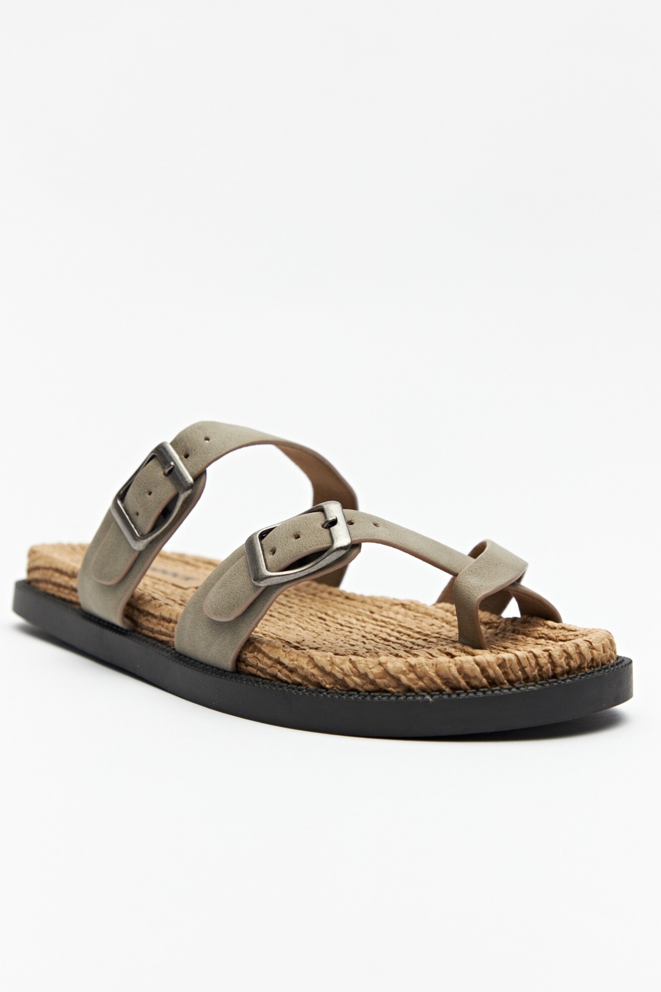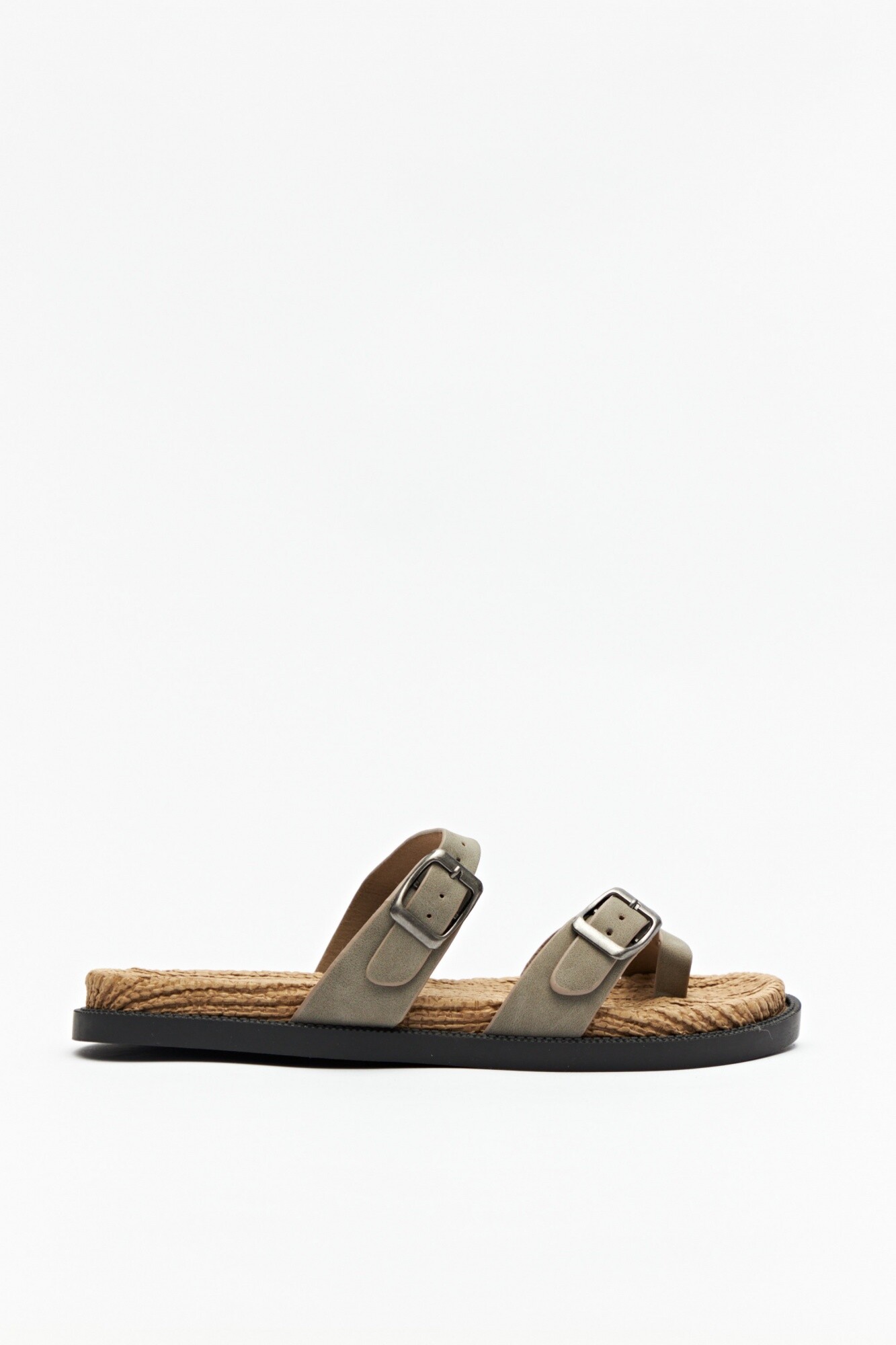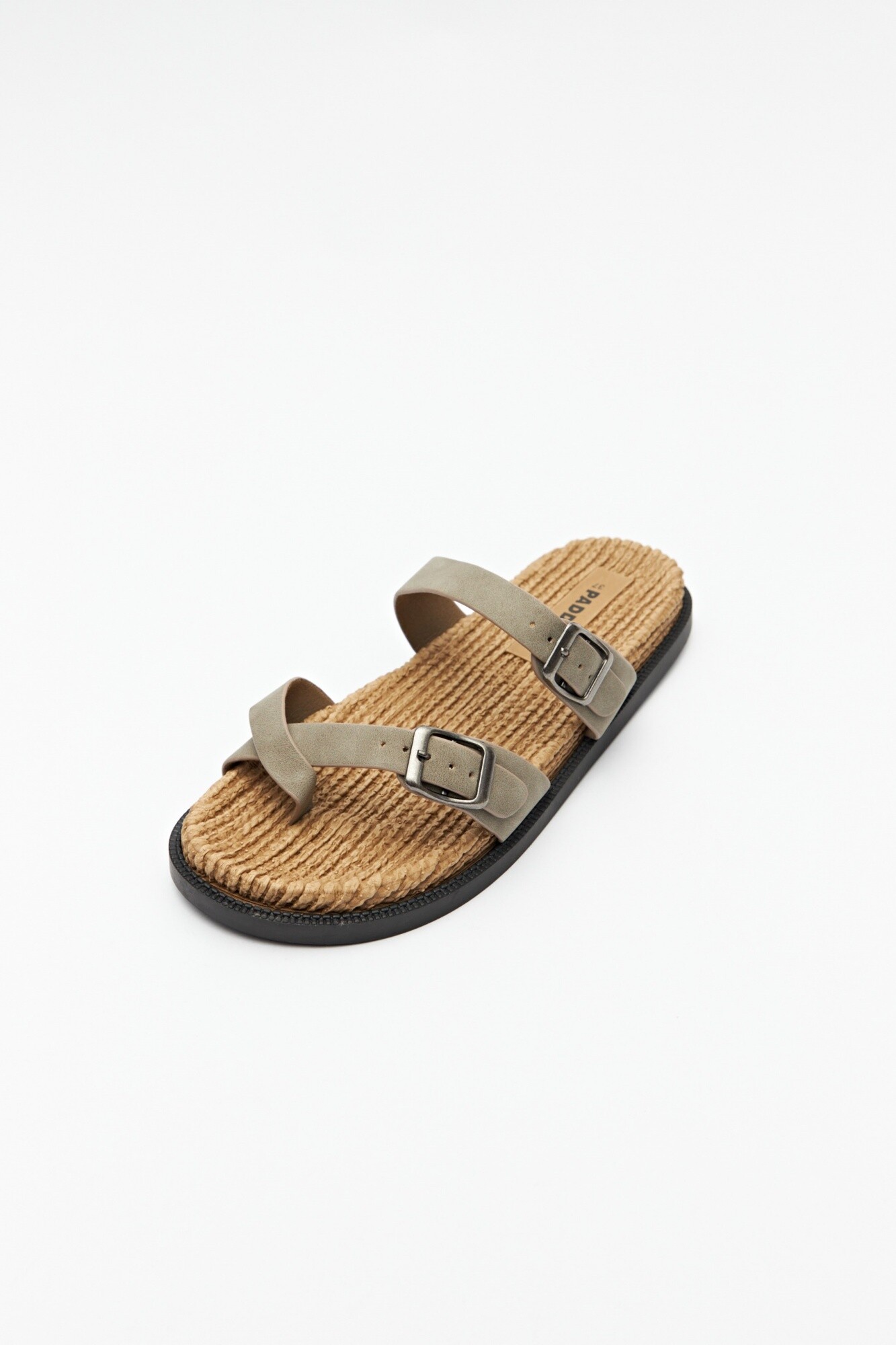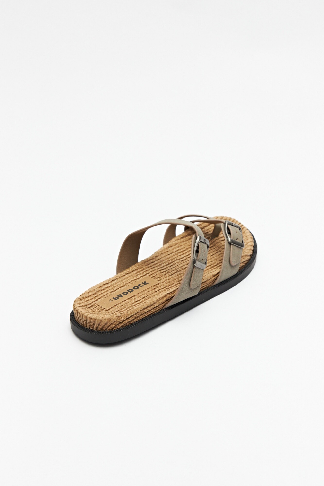 Sandalia plana con base de fibra trenzada y tiras cruzadas ajustables con hebillas metálicas. Un básico cómodo y fresco, ideal para completar cualquier look de verano o festival.