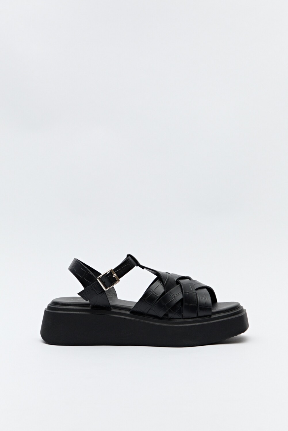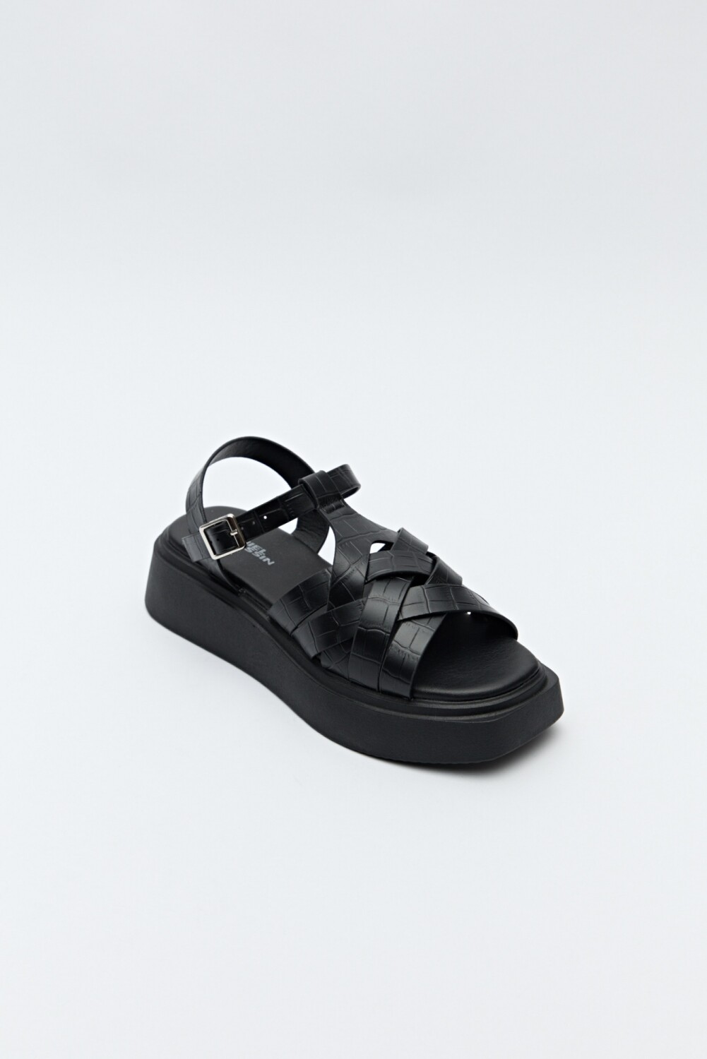 Sandalia con base plataforma bicolor y capellada de tiras entrelazadas con textura símil reptil. La hebilla metálica lateral permite ajustar el calce, mientras que la suela de goma aporta estabilidad y confort. Una pieza trendy y funcional que equilibra diseño artesanal con un estilo urbano contemporáneo.