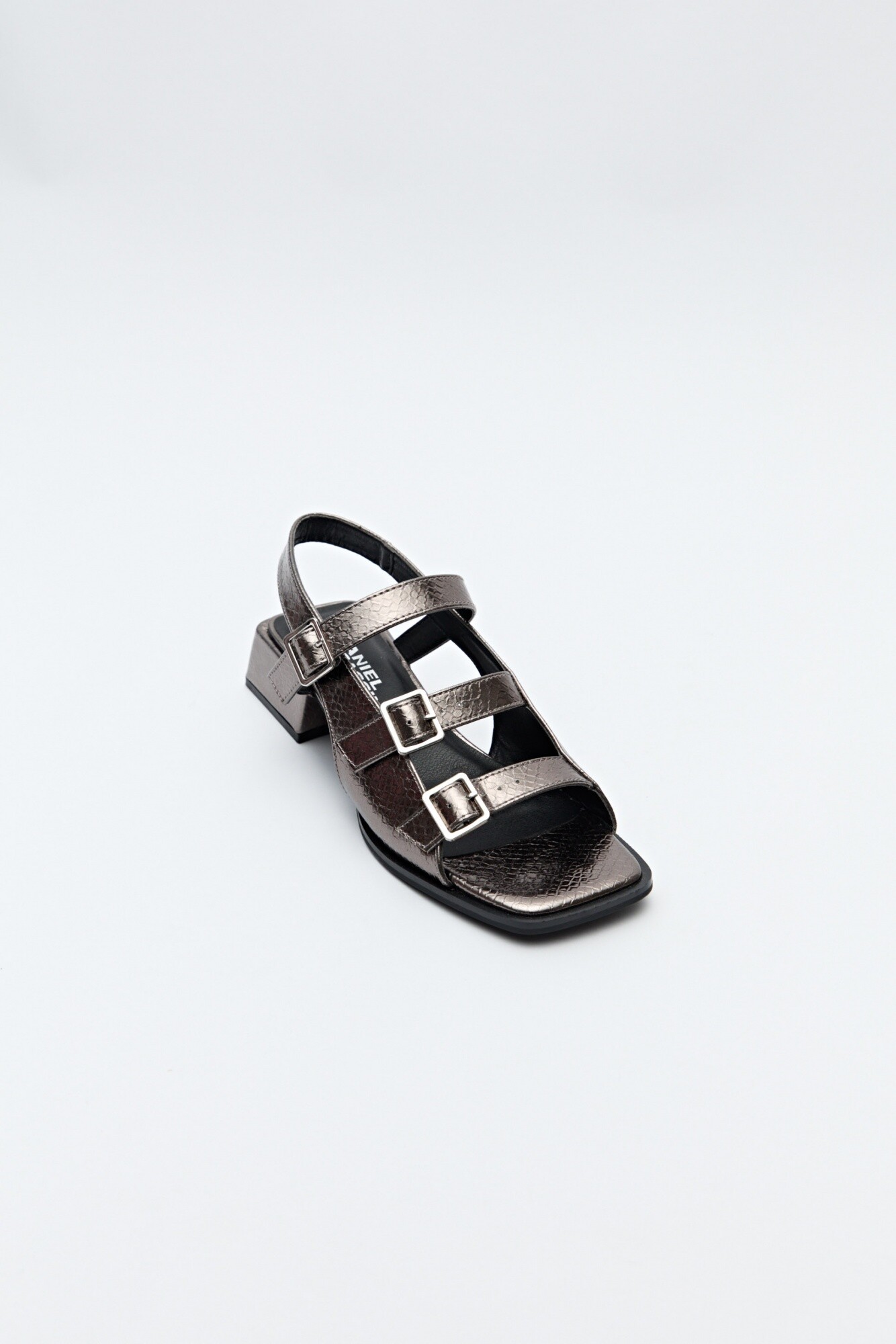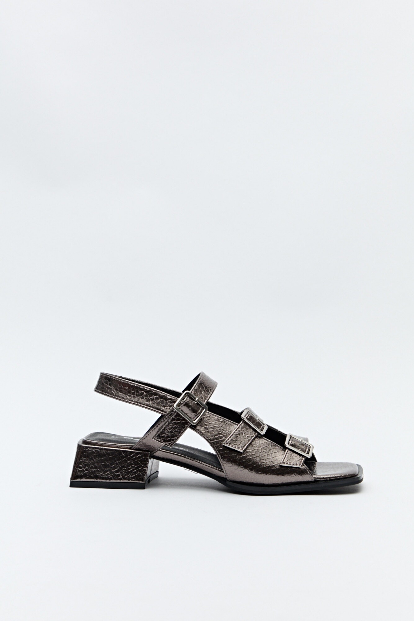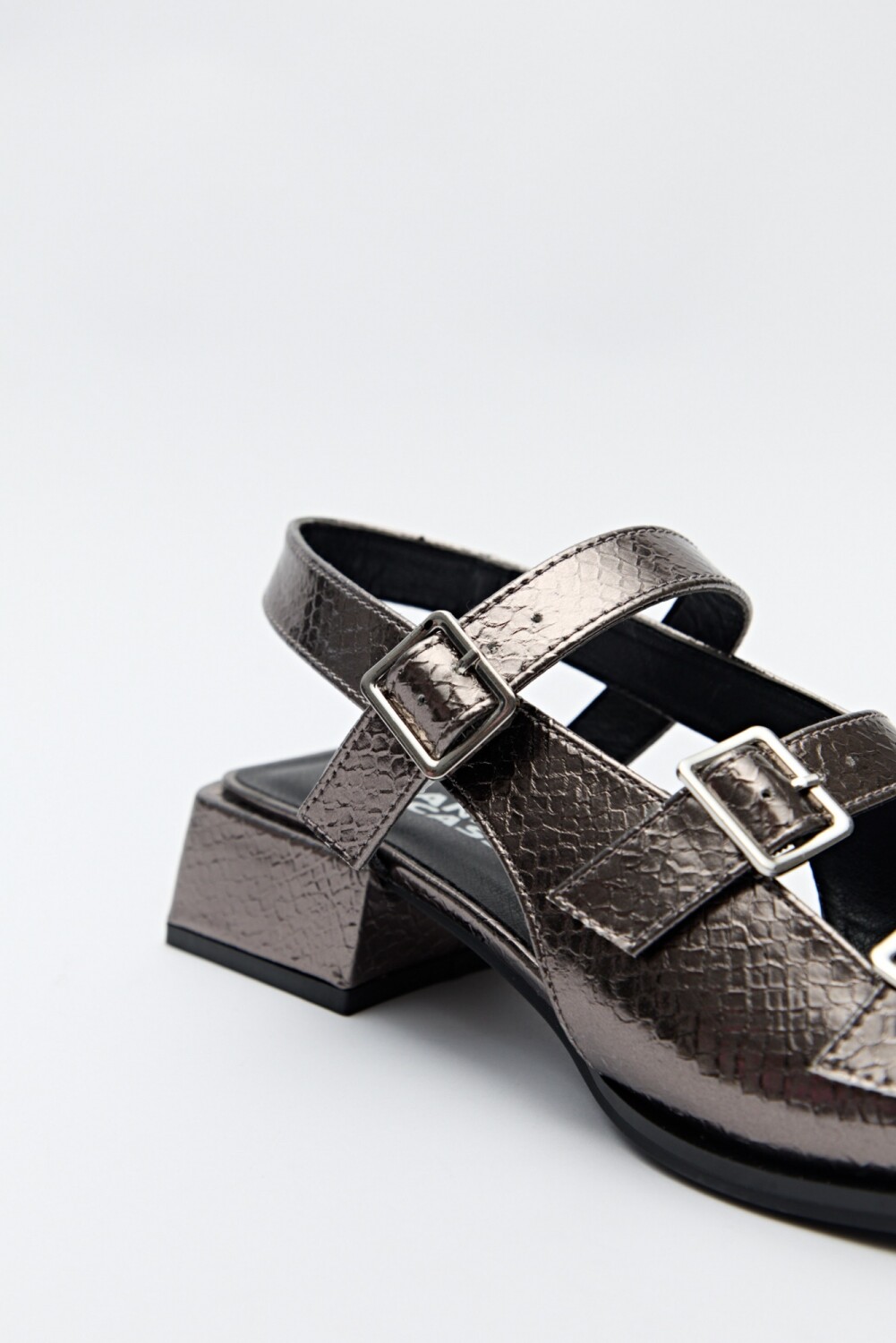 Sandalia con taco medio y diseño de múltiples tiras con hebillas metálicas ajustables. Su textura símil reptil aporta un aire sofisticado y moderno, mientras que la base ancha brinda estabilidad y confort. Un modelo que combina carácter y estilo, perfecto para elevar tanto looks de oficina como de noche.