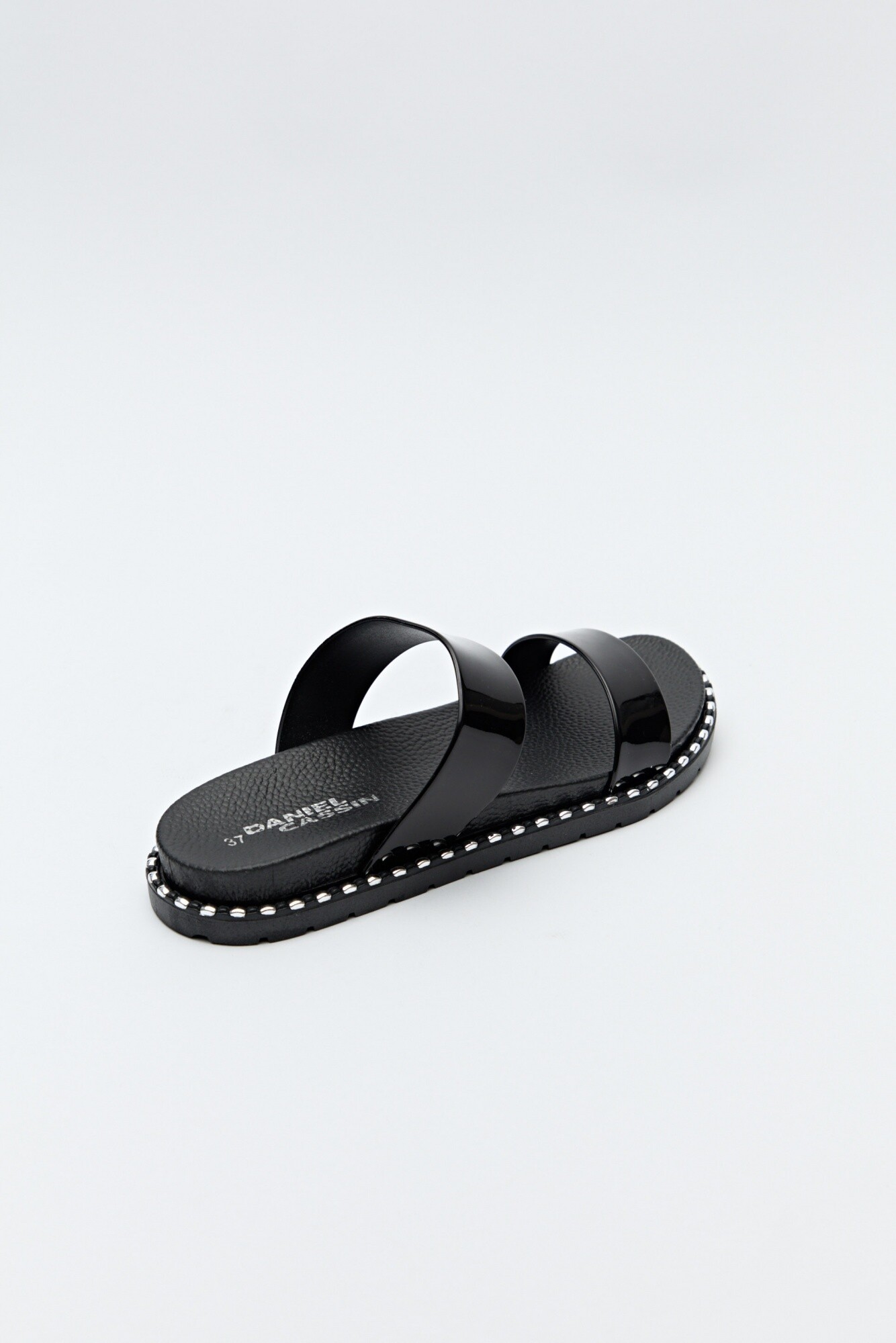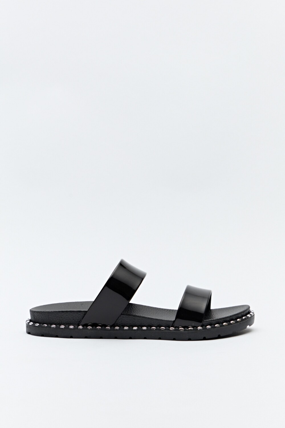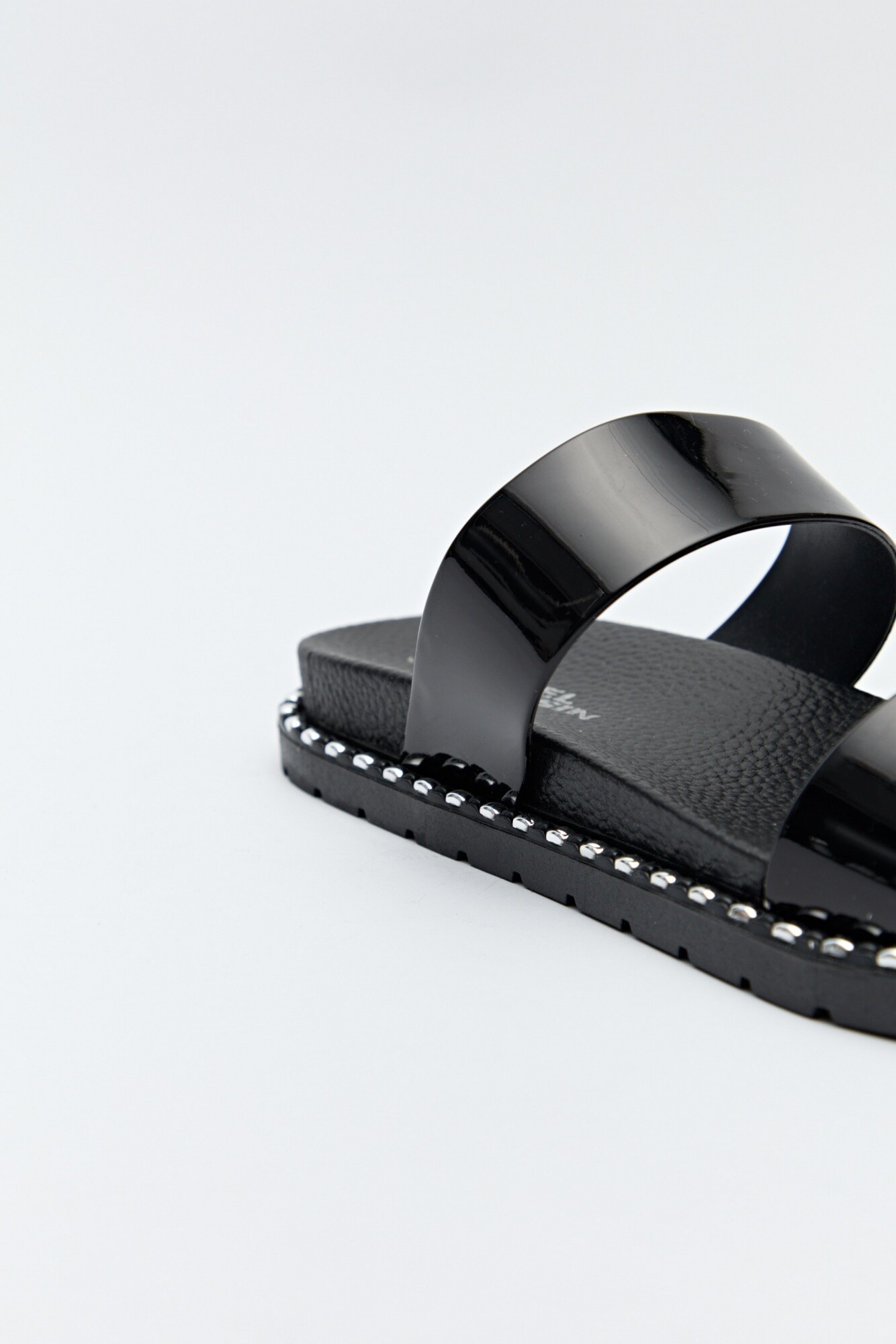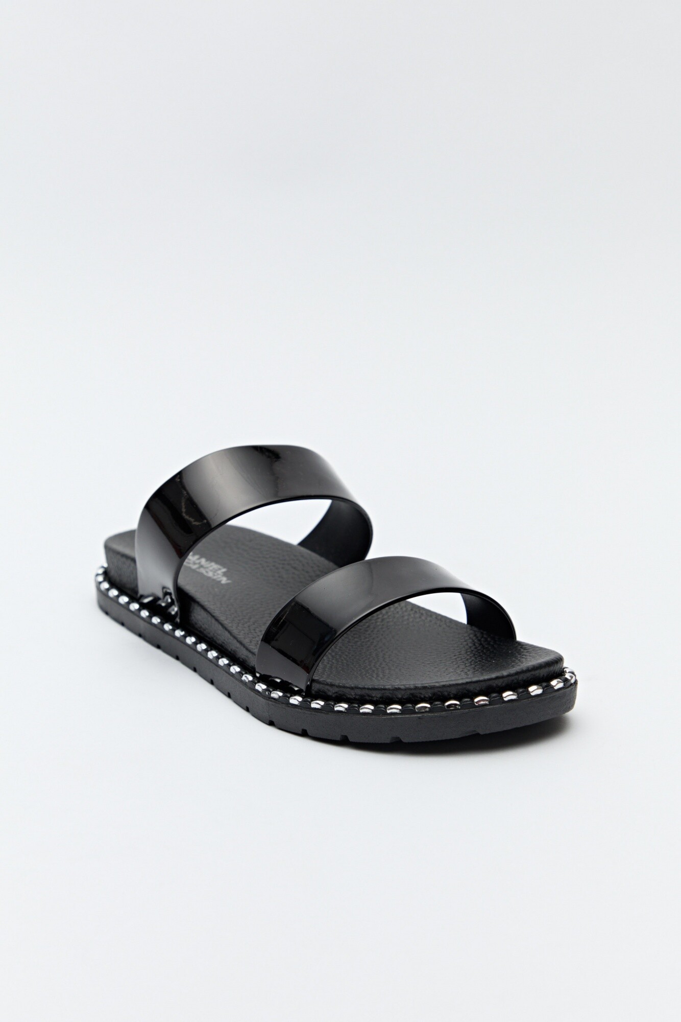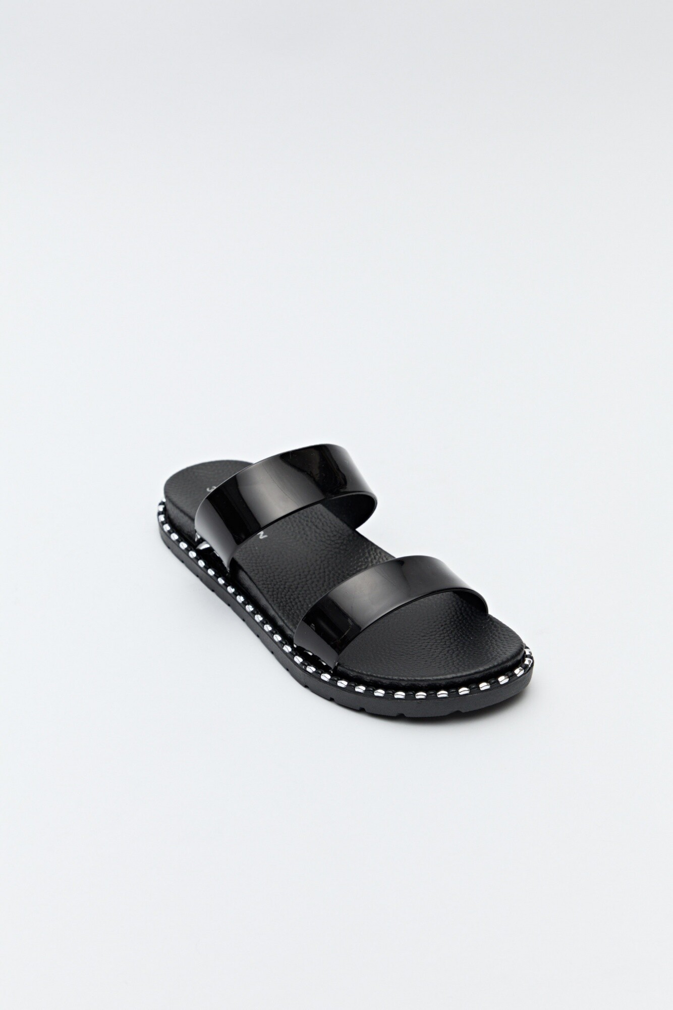 Minimalistas y trendy, estas sandalias se reinventan con su acabado brillante y detalles metálicos en la suela que aportan un toque rocker. Sus dos tiras anchas sujetan cómodamente el pie, mientras que la base anatómica brinda confort en cada paso.