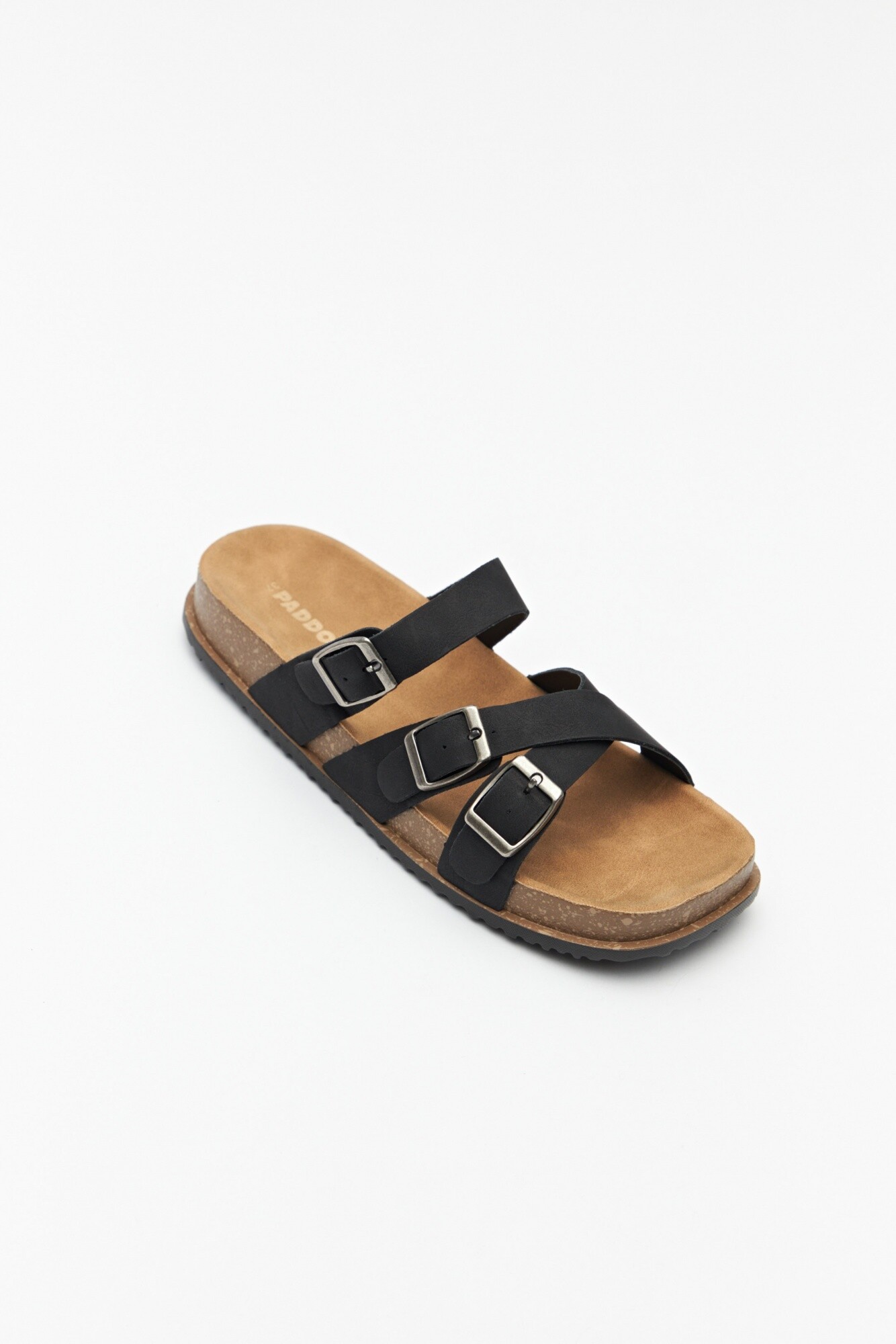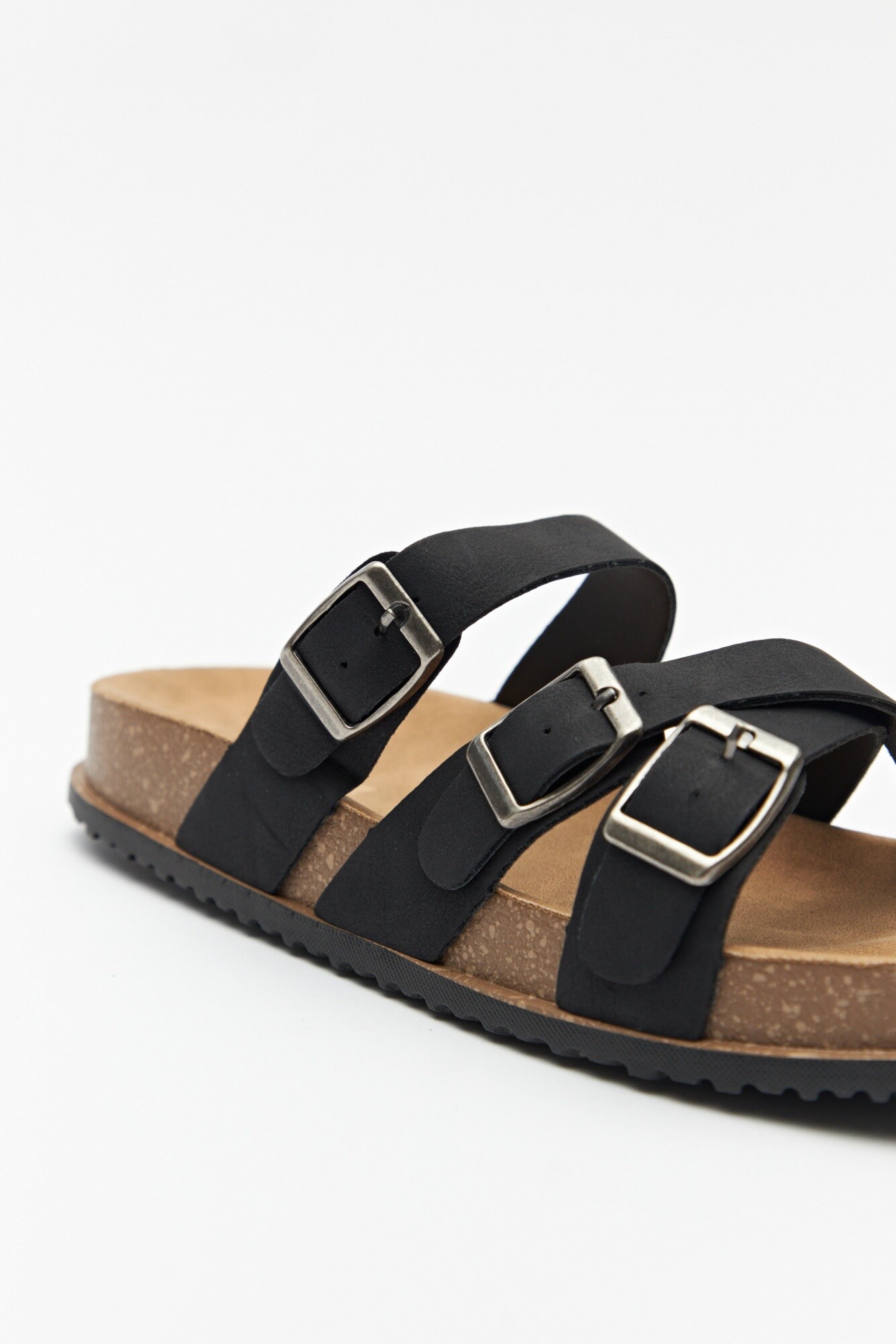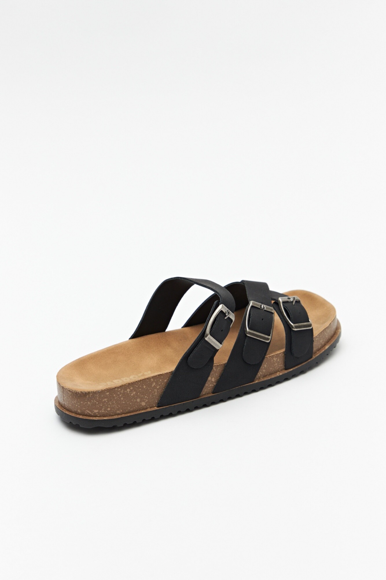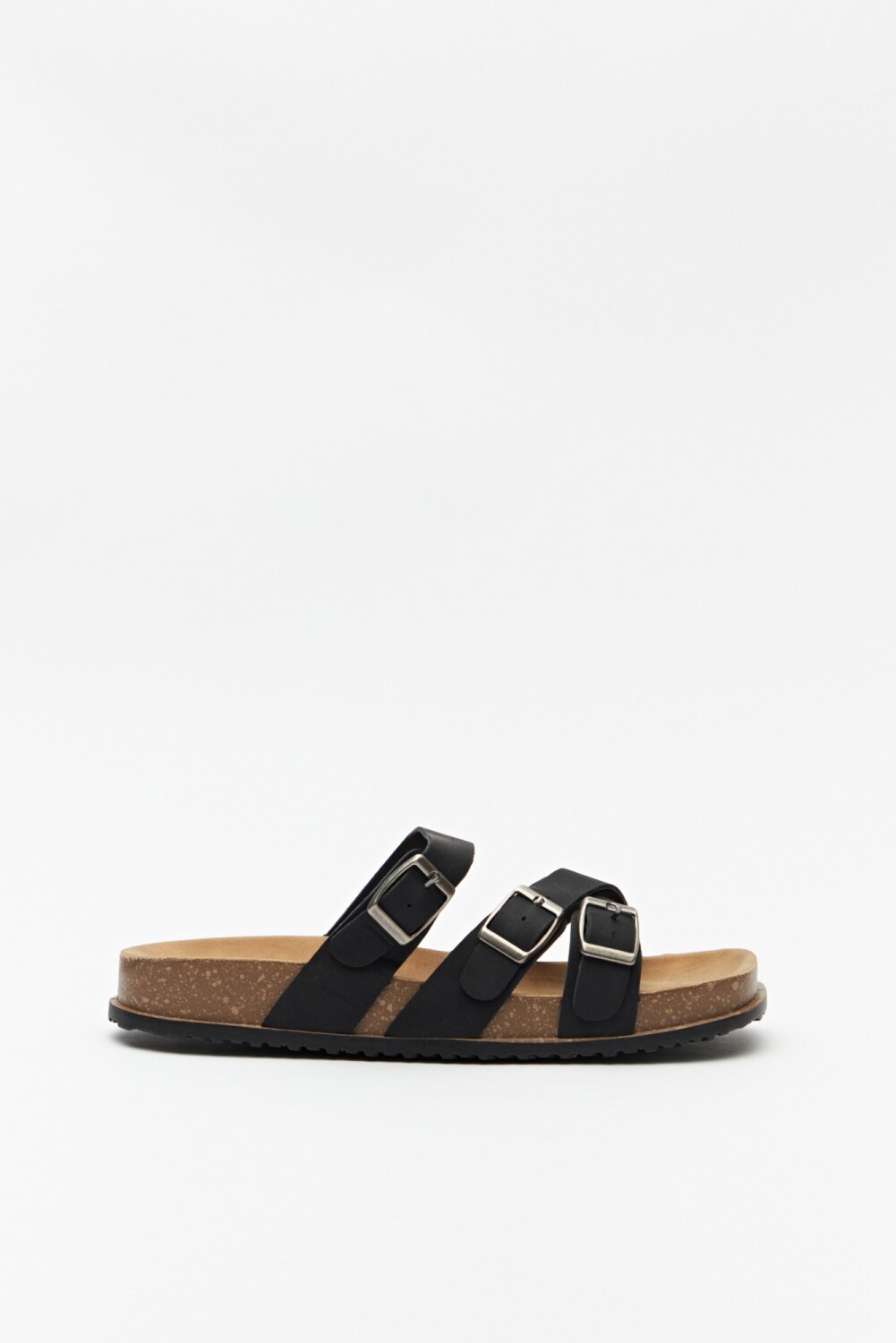 sandalias de plataforma con suela de corcho amortiguadora de 3cm de alto. Tiras cruzadas de gamuza con hebillas metálicas ajustables.