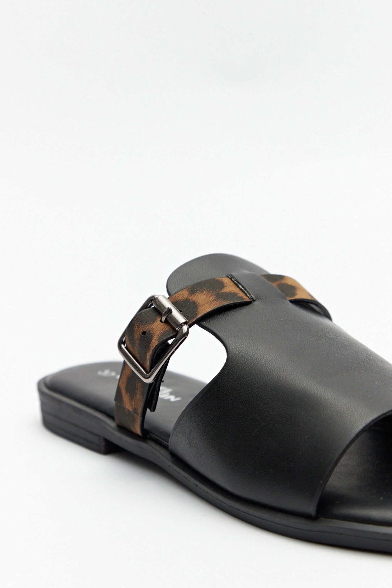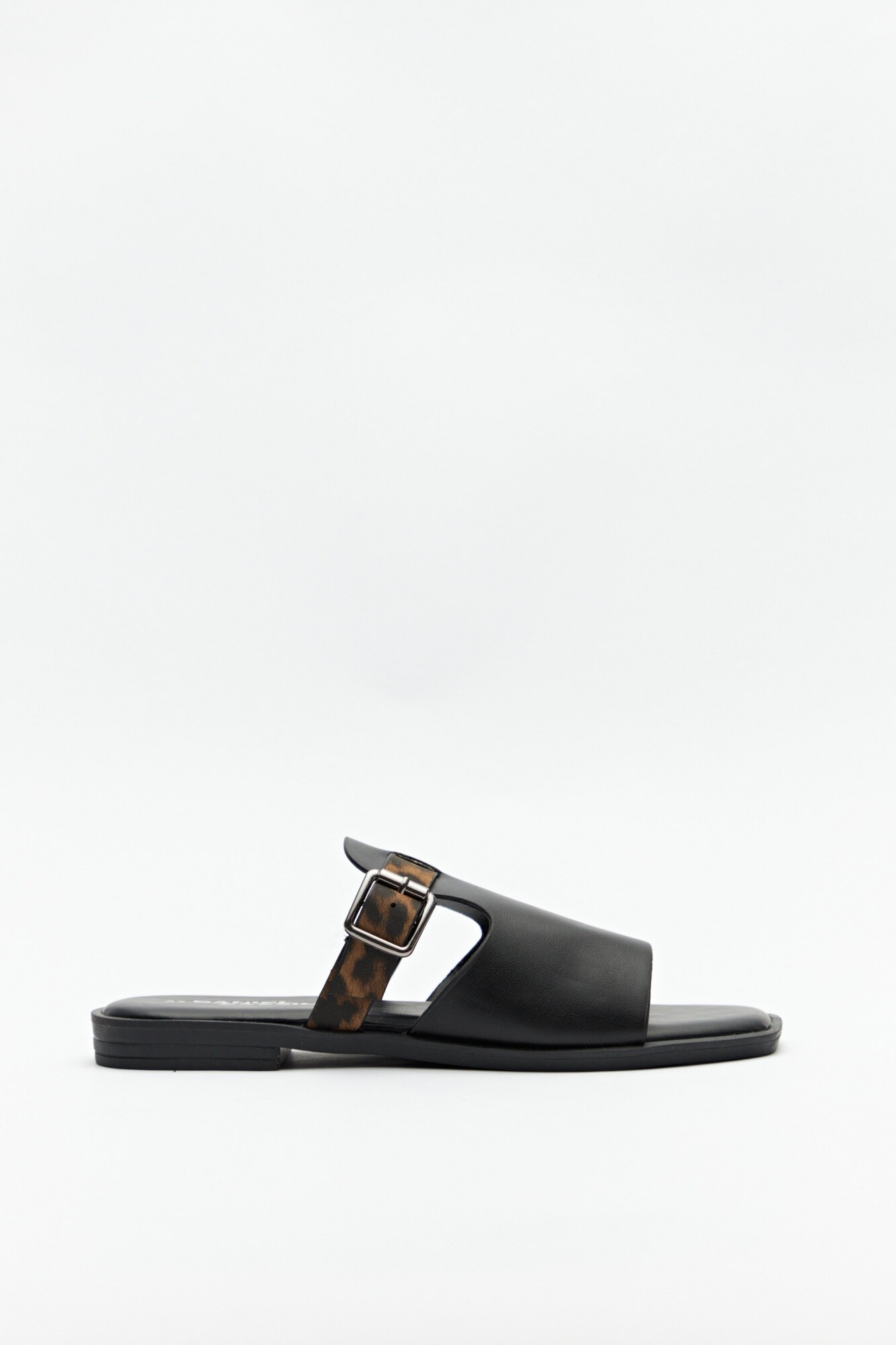 Sandalias bajas de suela acolchonada y pequeño taco de 2cm de alto. Su capellada es en símil cuero texturizado con tira en animal print y hebilla ajustable.