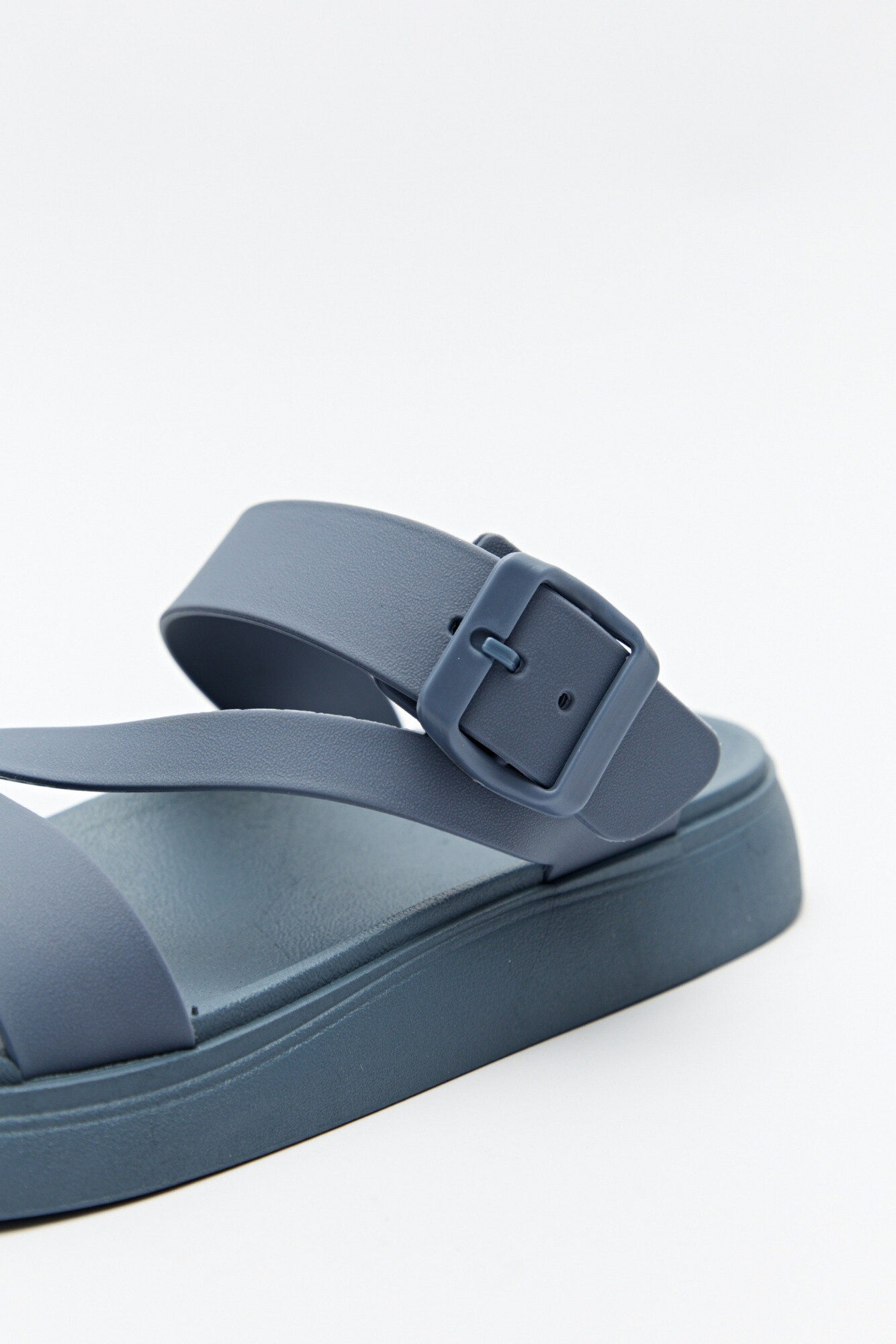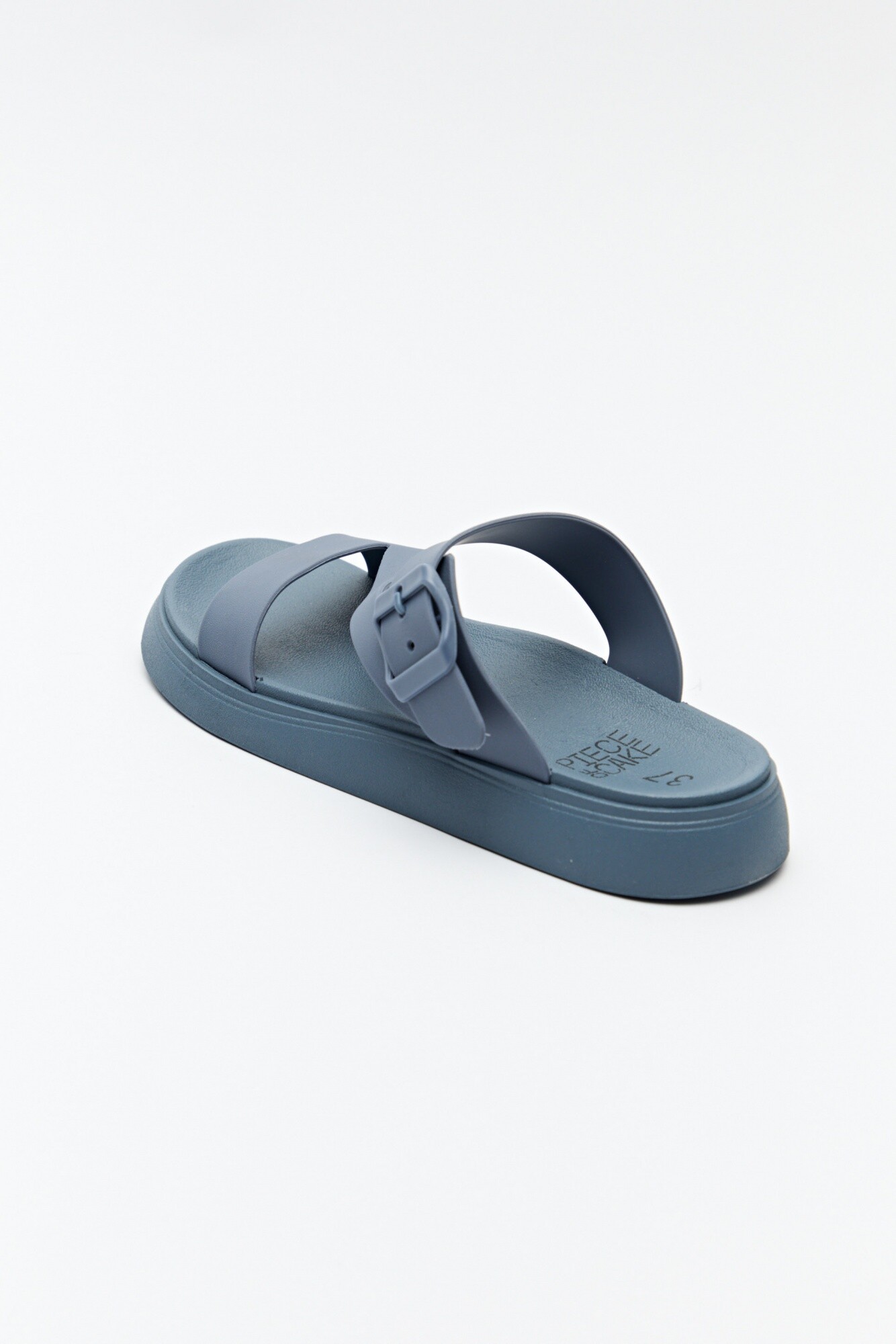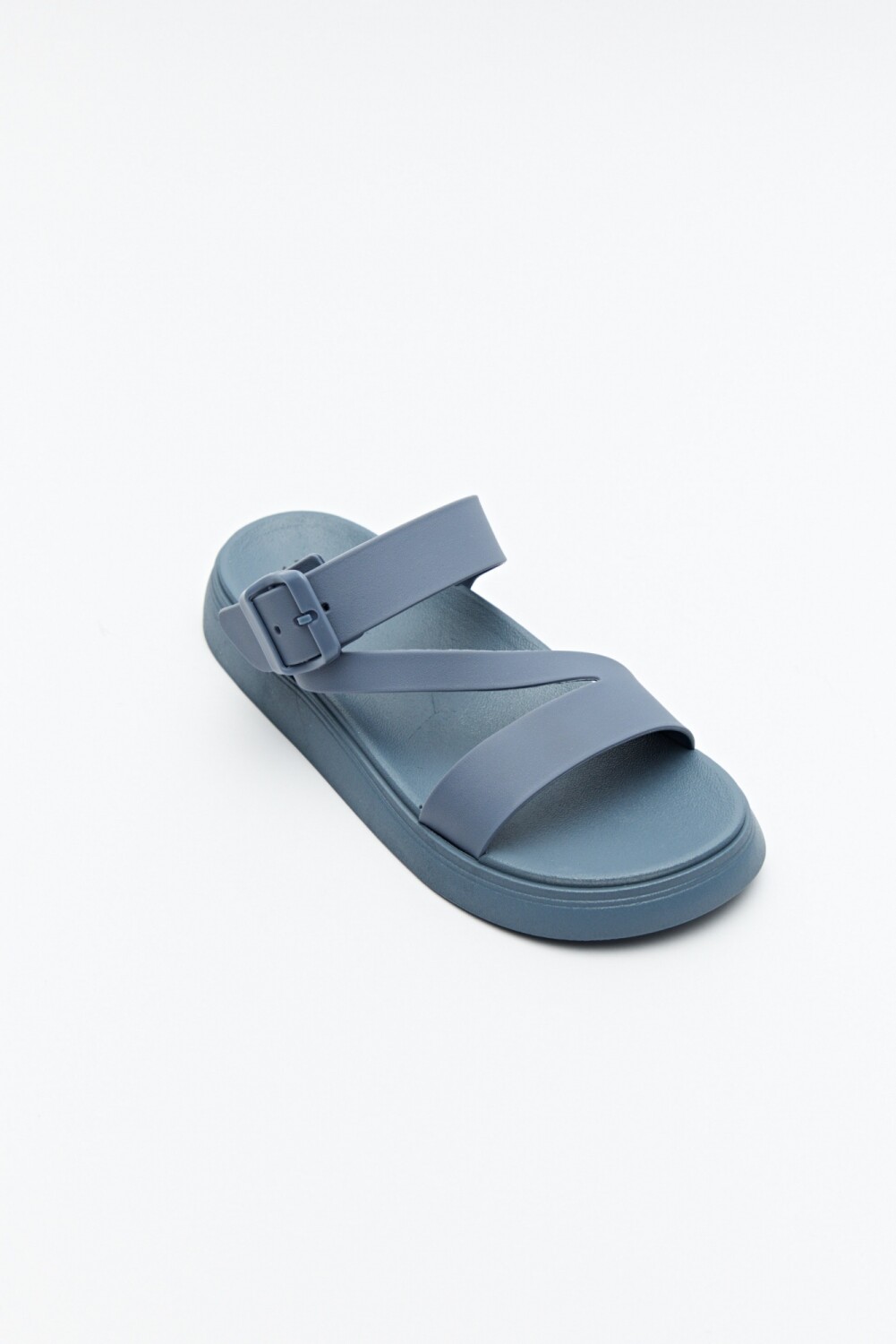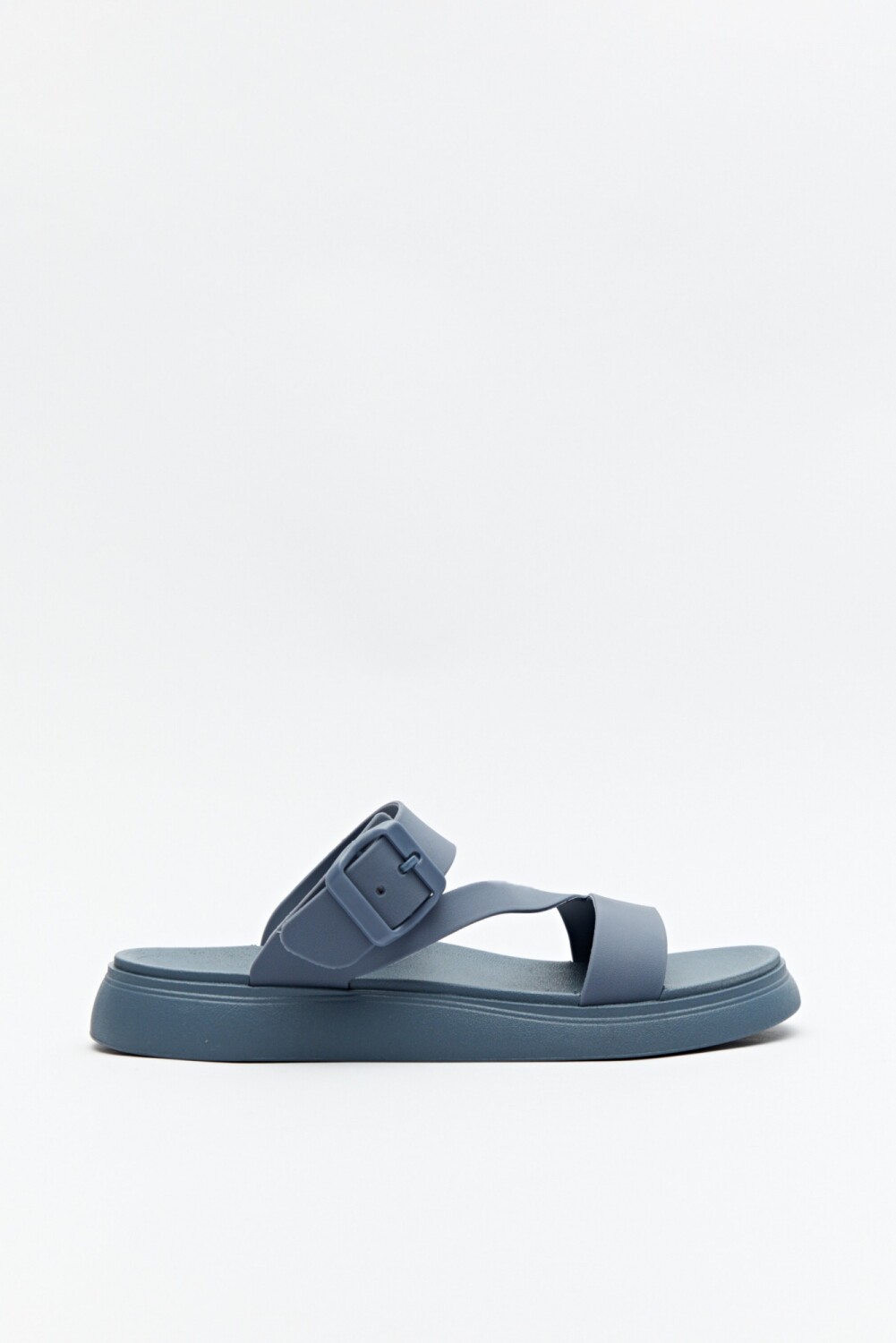 Sandalia con triple tira sobre el empeine y hebilla a tono.