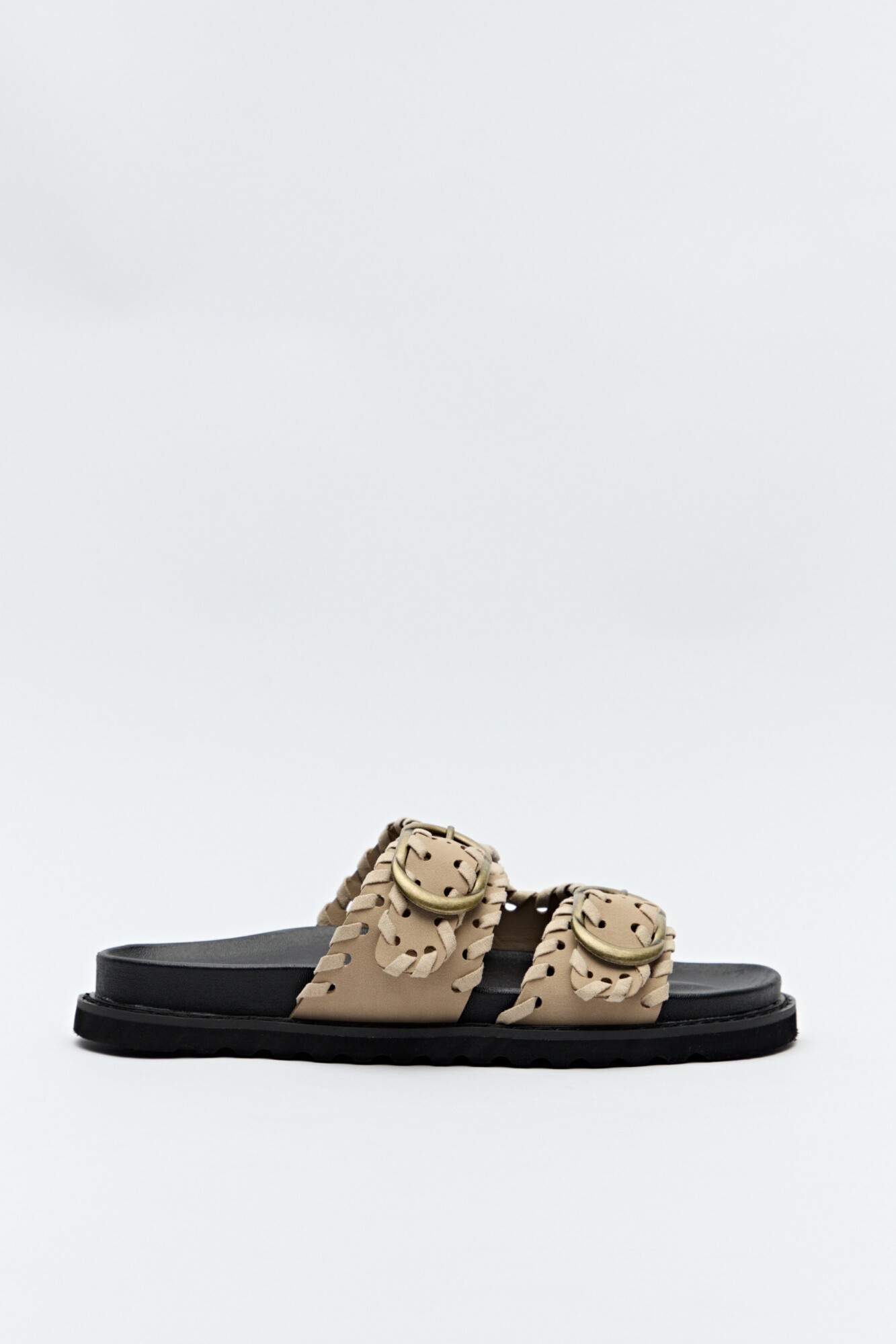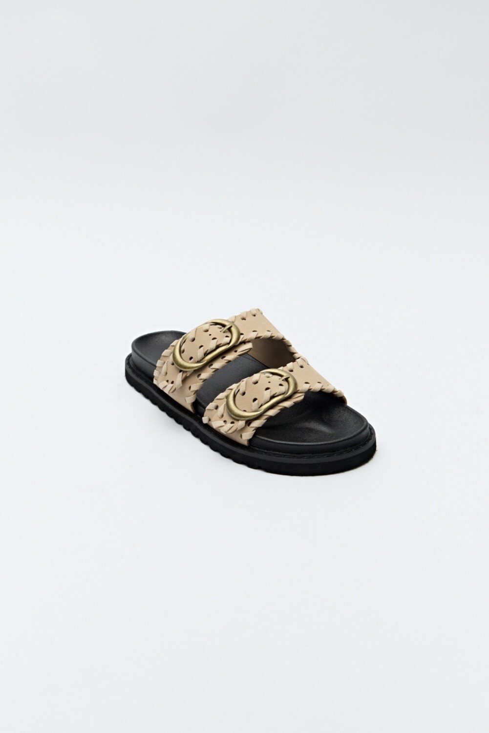 Sandalia tipo slide con doble tira ancha, detalle de costuras entrelazadas y hebillas metálicas ovaladas. Su diseño combina textura artesanal con una base liviana de goma dentada que aporta comodidad y estilo. Perfecta para un look relajado con personalidad, ideal para los días de verano.
