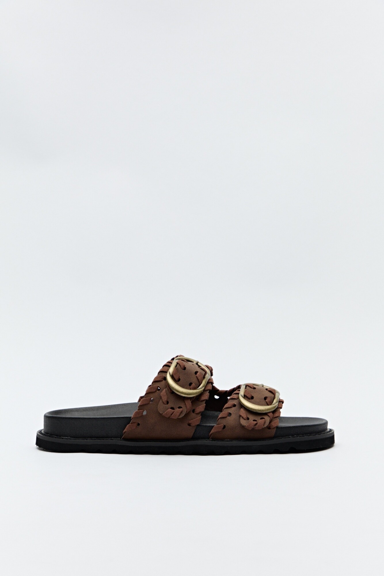 Sandalia tipo slide con doble tira ancha, detalle de costuras entrelazadas y hebillas metálicas ovaladas. Su diseño combina textura artesanal con una base liviana de goma dentada que aporta comodidad y estilo. Perfecta para un look relajado con personalidad, ideal para los días de verano.
