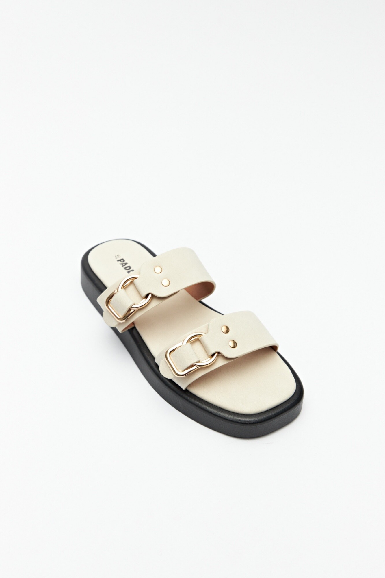 Sandalias de plataforma de 2,5cm de alto. Tiras en símil cuero con detalles metálicos.