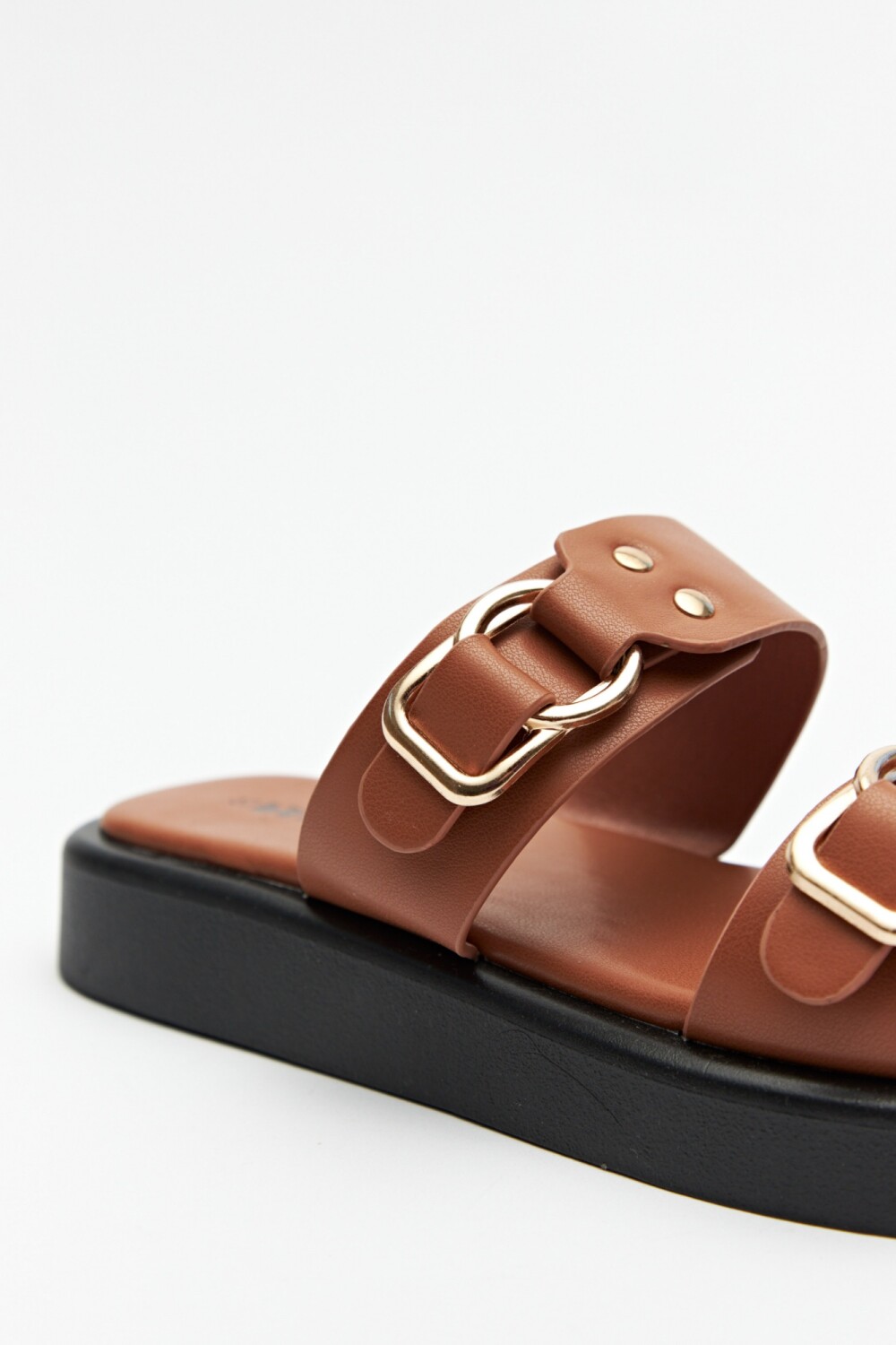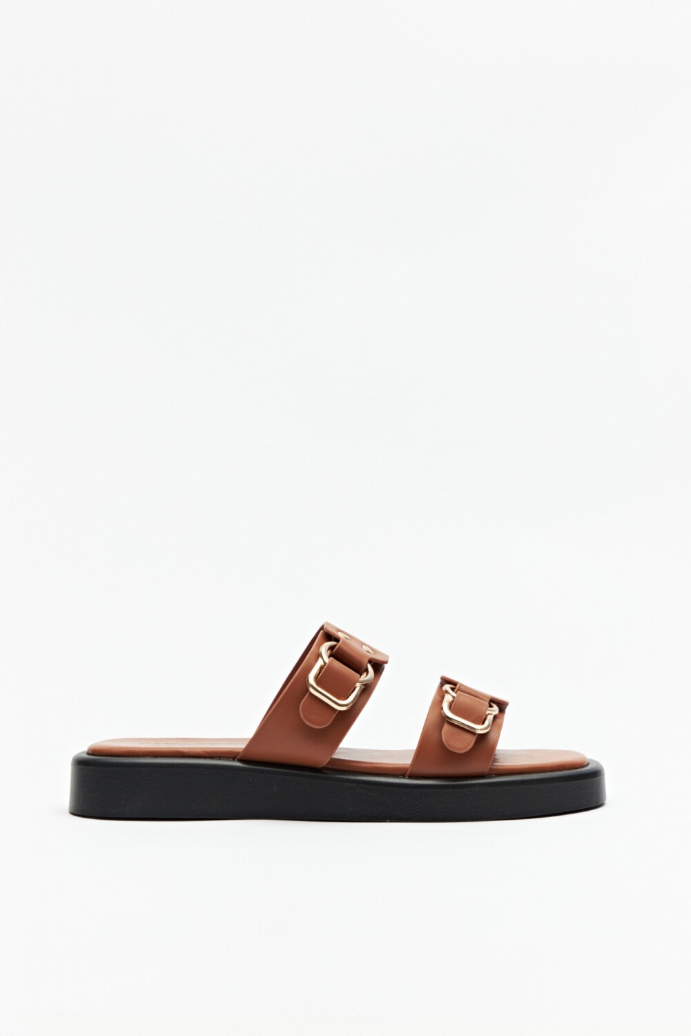 Sandalias de plataforma de 2,5cm de alto. Tiras en símil cuero con detalles metálicos.