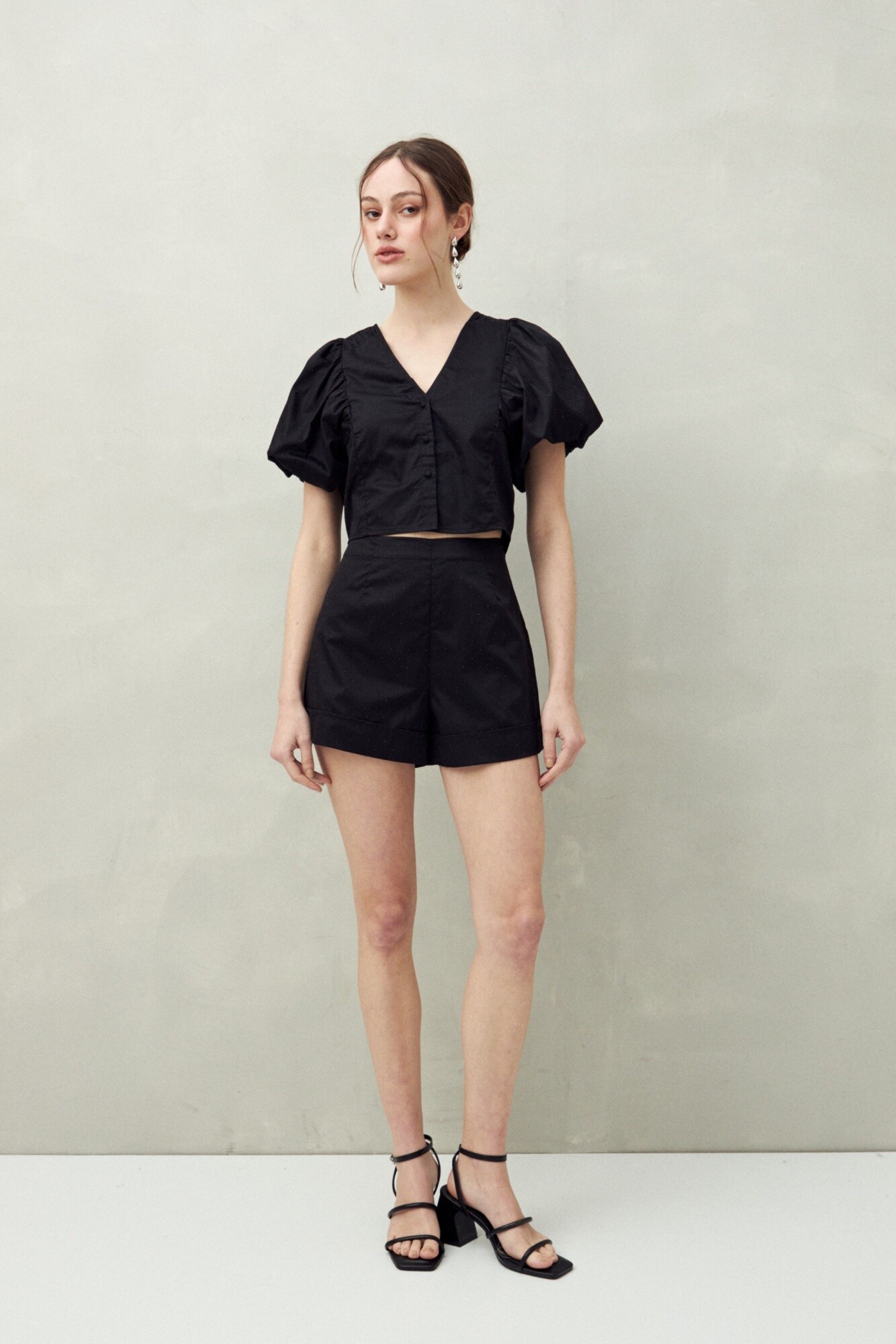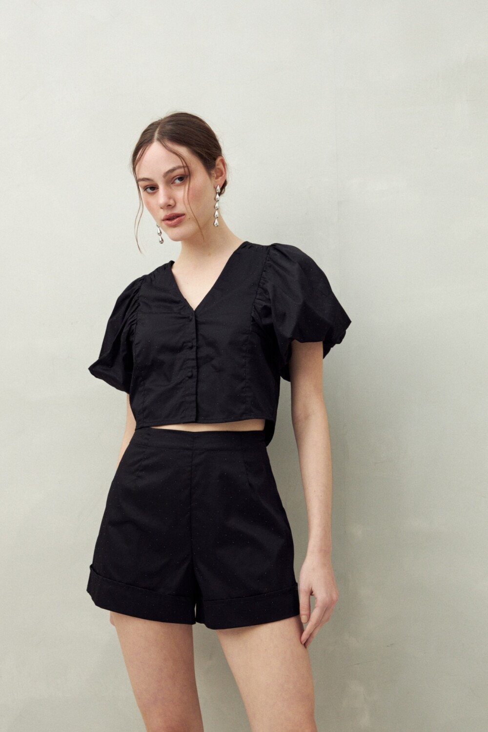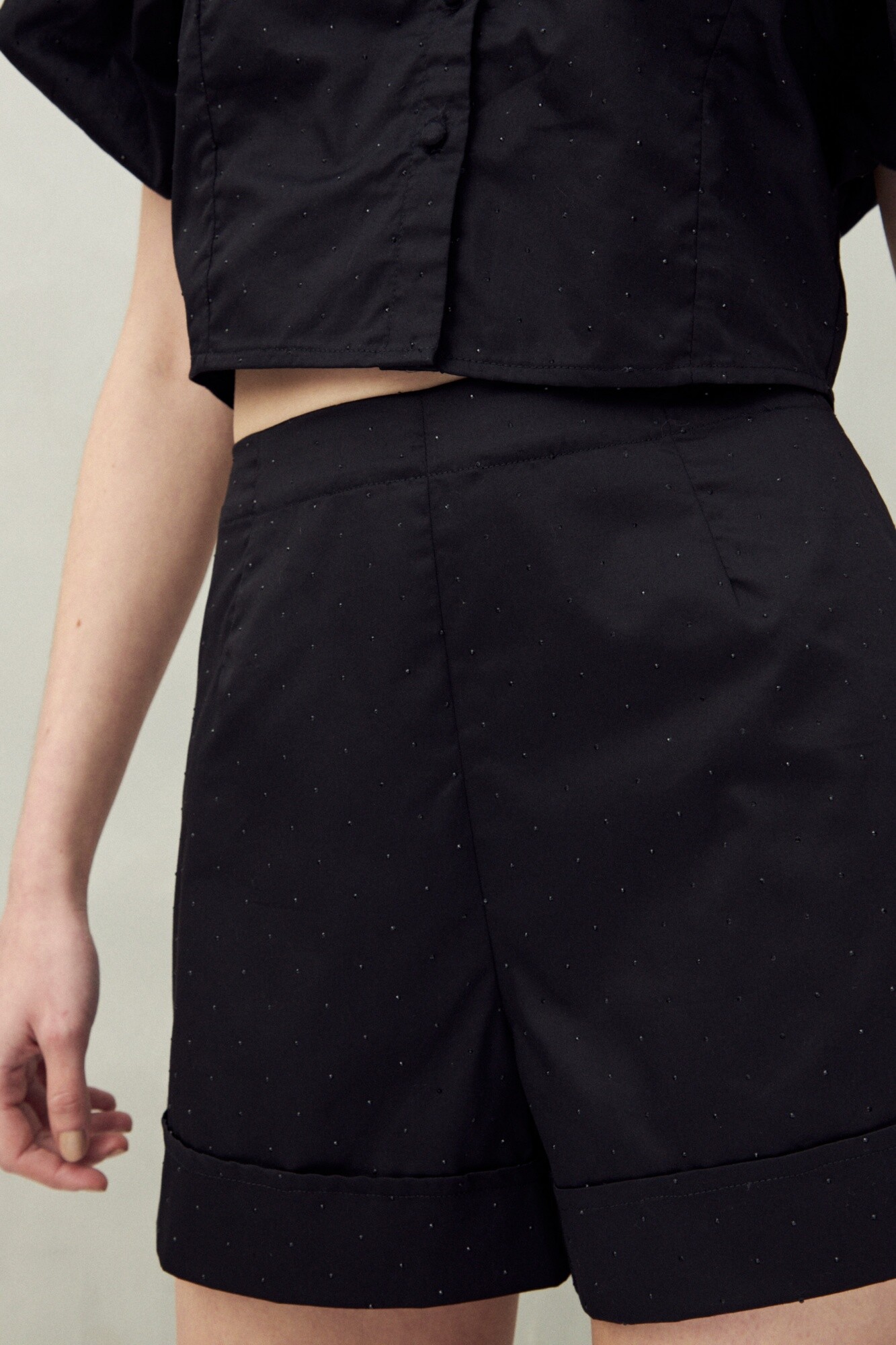 Short de algodón con un delicado trabajo de microapliques que suma brillo sutil y un acabado pulido. Su calce prolijo y el ruedo con vuelta elevan la silueta, convirtiéndolo en una opción versátil para armar looks coordinados o llevar como pieza protagonista en estilismos frescos y en tendencia.