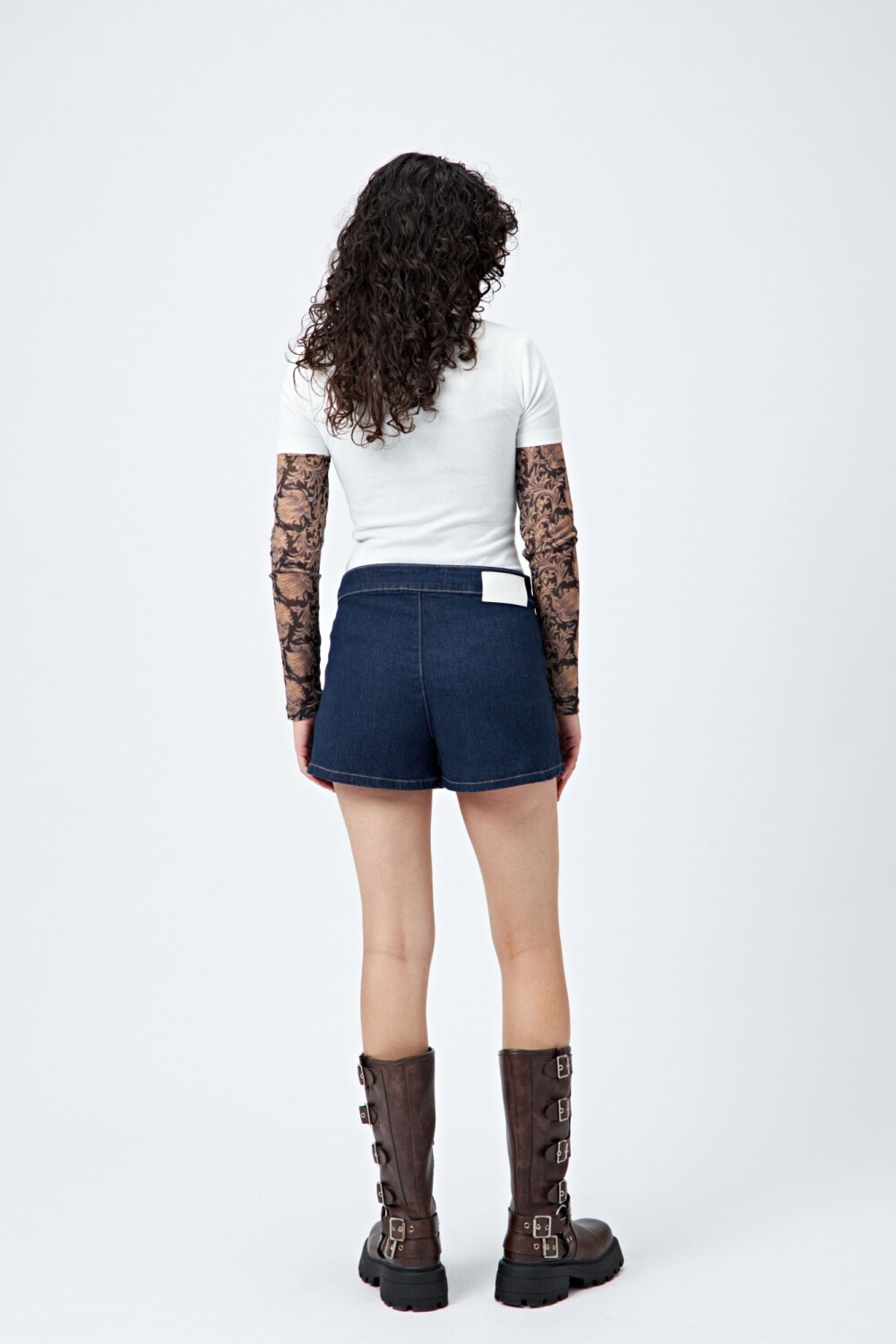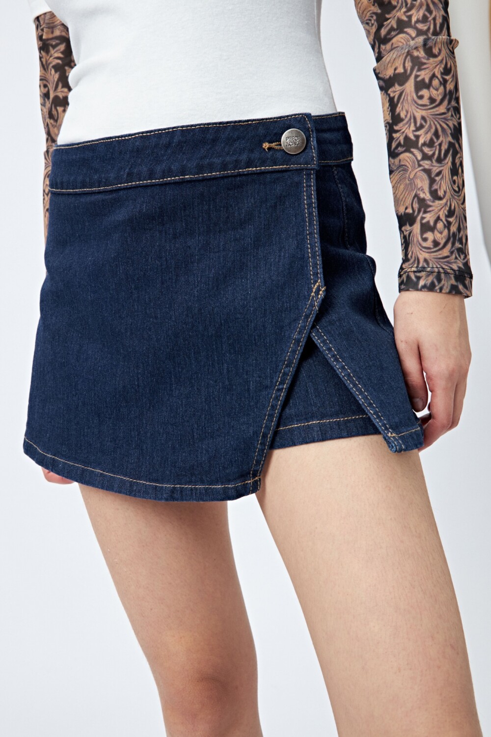 Short pollera denim con efecto cruzado en el frente, un detalle que lo vuelve actual y distintivo. De silueta mini y tiro medio, combina el look femenino de la falda con la practicidad del short, logrando una prenda versátil y trendy. Perfecta para un outfit urbano con botas o zapatillas.