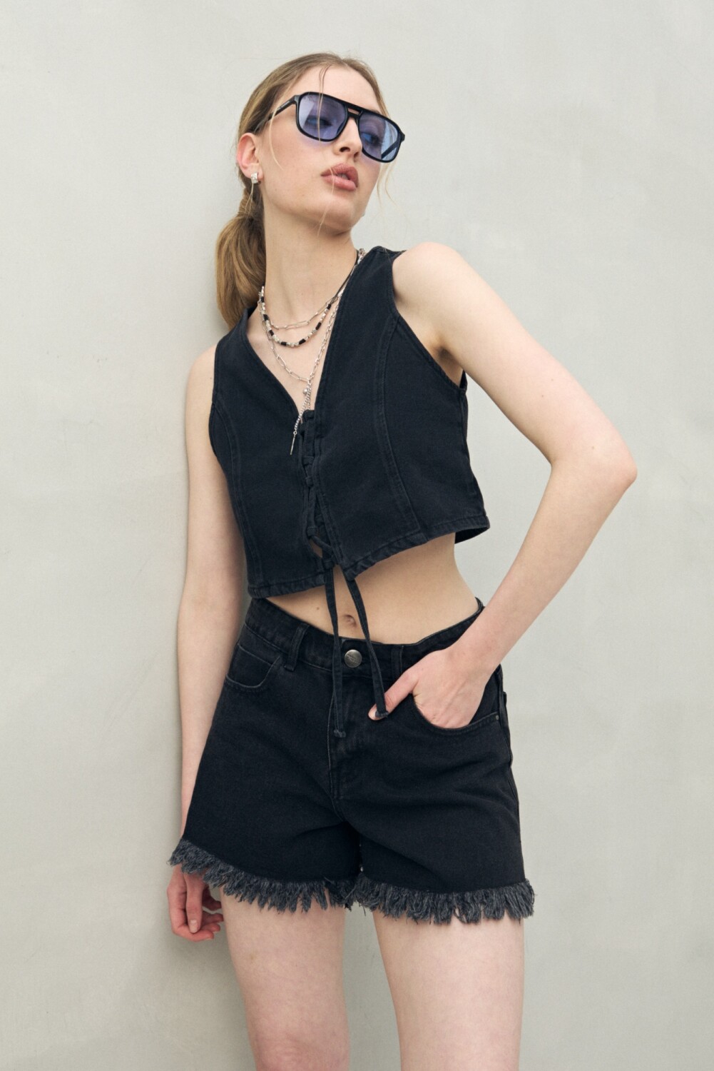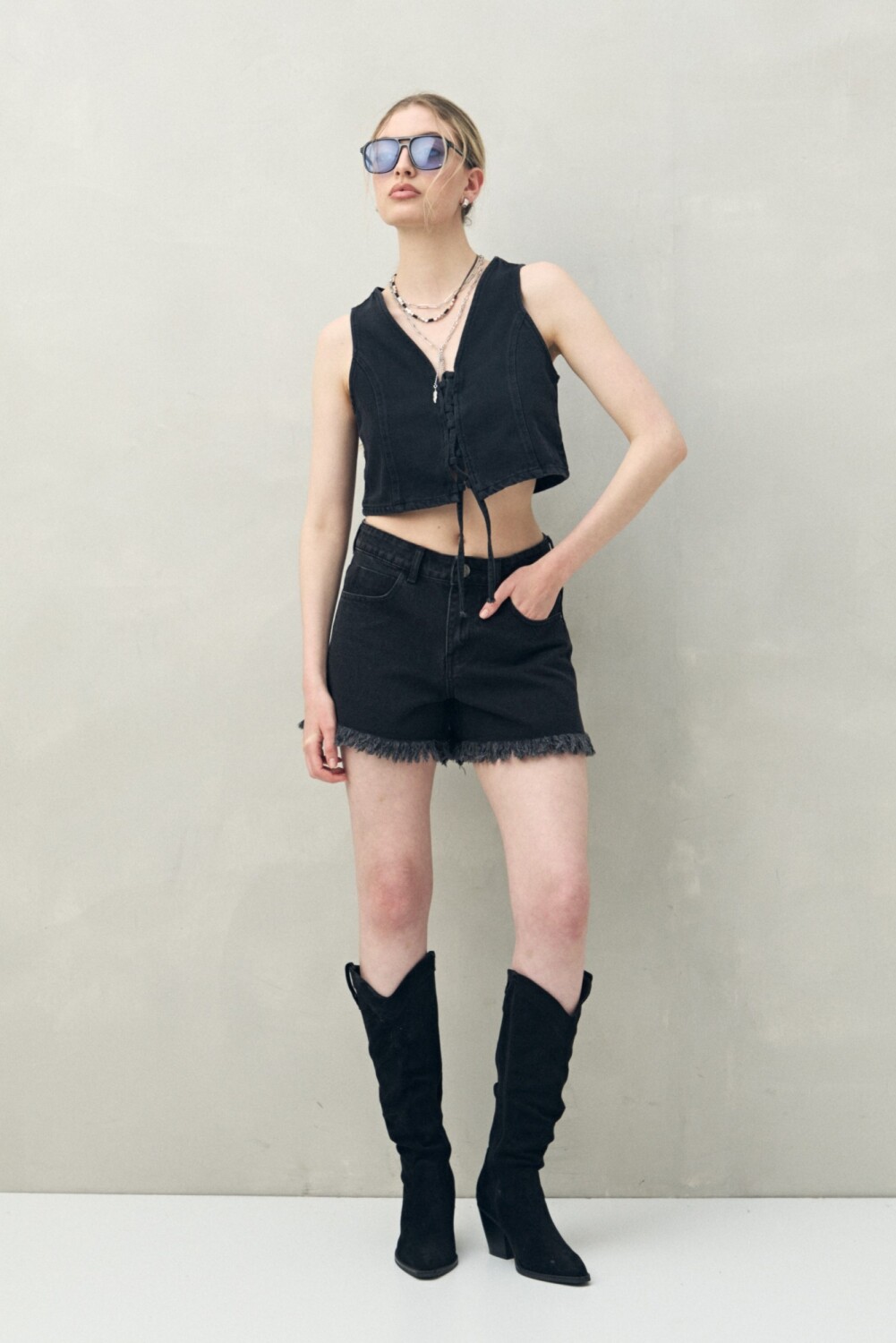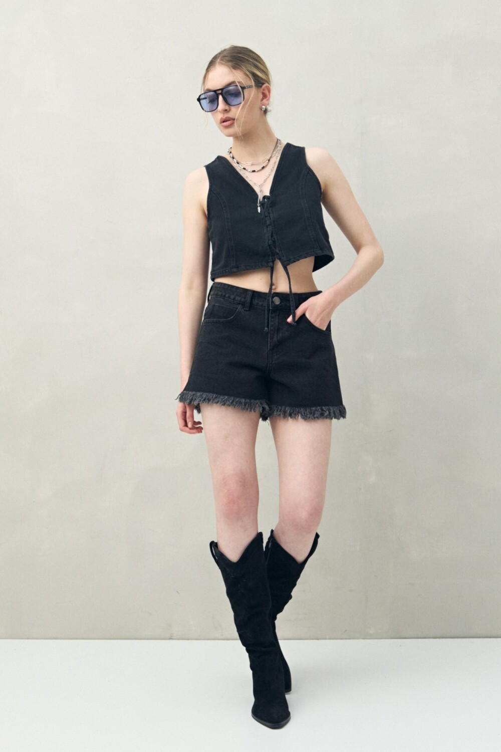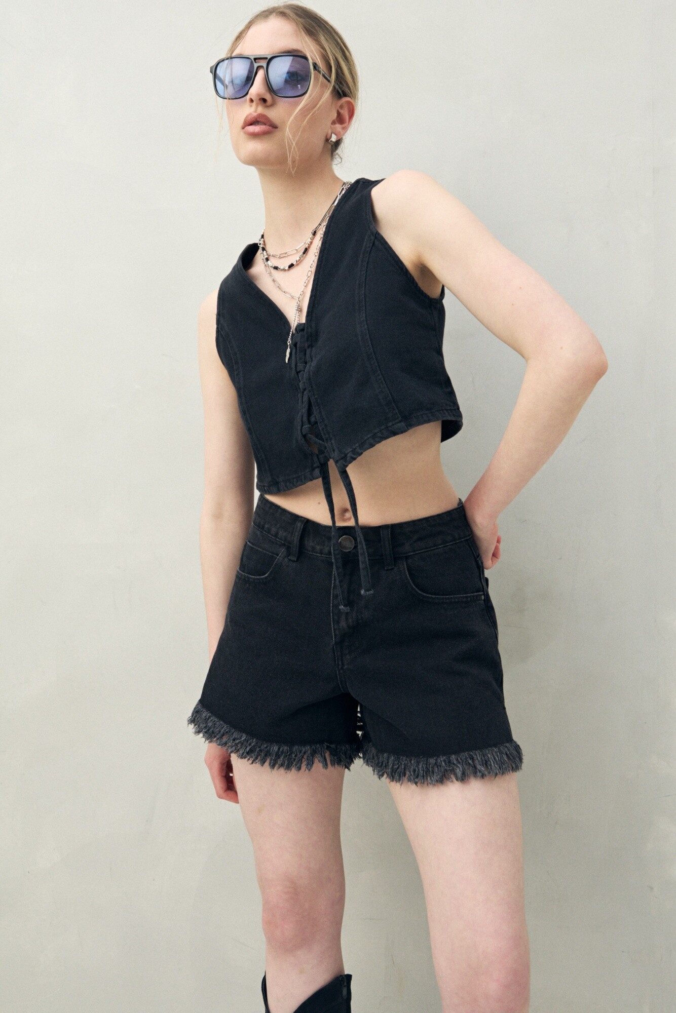Este short de jean con ruedo desflecado es la mezcla justa de rebeldía y estilo trendy. De tiro medio y silueta relajada, aporta un aire descontracturado que funciona tanto en looks festivaleros como en outfits urbanos del día a día.