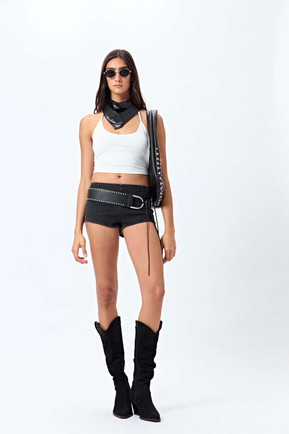 Microshort de tiro bajo con cierre metálico en la espalda. De calce ajustado y largo mini, realza la silueta con un estilo atrevido y urbano. Las costuras marcadas y el ruedo prolijo aportan un toque actual, ideal para combinar con tops tejidos o chalecos denim en looks de verano y de festival.