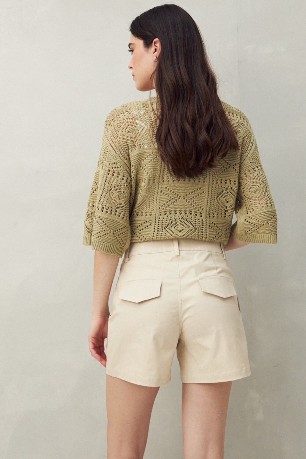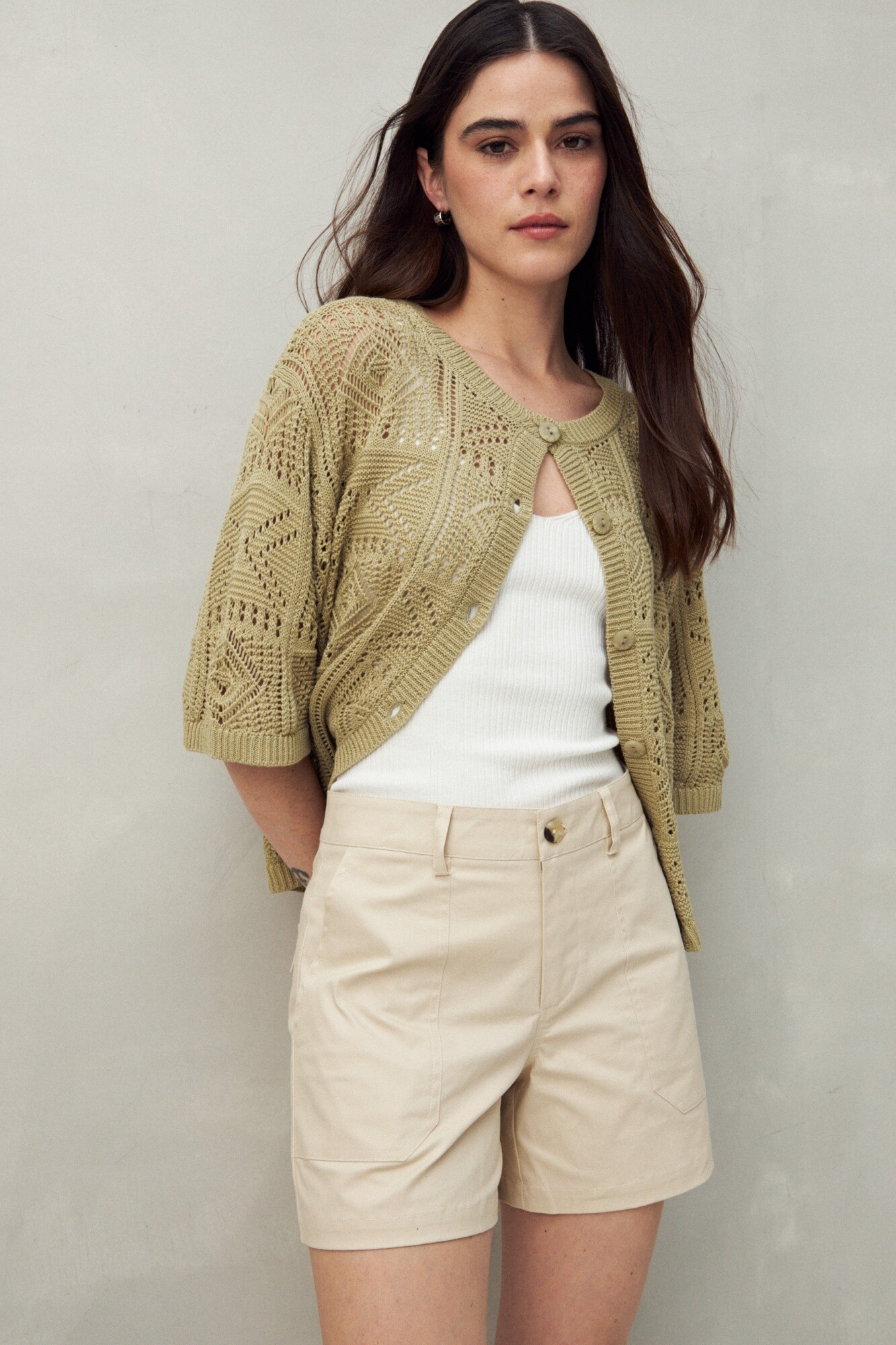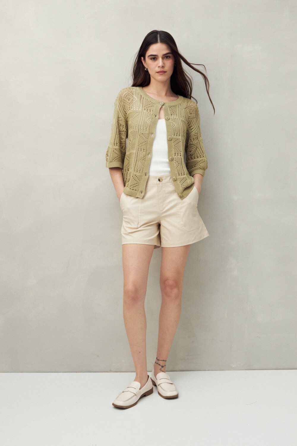 Short de algodón con un fit cómodo y práctico, diseñado para el día a día. De tiro medio, cuenta con bolsillos delanteros y traseros que refuerzan su estilo utilitario sin perder simpleza. Una prenda versátil y atemporal, ideal para armar looks frescos y relajados de verano.