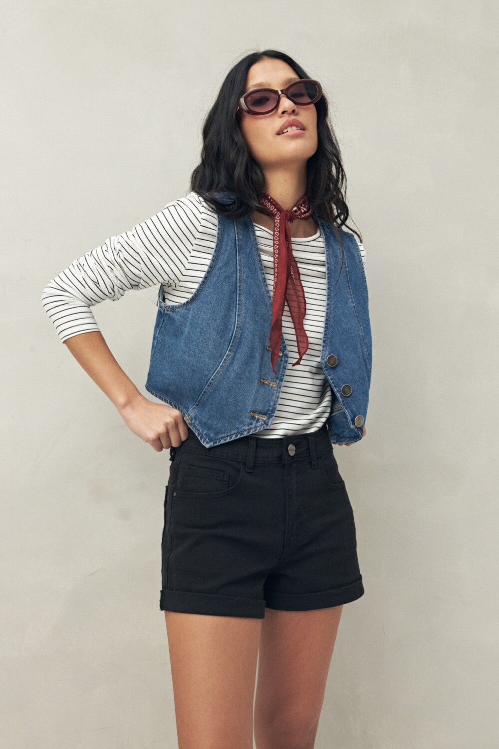 Short de denim con dobladillo fijo y bolsillos delanteros y traseros que suman practicidad al diseño. Confeccionado en un textil con caída ligera y un toque de elasticidad, combina comodidad y estilo. Ideal para looks relajados de verano, ya sea con tops tejidos, camisas livianas o remeras básicas.