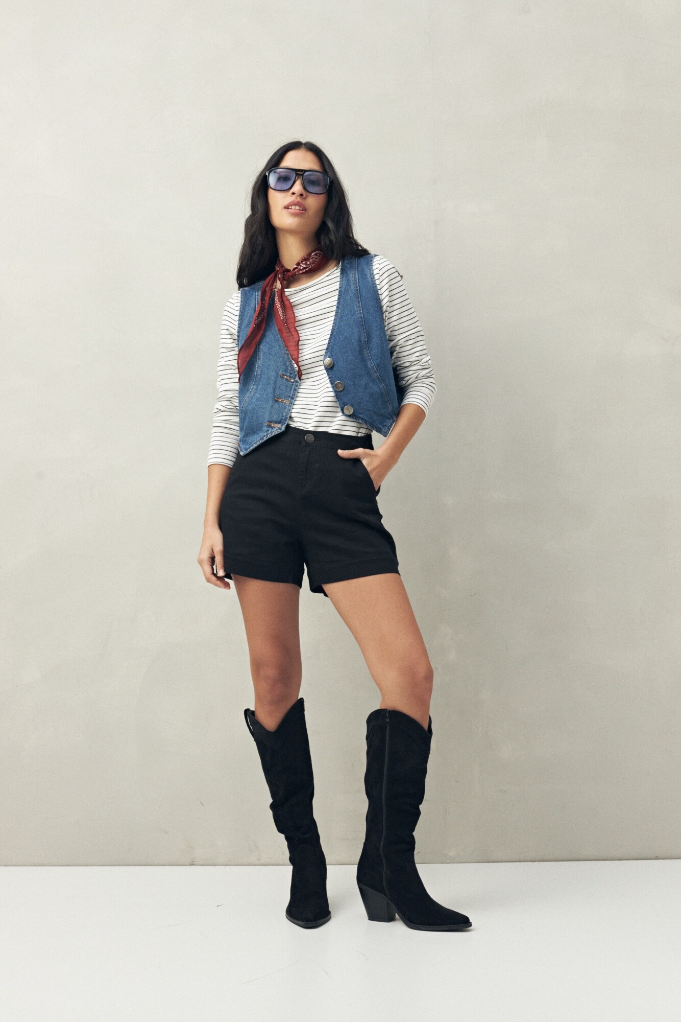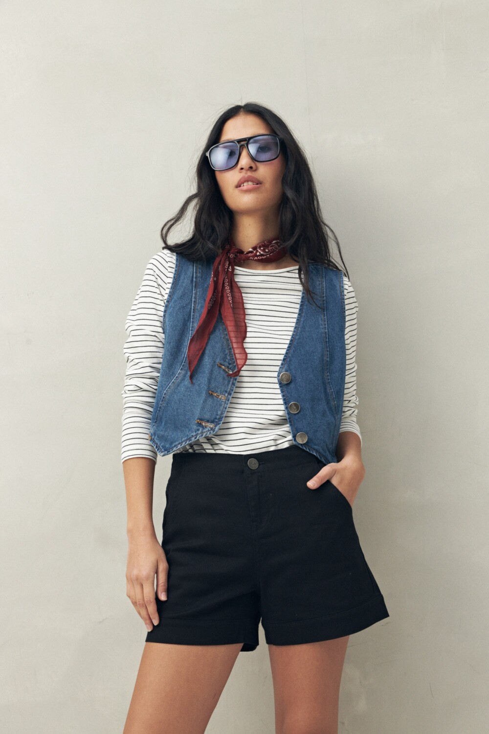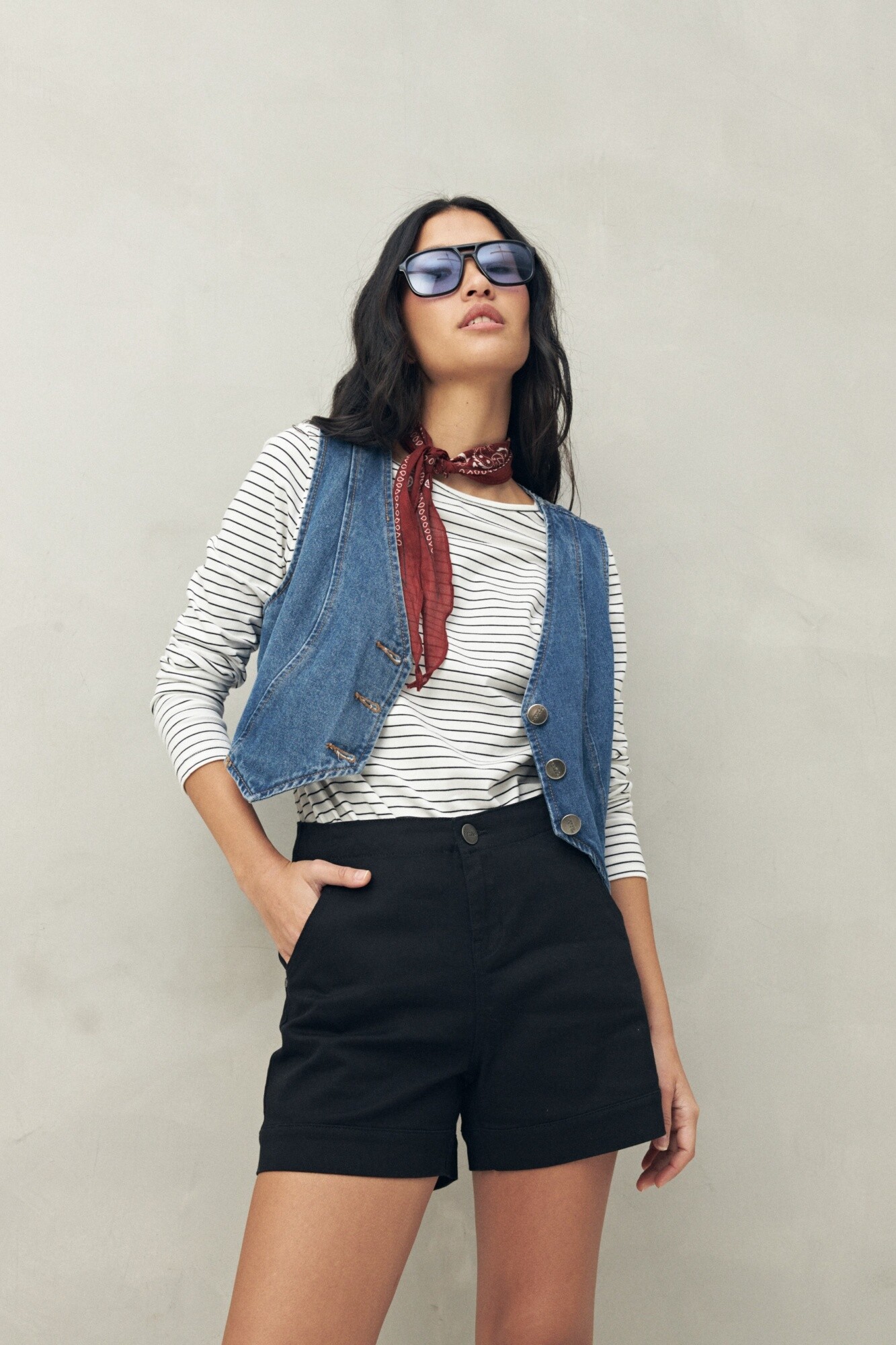 Short de tiro medio y calce al cuerpo, con dobladillos para un acabado moderno. Gracias a su toque de elastano, ofrece comodidad y libertad de movimiento sin perder estructura. Una prenda versátil para looks casuales, perfecta para combinar con sweaters ligeros, camisas o remeras básicas.