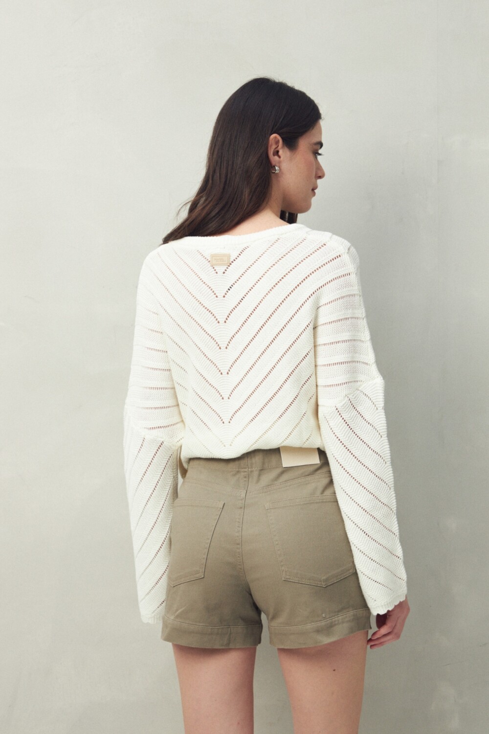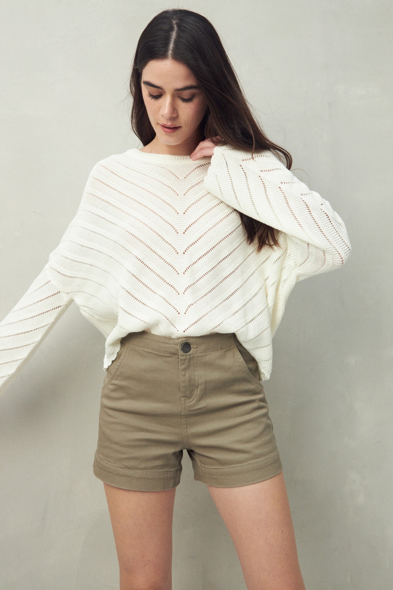 Short de tiro medio y calce al cuerpo, con dobladillos para un acabado moderno. Gracias a su toque de elastano, ofrece comodidad y libertad de movimiento sin perder estructura. Una prenda versátil para looks casuales, perfecta para combinar con sweaters ligeros, camisas o remeras básicas.