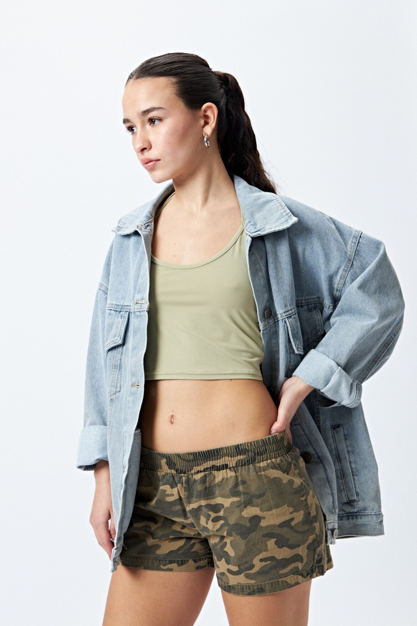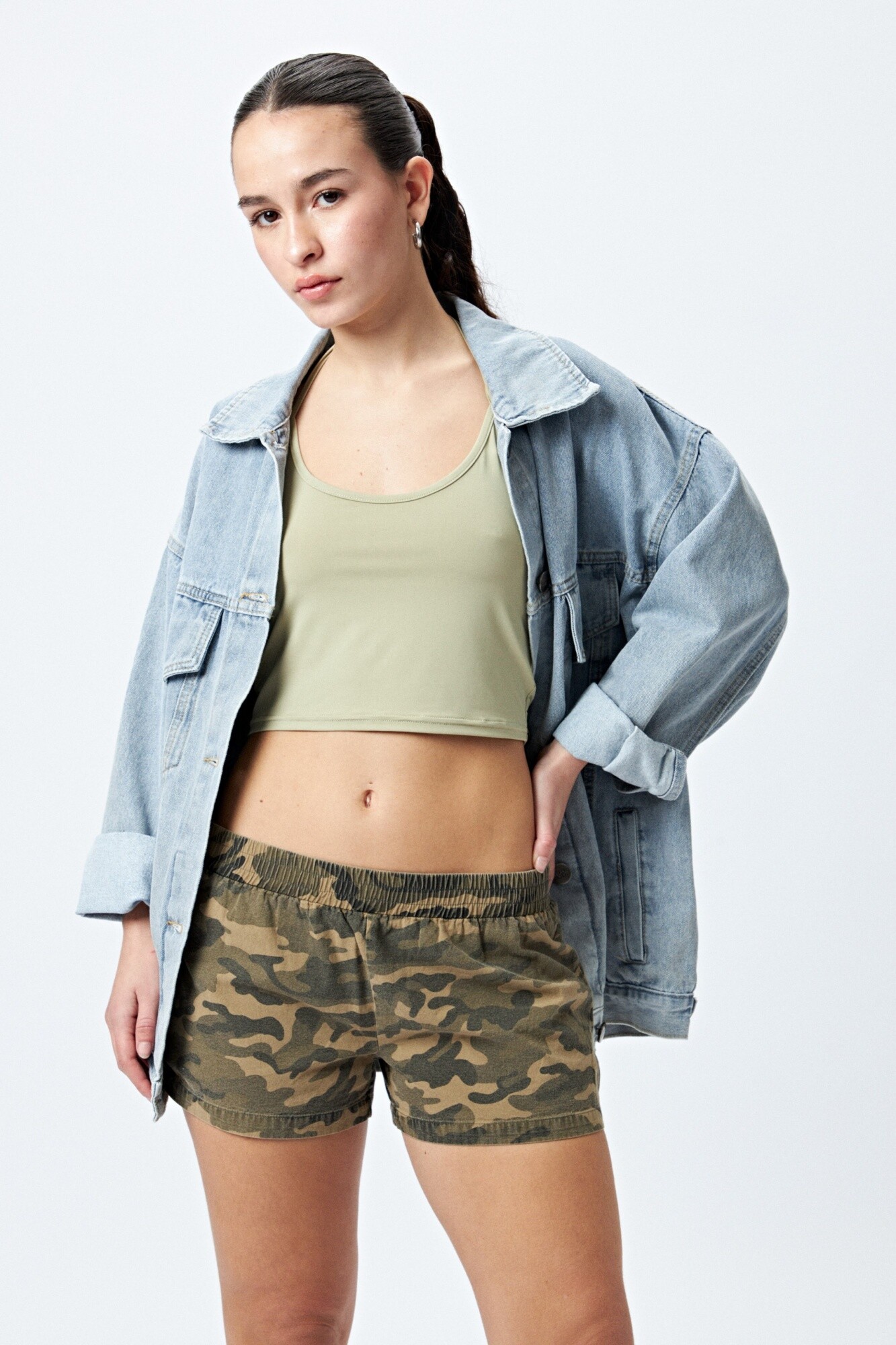 Short camuflado de tiro bajo con cintura elástica, pensado para un look cómodo y canchero. Su diseño utilitario y relajado lo convierte en un básico versátil, ideal para sumar onda urbana a los outfits de verano.