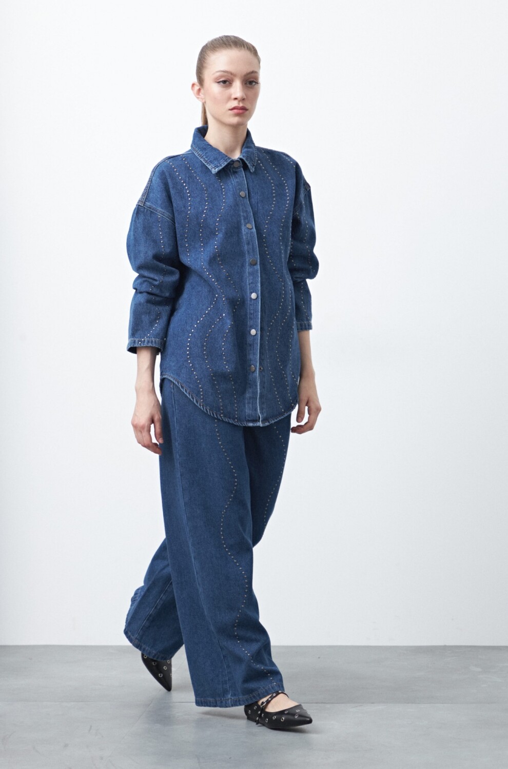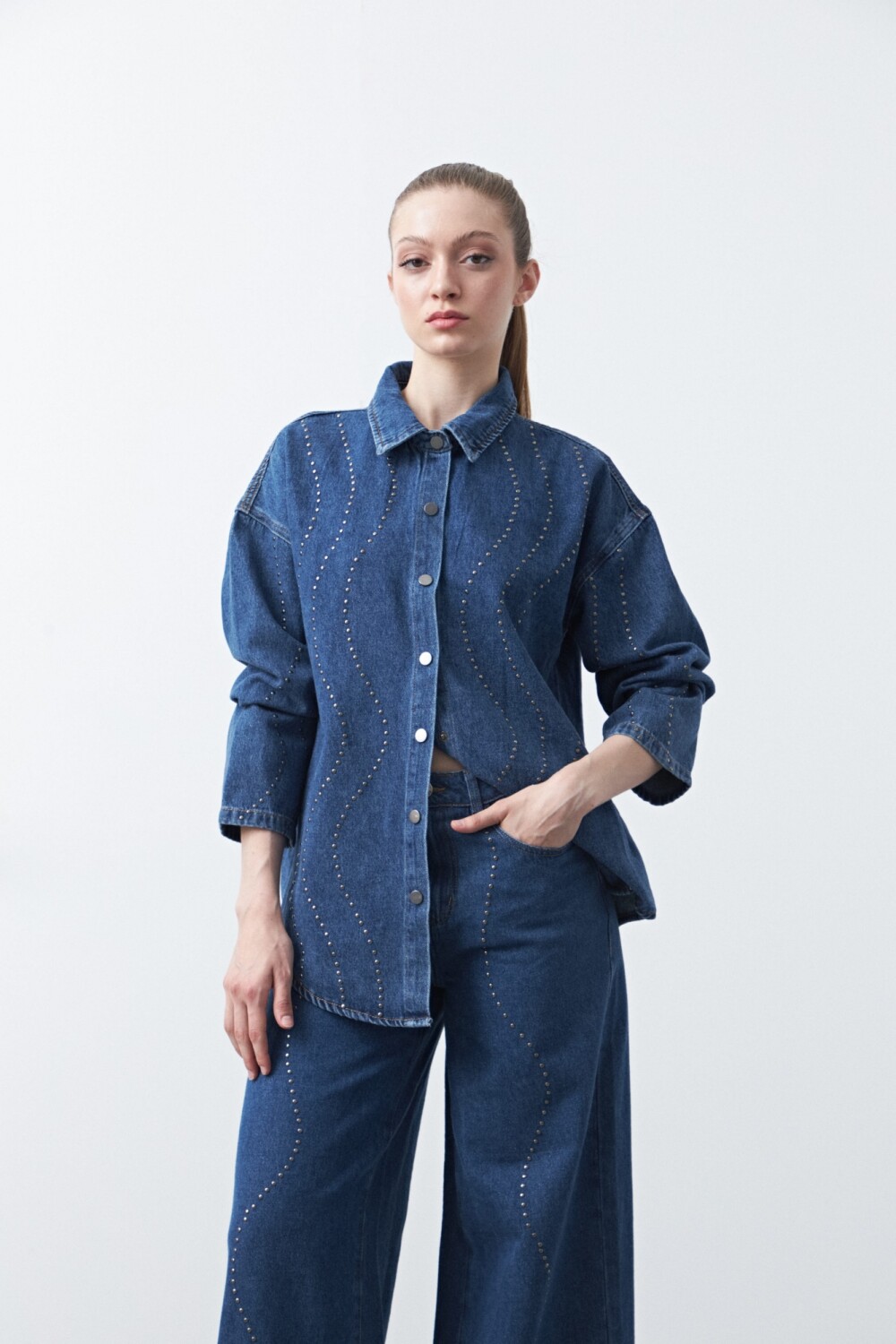 Sobrecamisa de jean de silueta relajada, diseñada para funcionar como capa liviana y versátil dentro del guardarropa. El diseño se destaca por las tachas aplicadas en líneas orgánicas que recorren la prenda, aportando textura y un detalle diferencial sin perder sobriedad. Su estructura permite usarla tanto abierta como cerrada, adaptándose a distintos estilos y momentos del día.