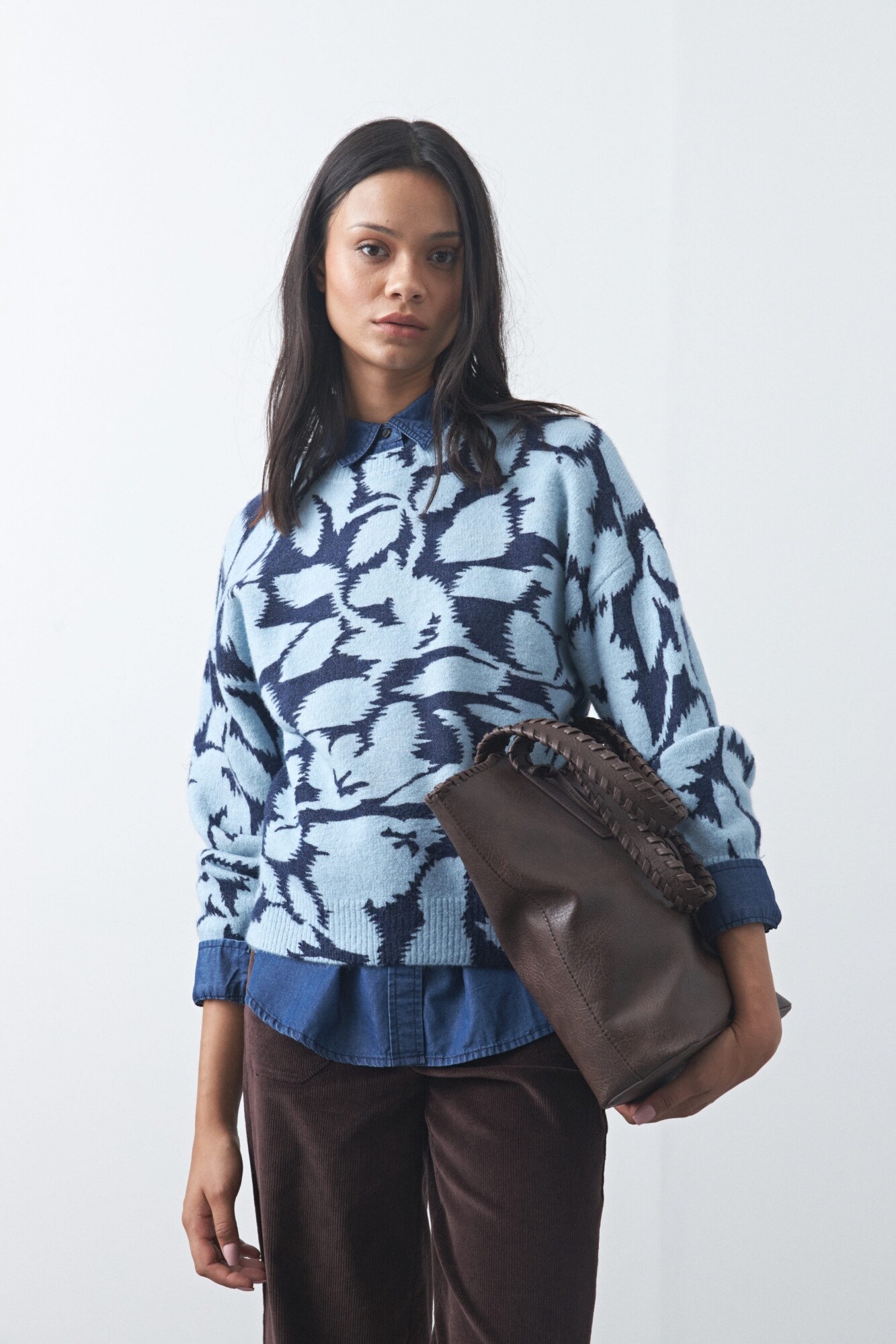 Sweater de punto con diseño estampado de alto impacto, ideal para elevar looks cotidianos con un toque moderno. Su silueta relajada y mangas cómodas aportan versatilidad, mientras que el cuello a la base y las terminaciones acanaladas mantienen una estructura equilibrada. Perfecto para combinar con camisas por debajo y sumar capas con estilo.