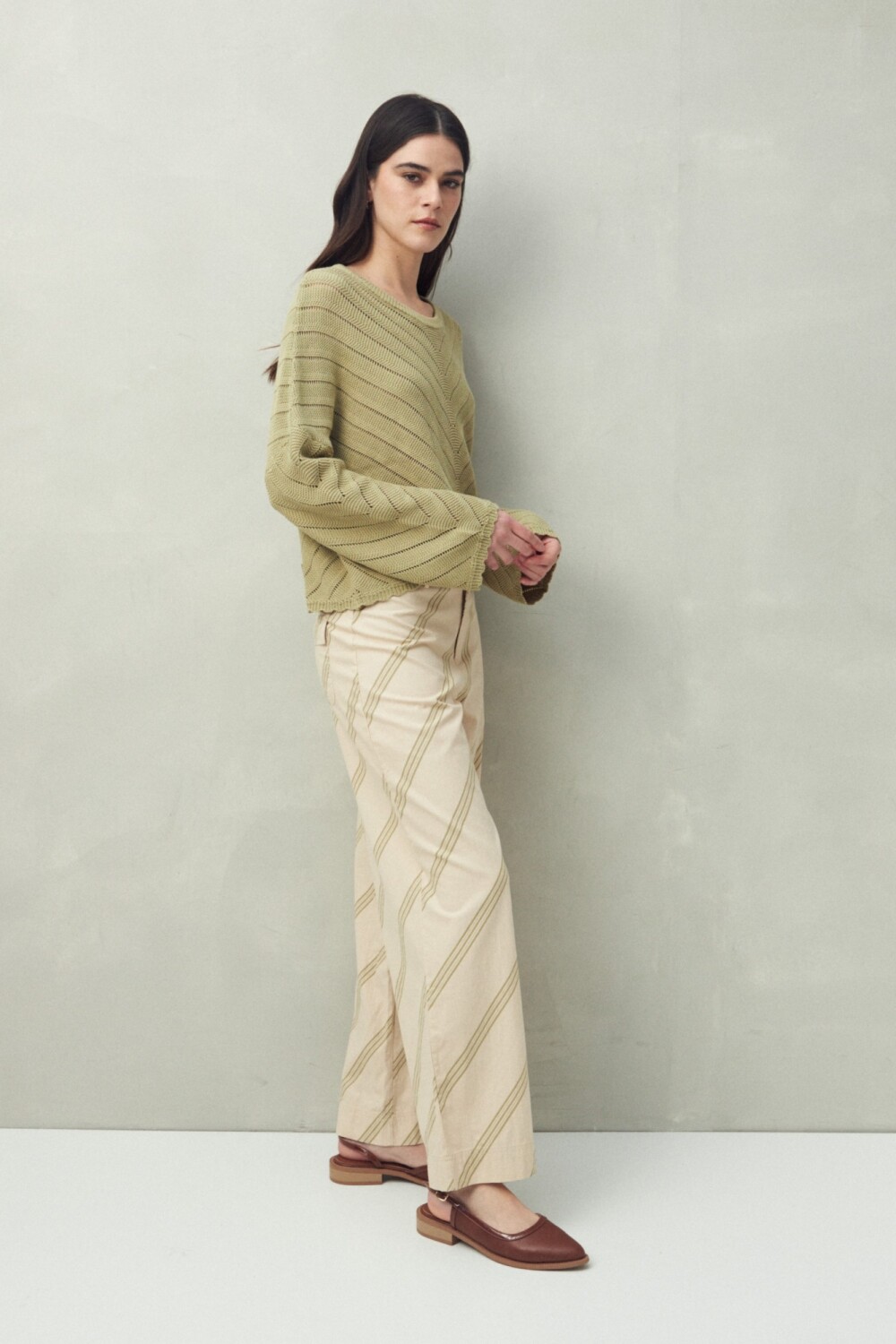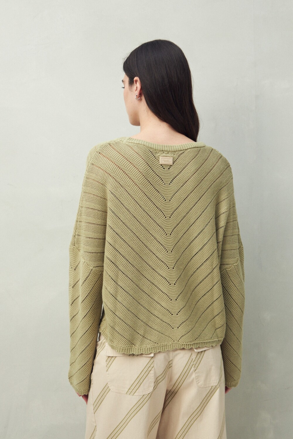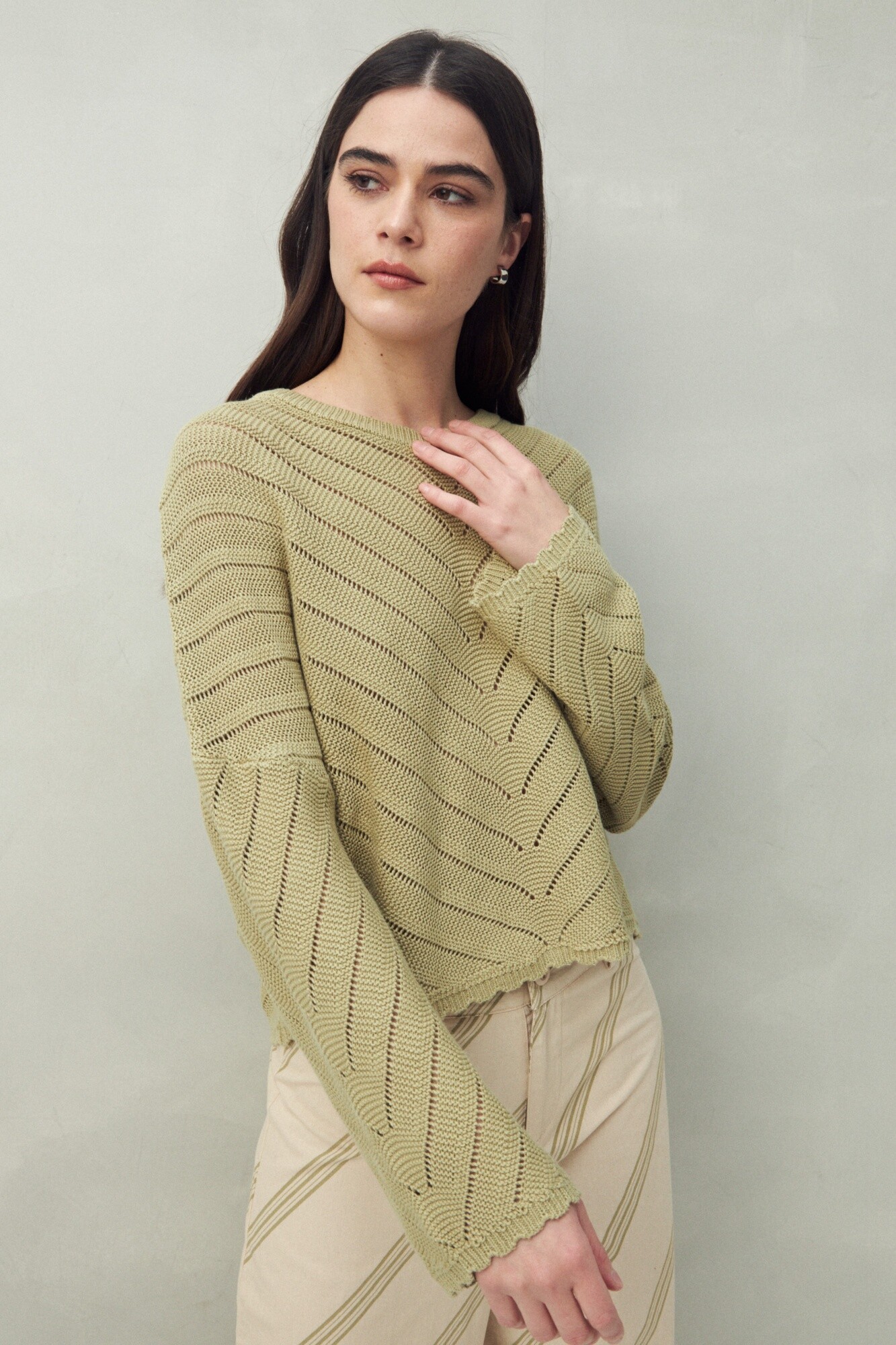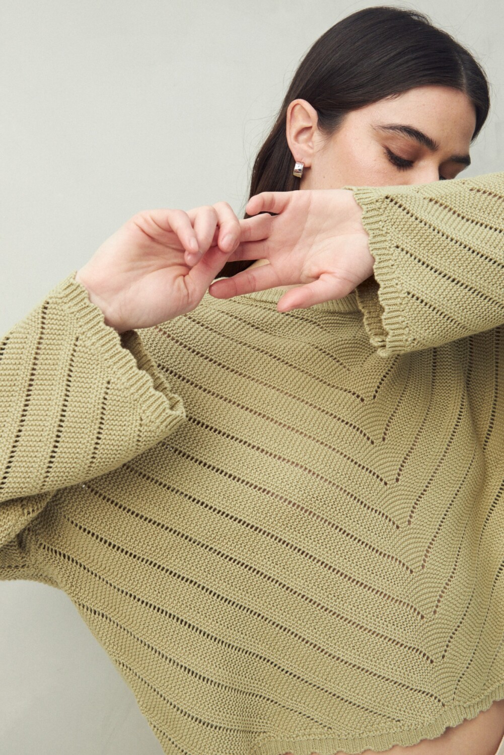 Sweater calado con diseño de líneas diagonales en relieve. Cuenta con delicados bordados en las terminaciones de las mangas acampanadas. Ideal para sumar textura y frescura a tus looks. Su silueta relaxed lo convierte en un aliado versátil para superponer con camisas o llevar solo.