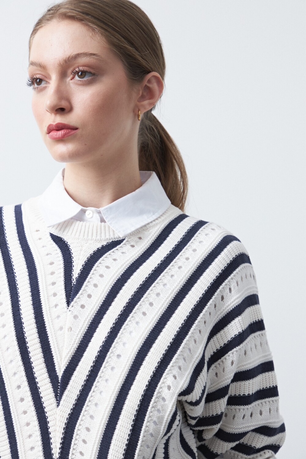 Sweater tramado y calado a rayas, de diseño trabajado que combina textura y patrón para lograr una estética sofisticada y actual. El tejido calado aporta liviandad visual, mientras que las rayas en disposición diagonal suman dinamismo y un guiño al estilo clásico reinterpretado. De calce cómodo y terminaciones prolijas, es una prenda versátil que funciona tanto en looks urbanos como en propuestas más pulidas, ideal para sumar interés sin sobrecargar el outfit.