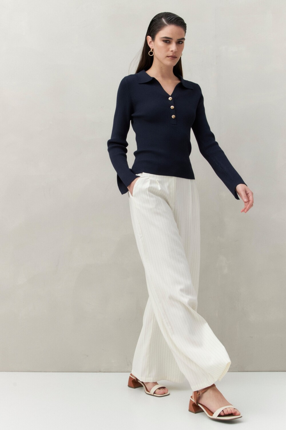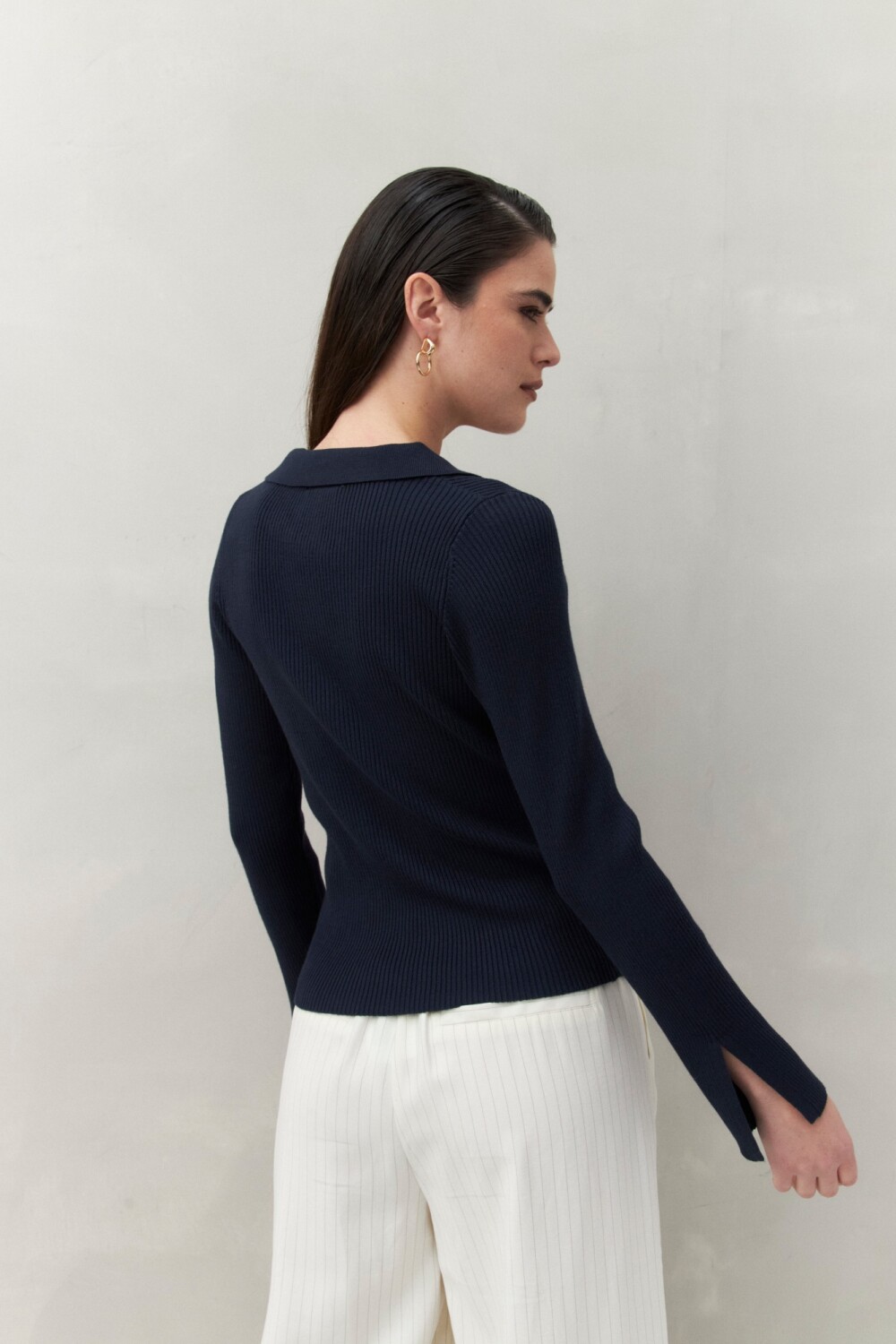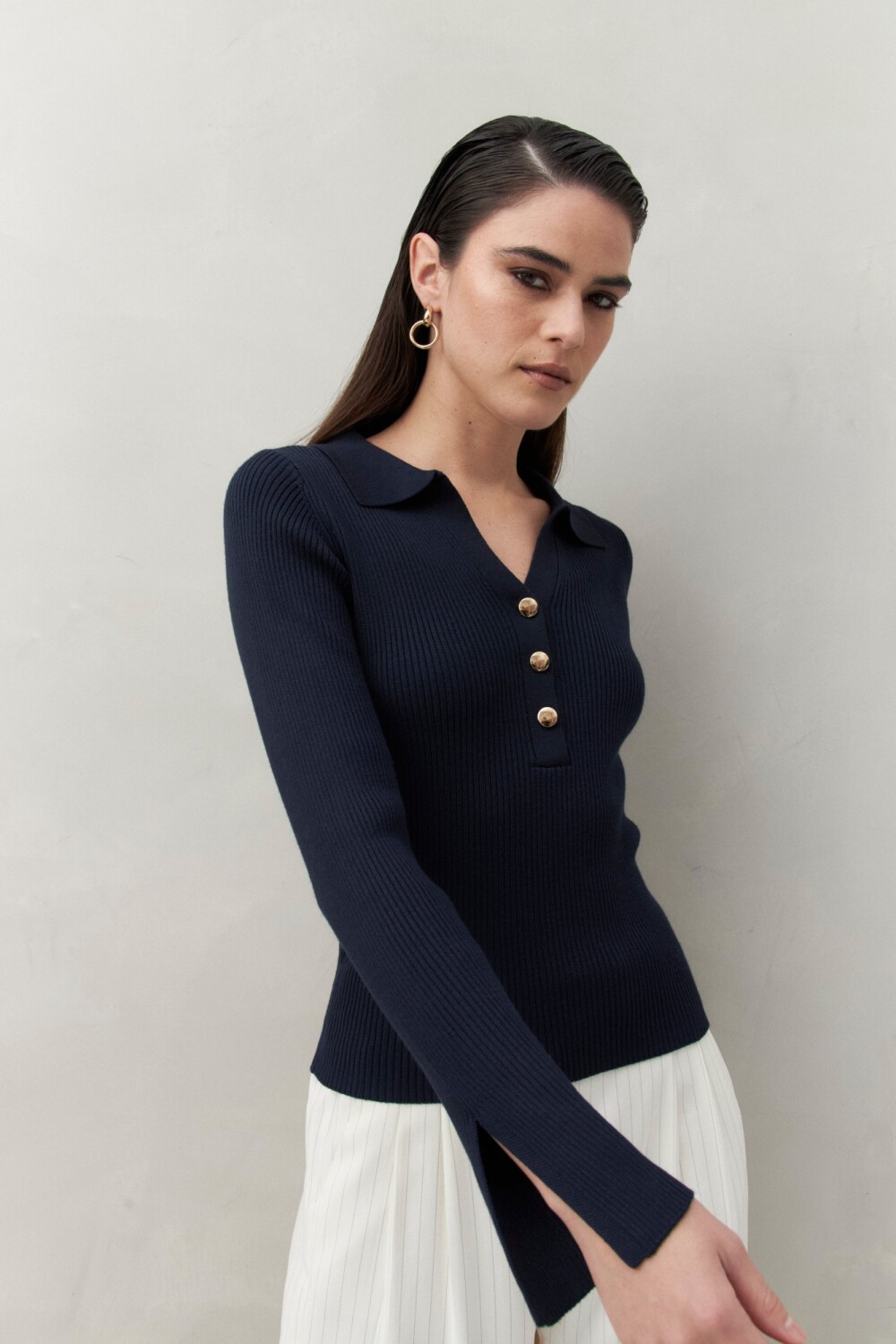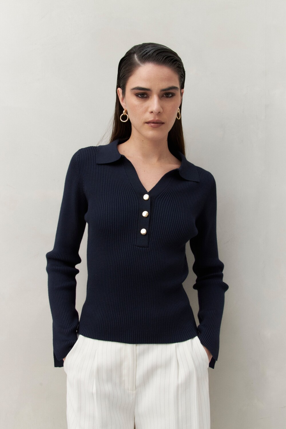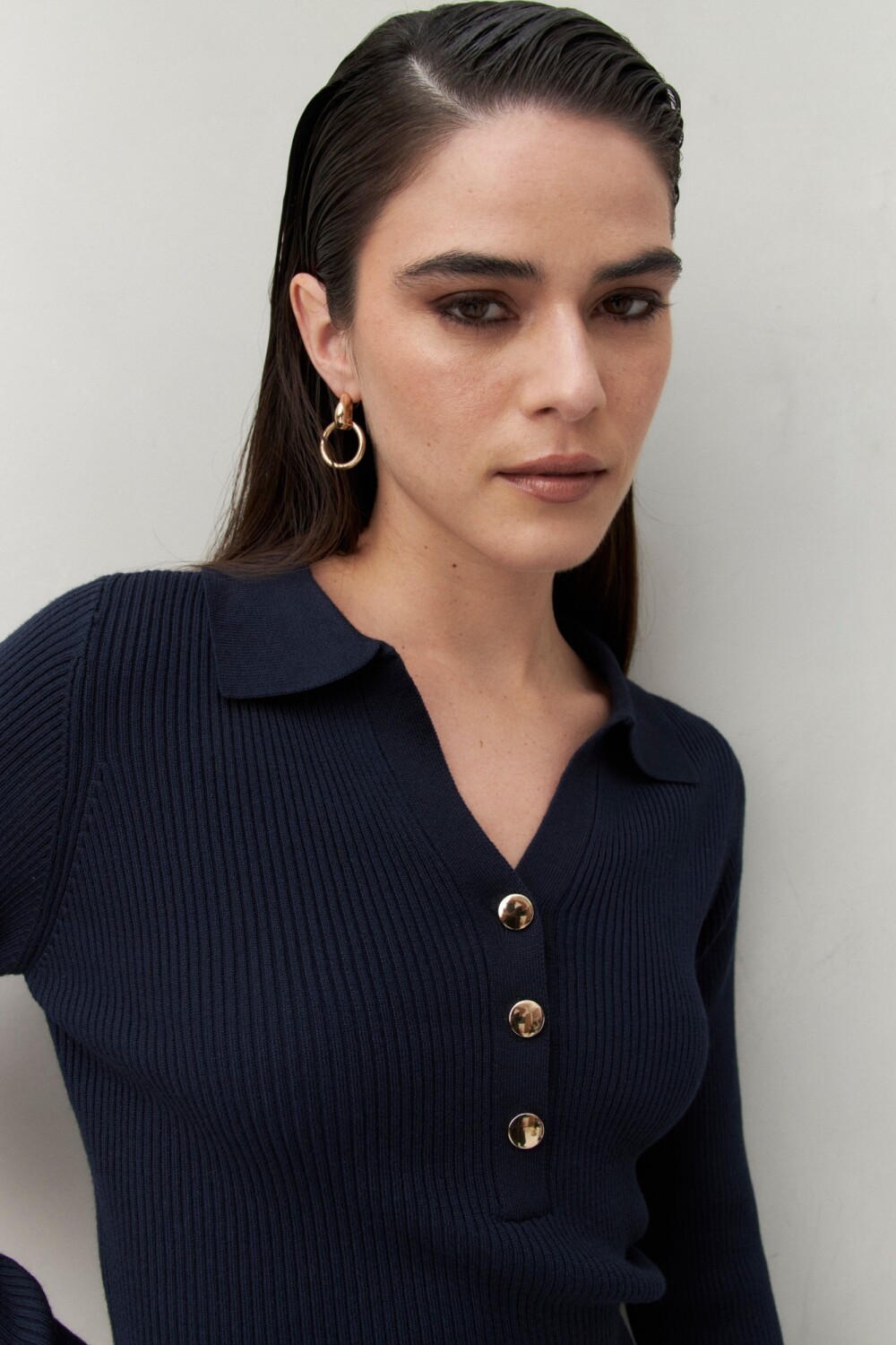 Sweater de punto acanalado con cuello tipo polo y botonadura frontal de botones metálicos que realzan su diseño clásico con un twist moderno. De mangas largas con terminación en pequeñas aberturas, se adapta a looks elegantes o casuales, siendo una prenda versátil para distintas ocasiones.