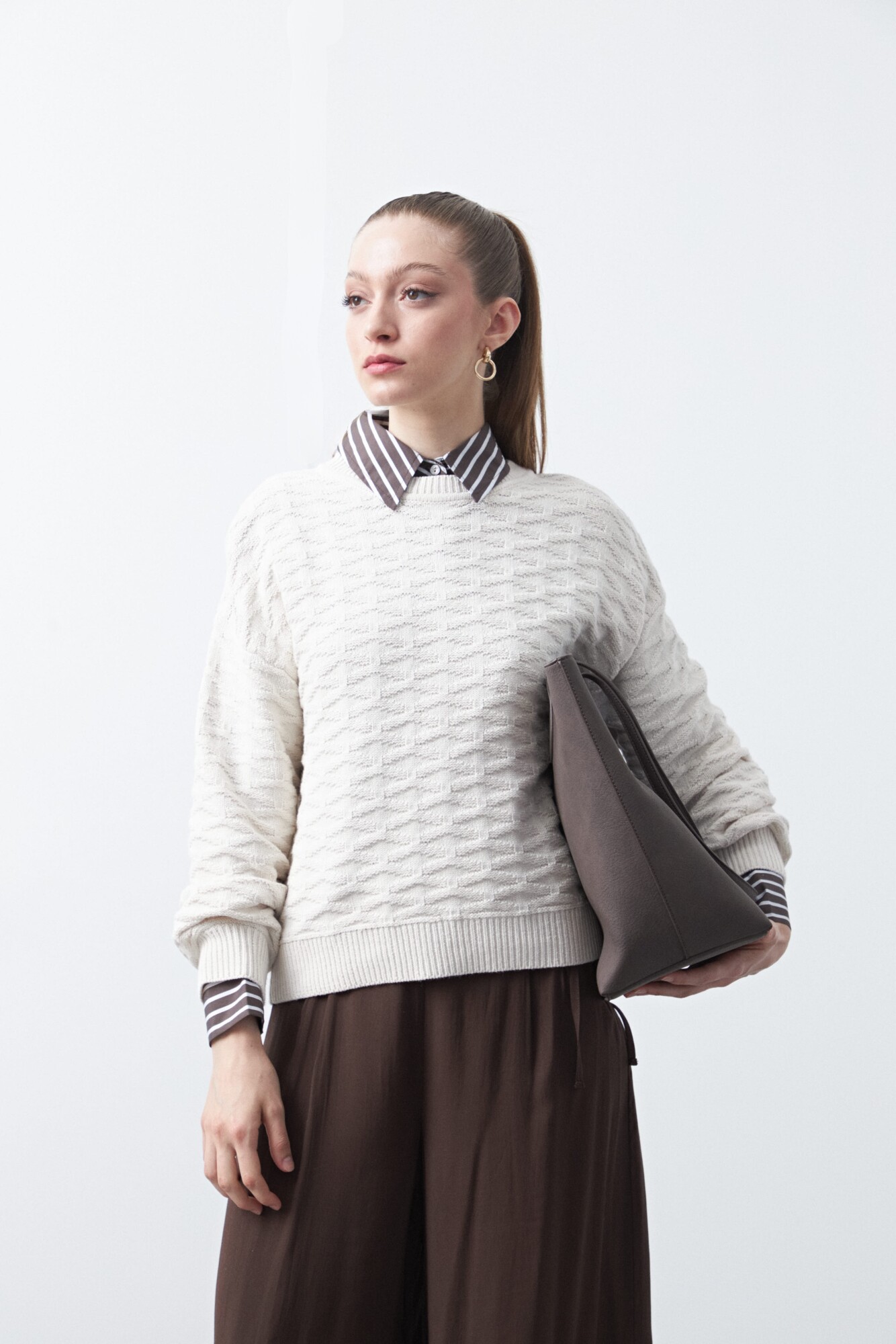 Sweater tramado de mangas abullonadas, de diseño delicado y textura protagonista que aporta profundidad visual al look. Las mangas con volumen sutil y puños elastizados equilibran estructura y comodidad, mientras que el tejido tramado suma un detalle distintivo que eleva este básico a una versión más trabajada. Ideal para looks urbanos prolijos o combinaciones más relajadas, es una prenda versátil que acompaña distintas ocasiones.