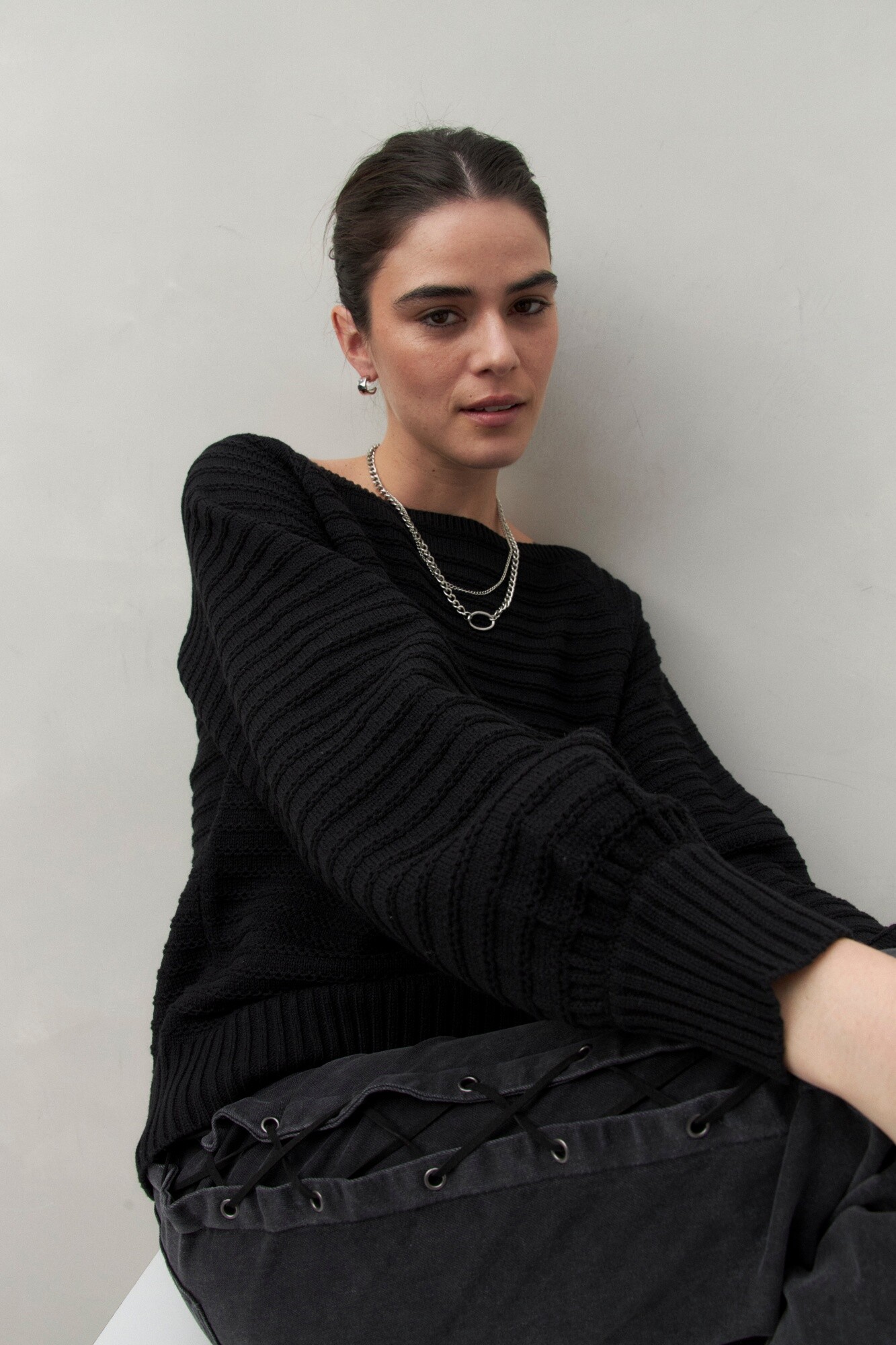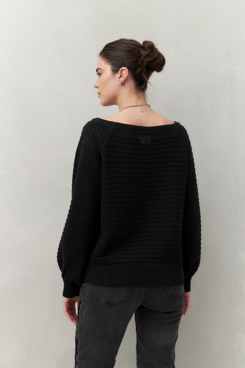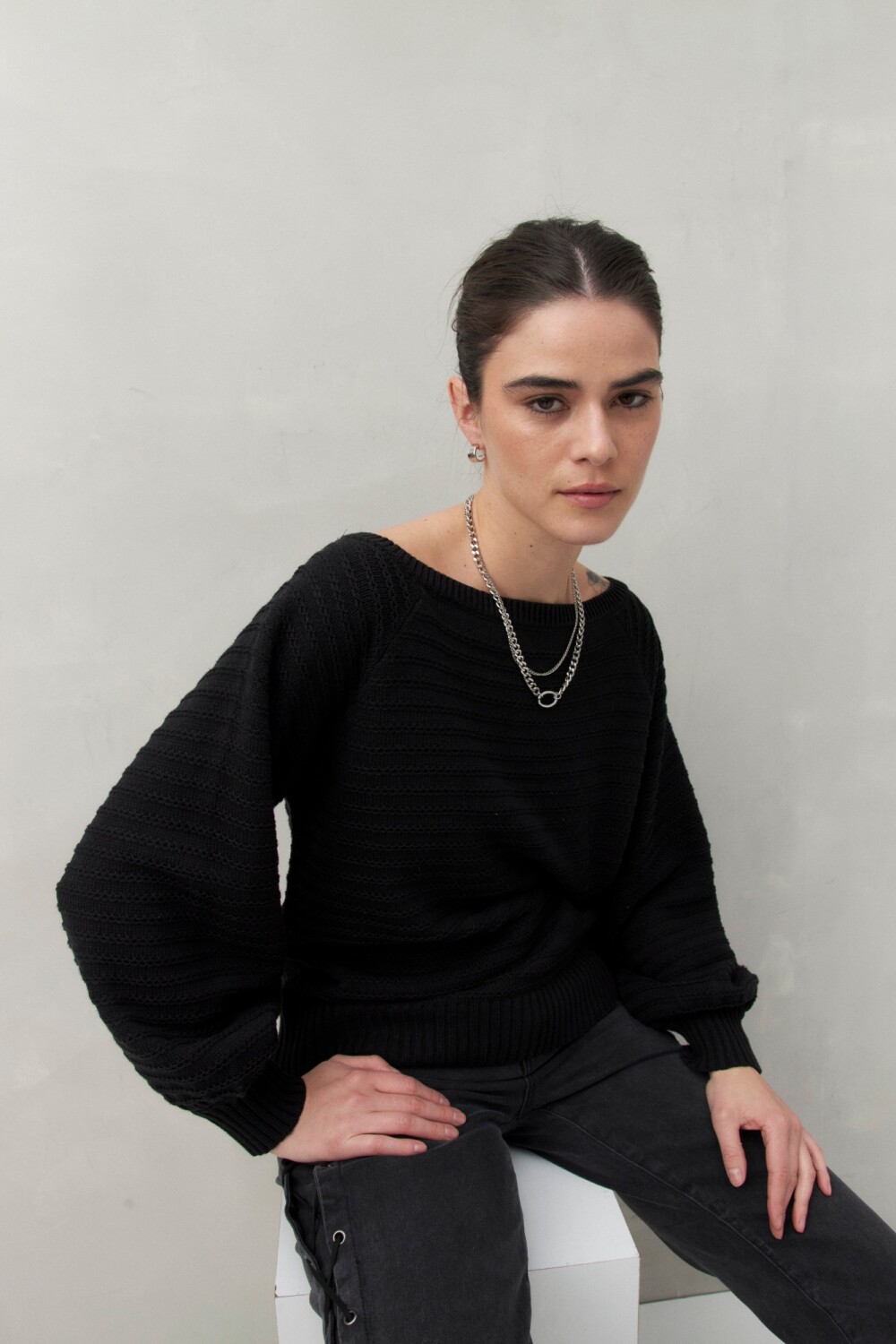 Sweater tramado de silueta relajada, con combinación de texturas en el tejido que aporta interés visual y un toque moderno. Presenta mangas abullonadas con puños elastizados que definen y estilizan la silueta. Con cuello redondo y calce cómodo, es una prenda versátil para sumar estilo a cualquier look casual.