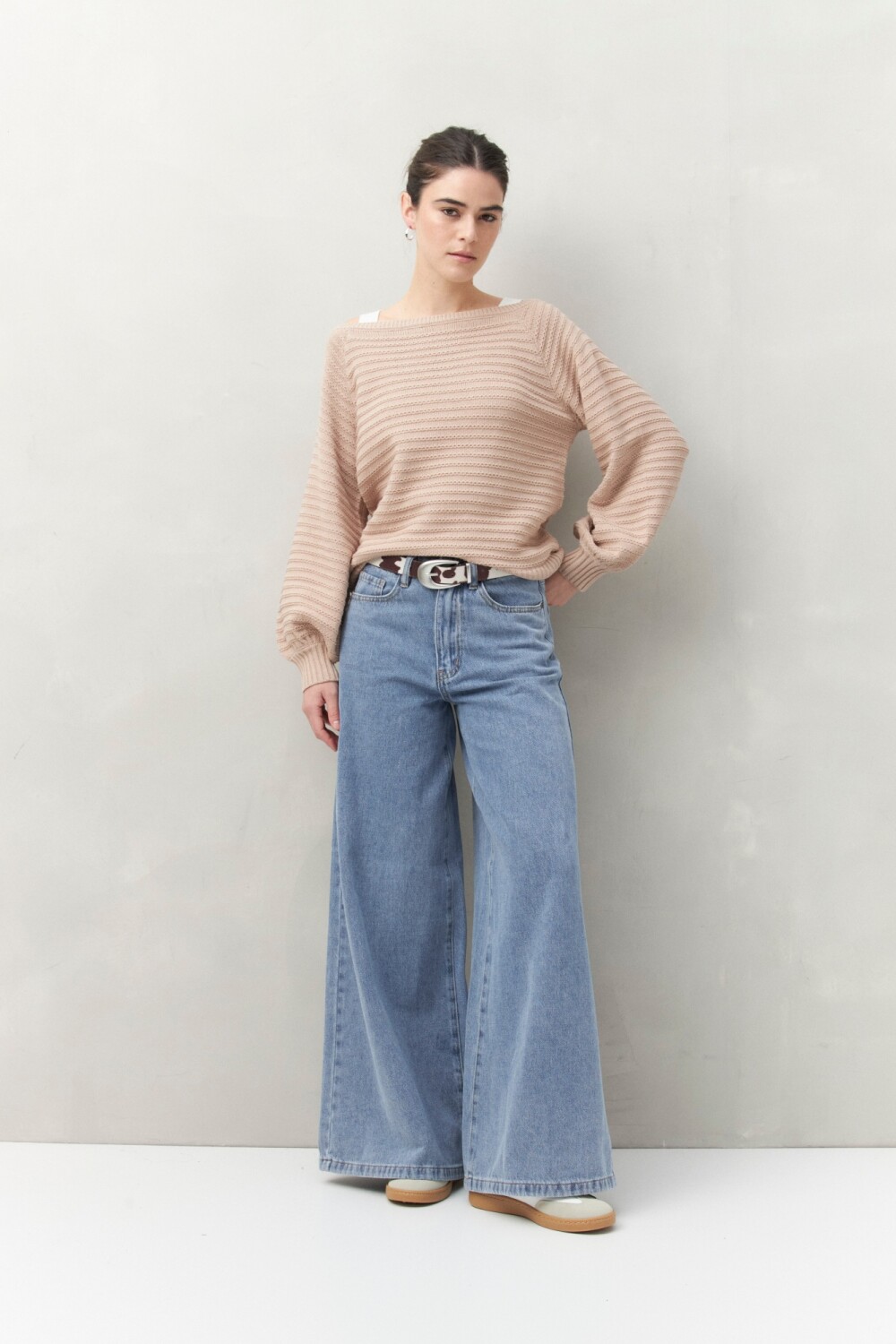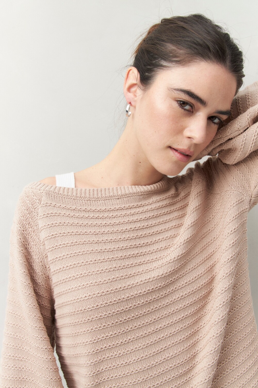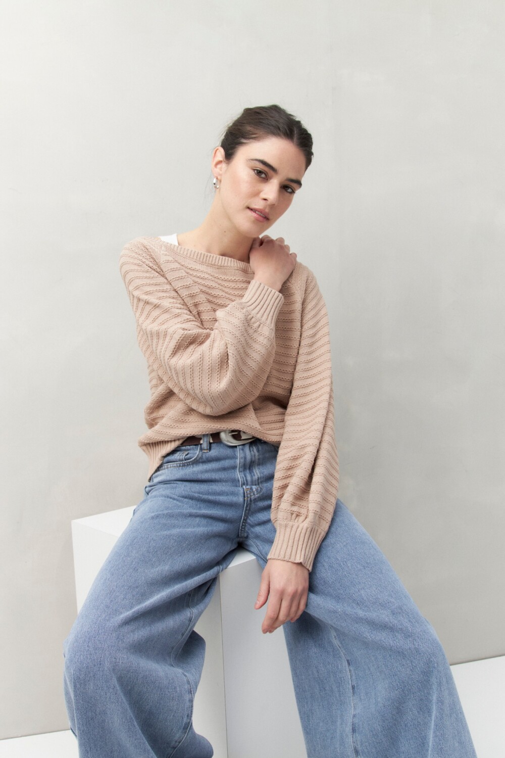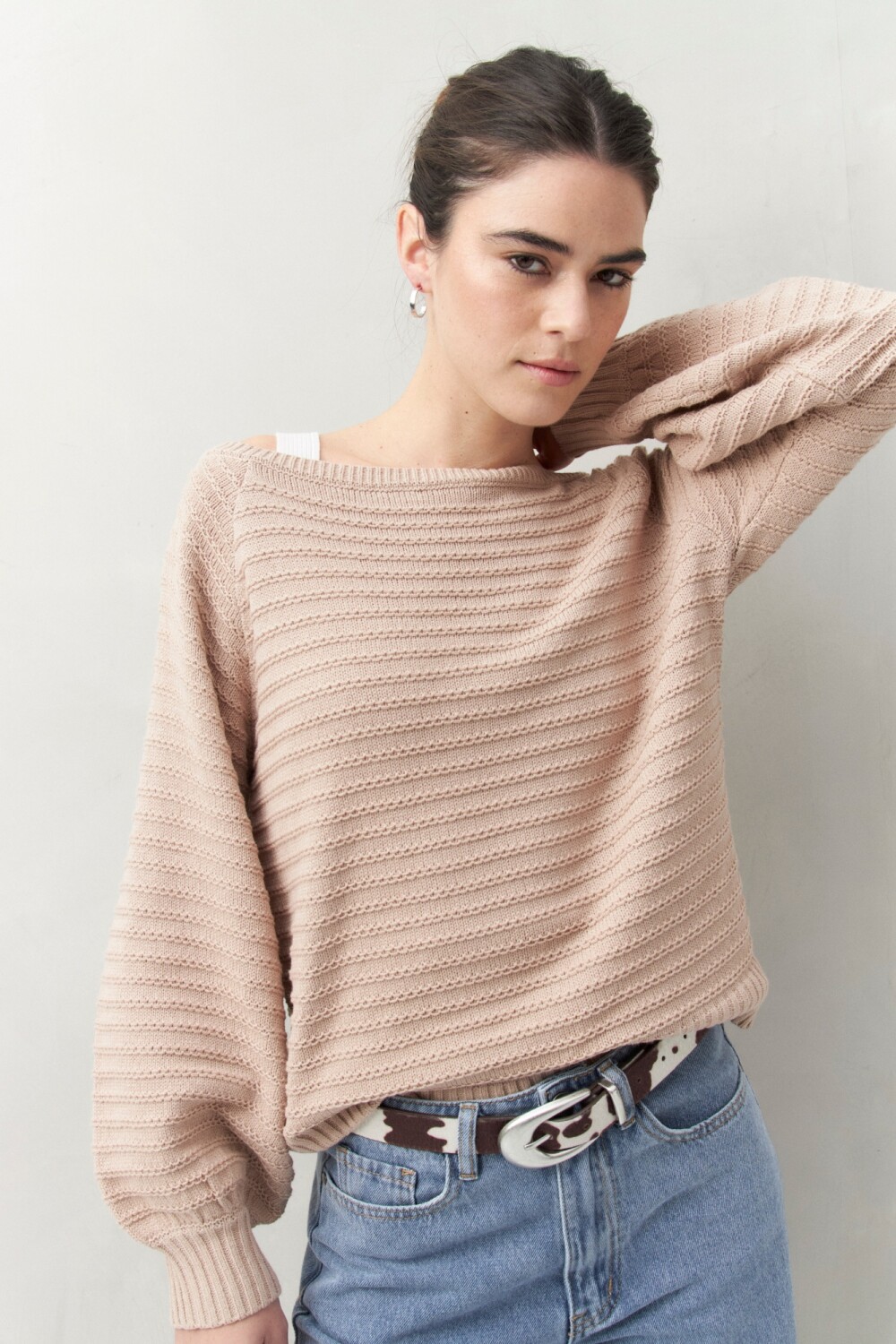 Sweater tramado de silueta relajada, con combinación de texturas en el tejido que aporta interés visual y un toque moderno. Presenta mangas abullonadas con puños elastizados que definen y estilizan la silueta. Con cuello redondo y calce cómodo, es una prenda versátil para sumar estilo a cualquier look casual.